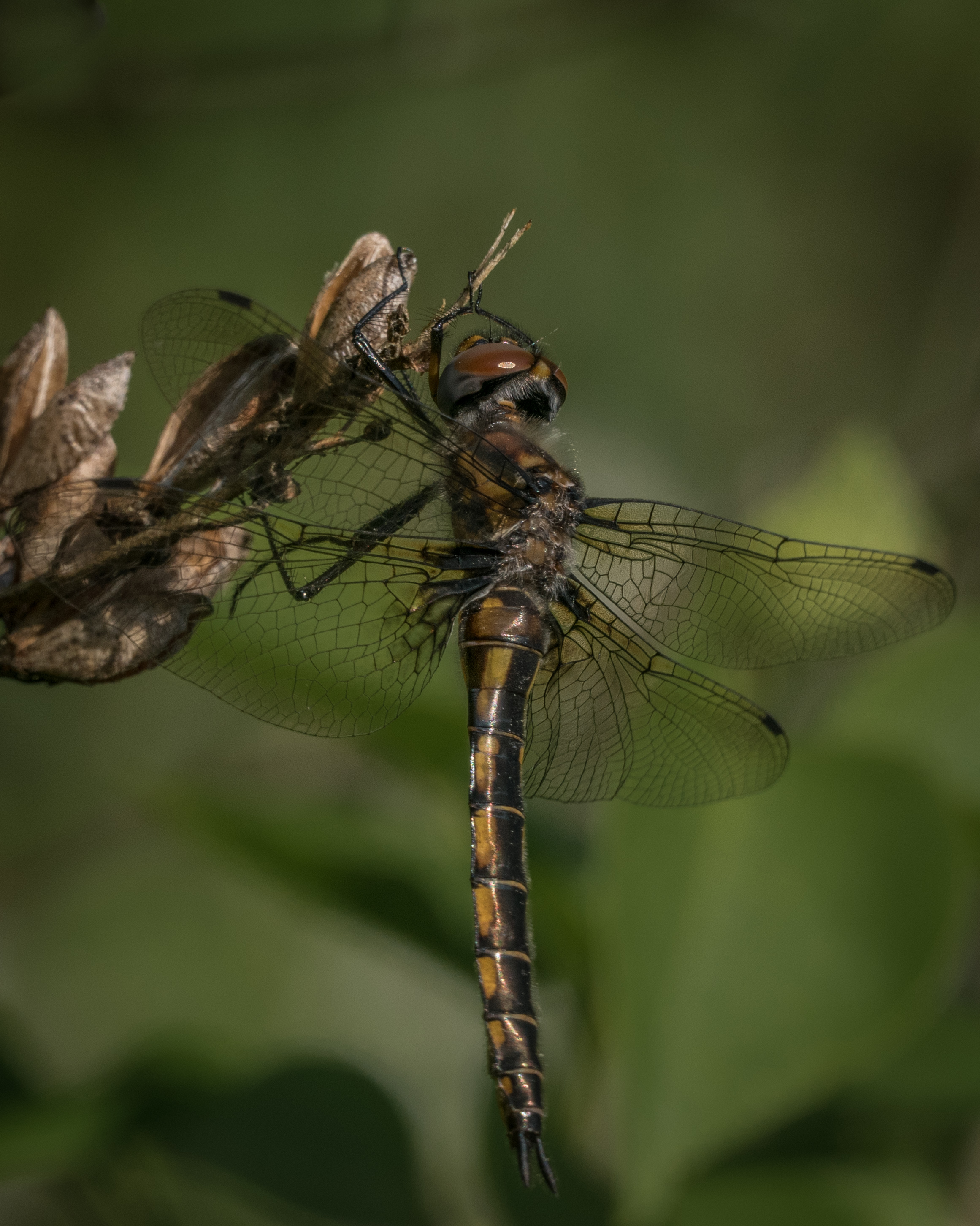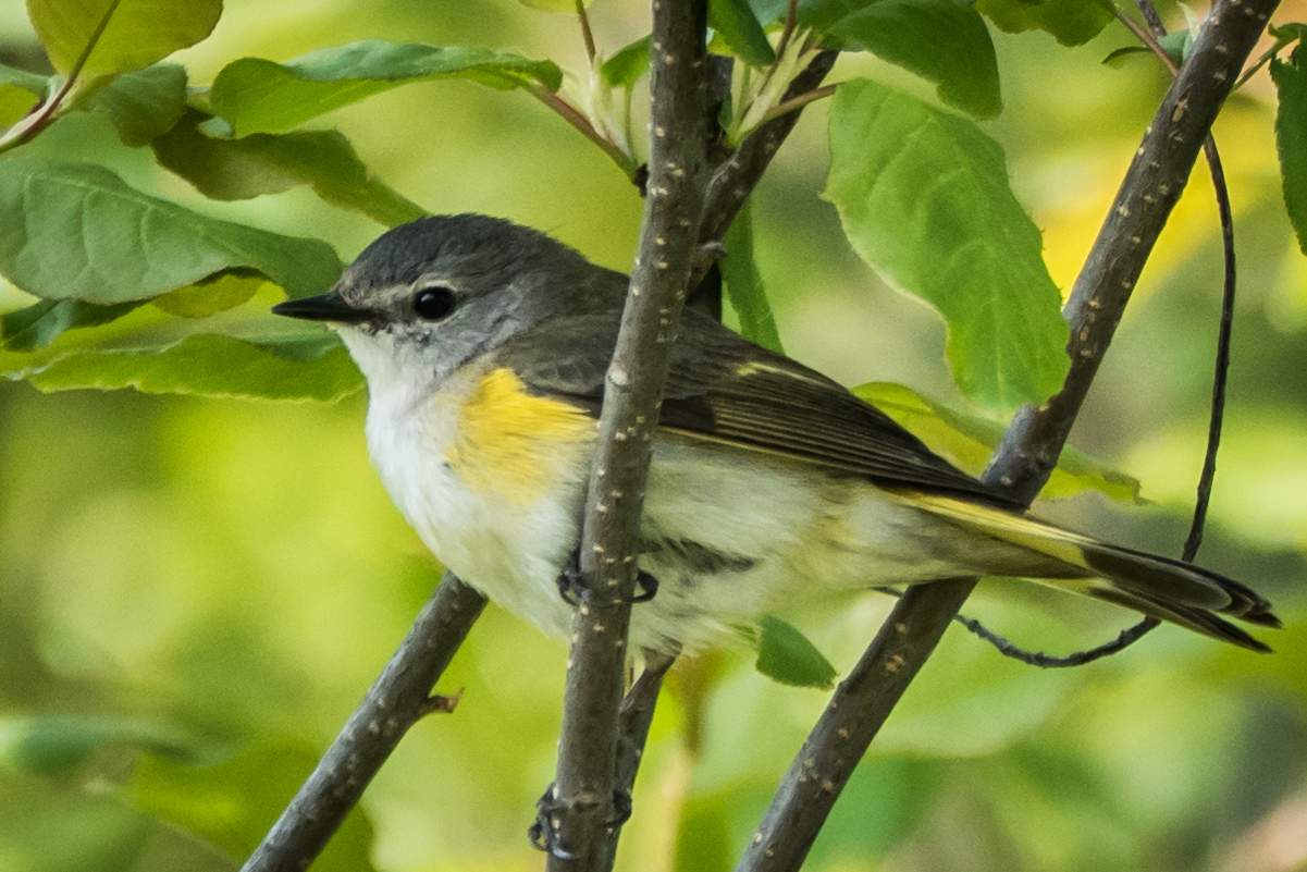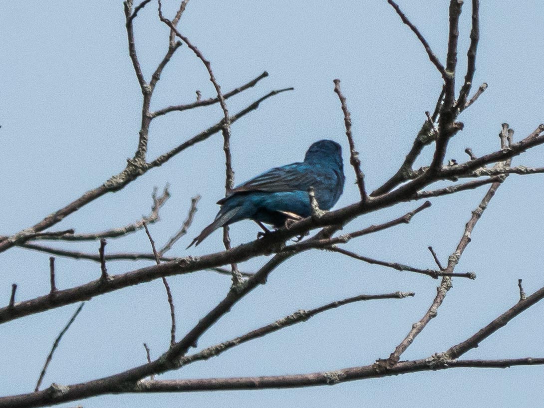 The Indigo Bunting (along with many butterflies, Peacocks, several ducks) displays its colours using Structural Colour instead of Pigment Colour, making it a challenge to photograph. The above is my best, shot at long range with my 100-300 mm (200-600 mm equivalent) lens, not the sharpest in the world. Like last year the birdie didn’t hang around for long. As soon as I shut the truck engine off, the bird jumped off of the branch, folded its wings and plunged into a leafy thicket. Bye bye birdie!