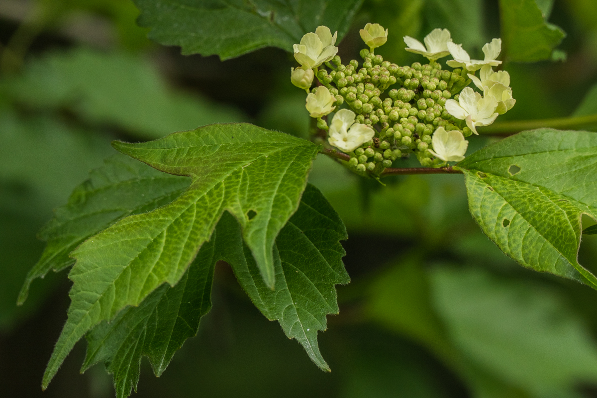 The Highbush Cranberries are starting to bloom with the typical (Viburnum) sterile attractor blossoms surrounding the smallish fertile blossoms.