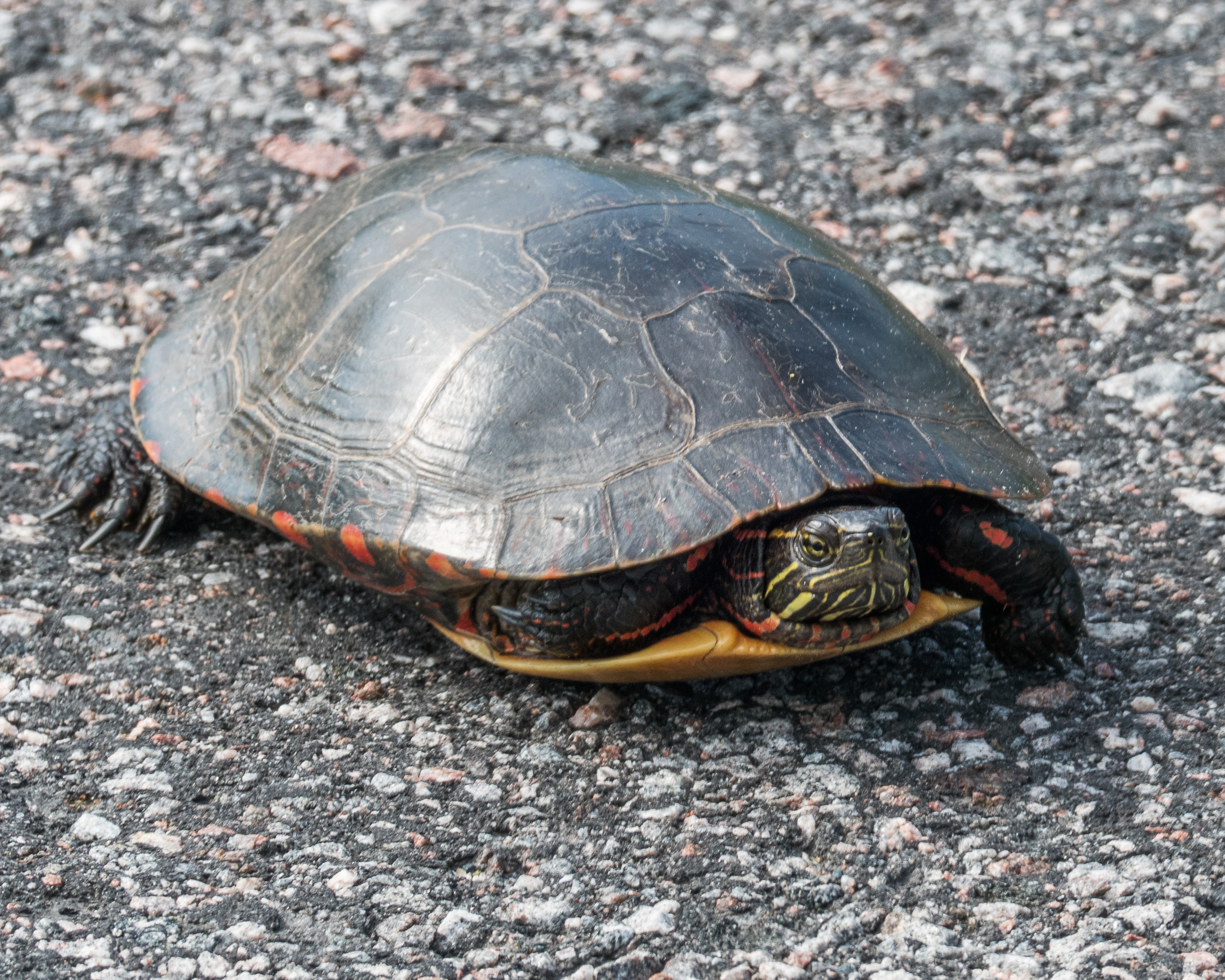 All turtles,( Spotted, Blanding’s, Painted and Snappers) are nesting nowadays, often on the shoulders of roads.  Lady Snapper :