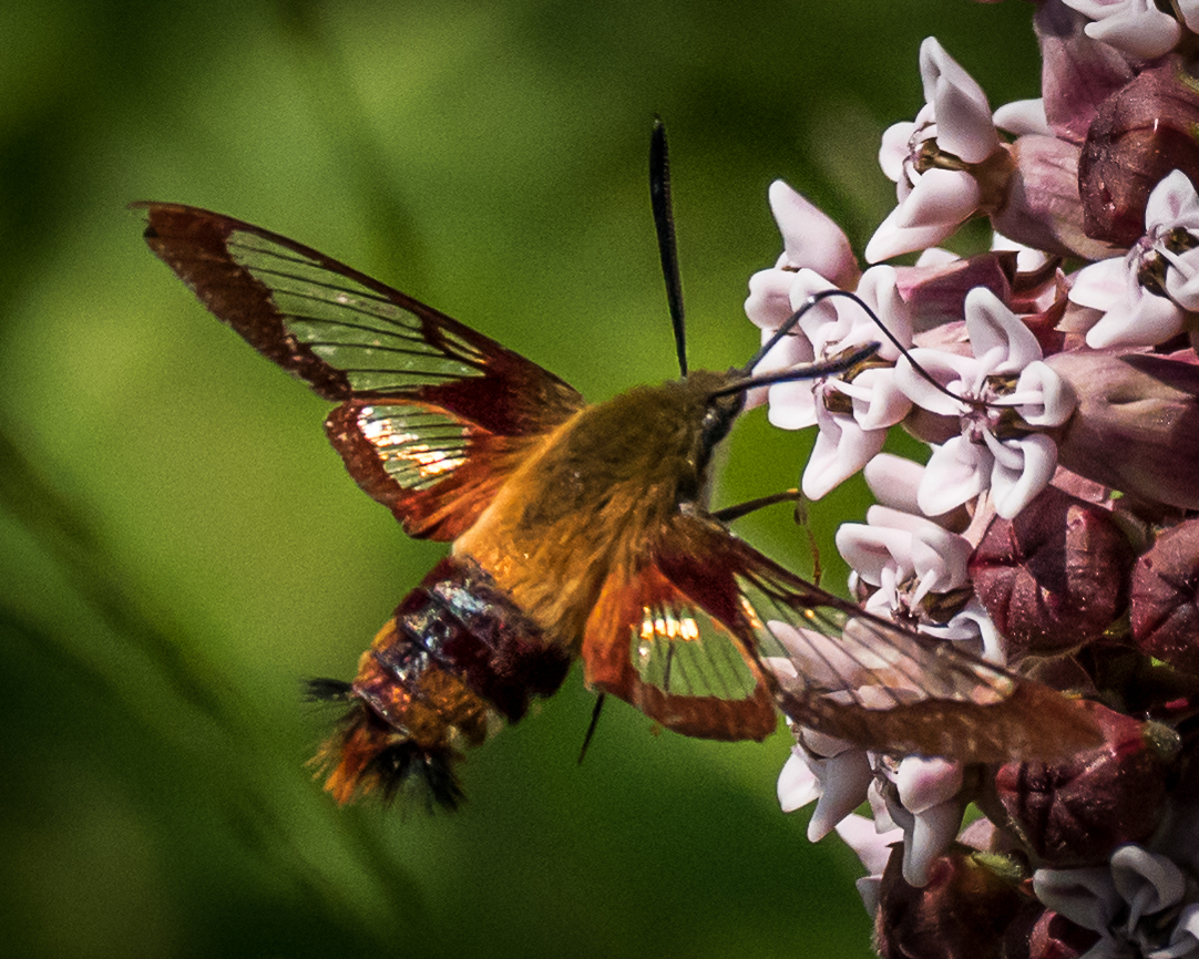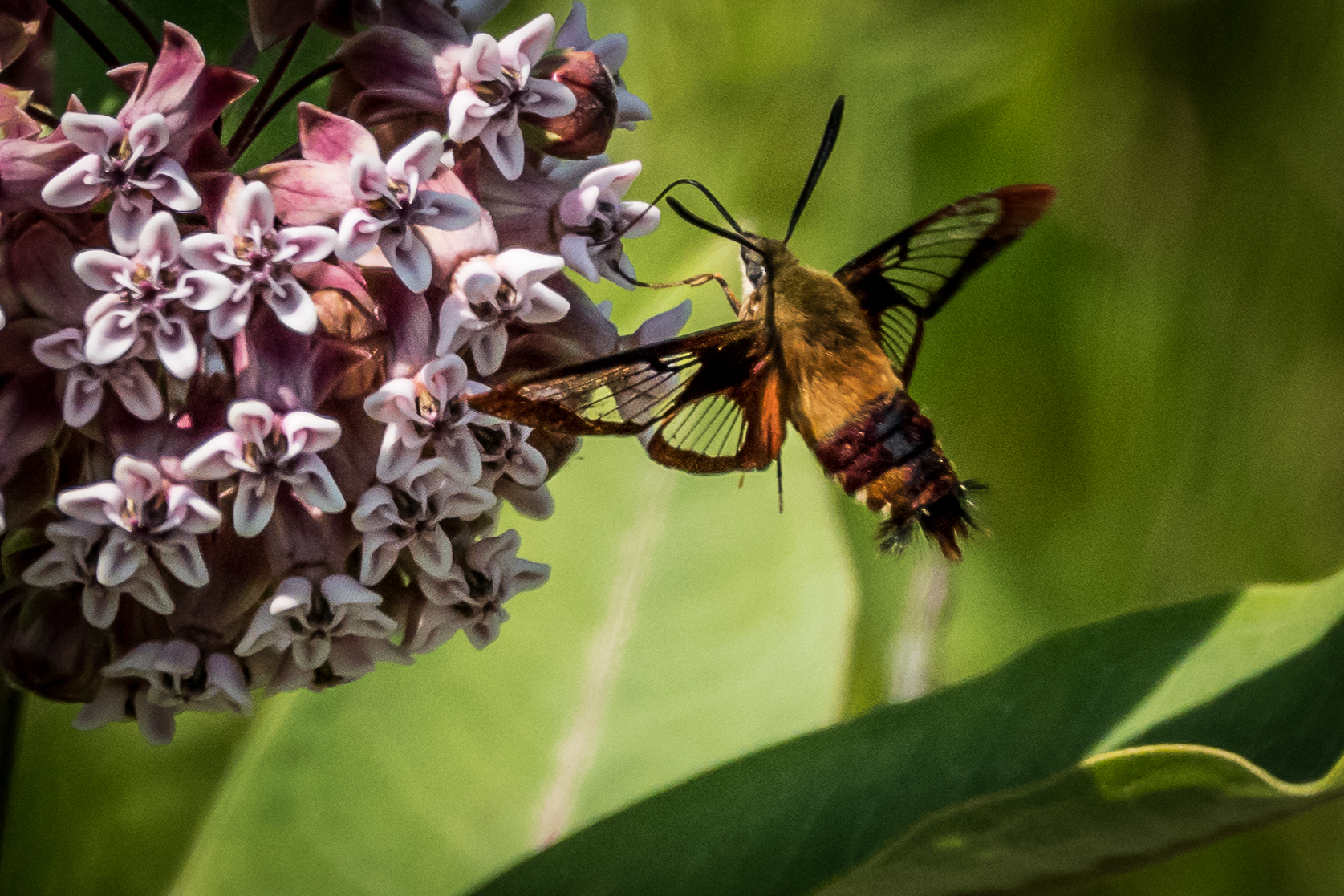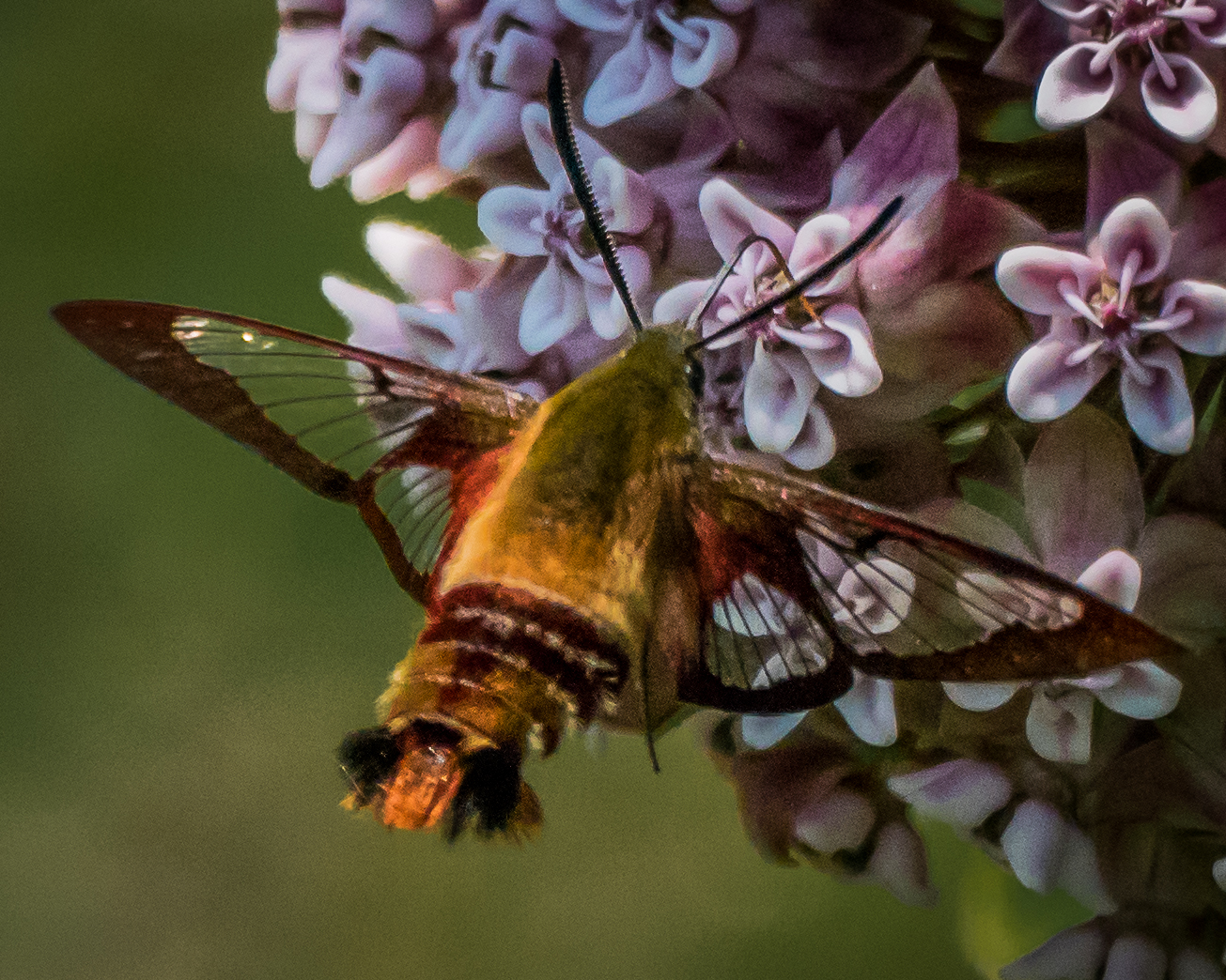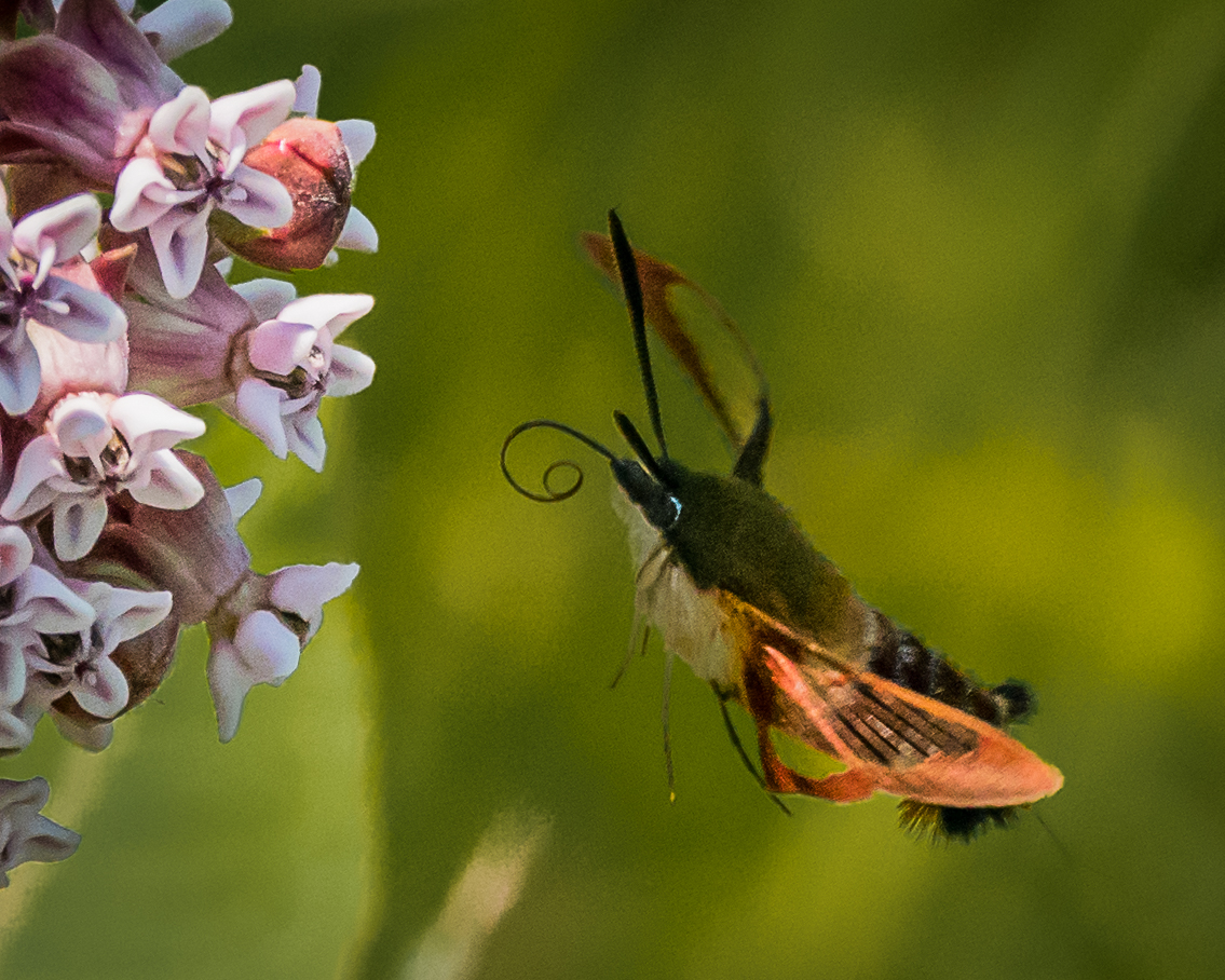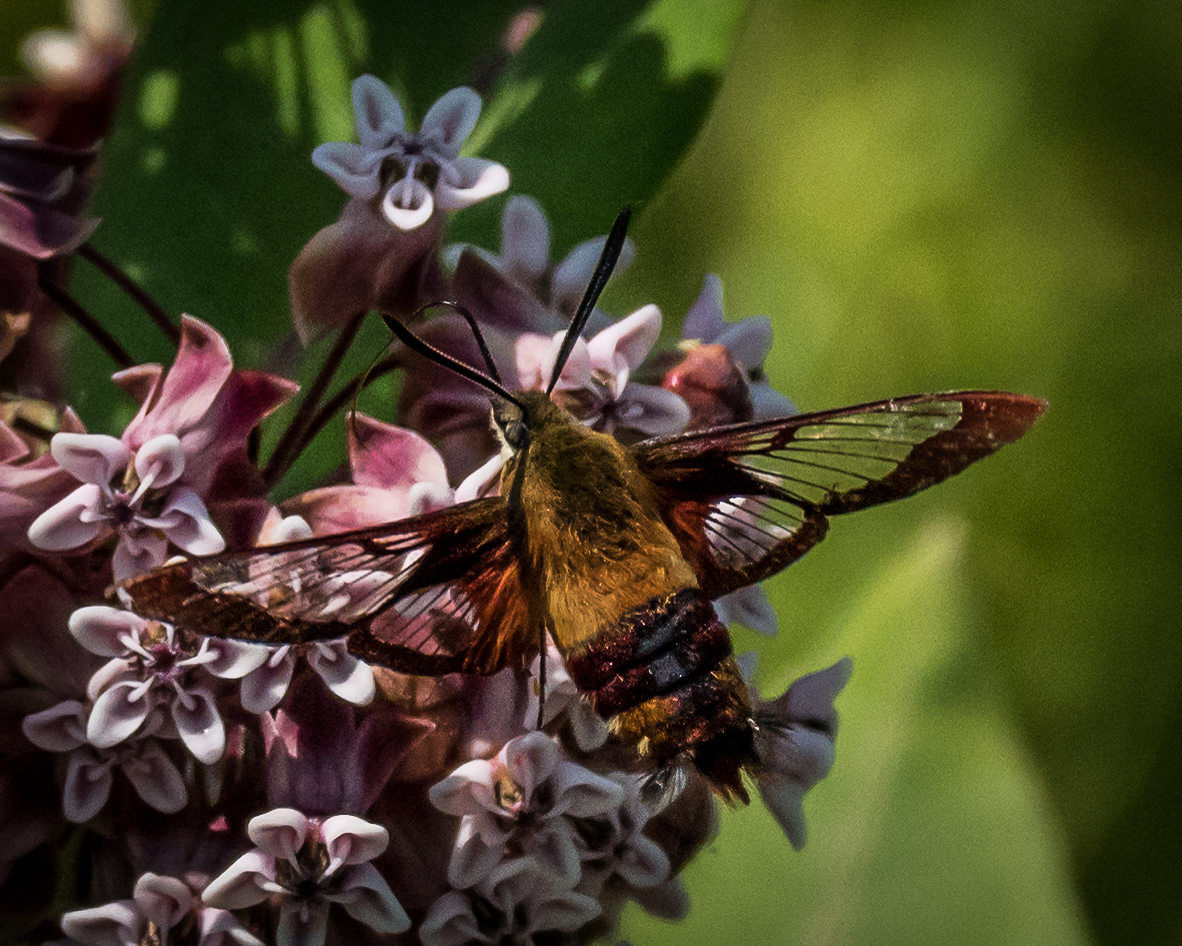 On June 30th I spent some time at the milkweed patch observing the various critters who came to feed. It as warm with no breeze so there were lots of Hummingbird Clearwing Moths and several other butterflies and beasties. Lots of images here!