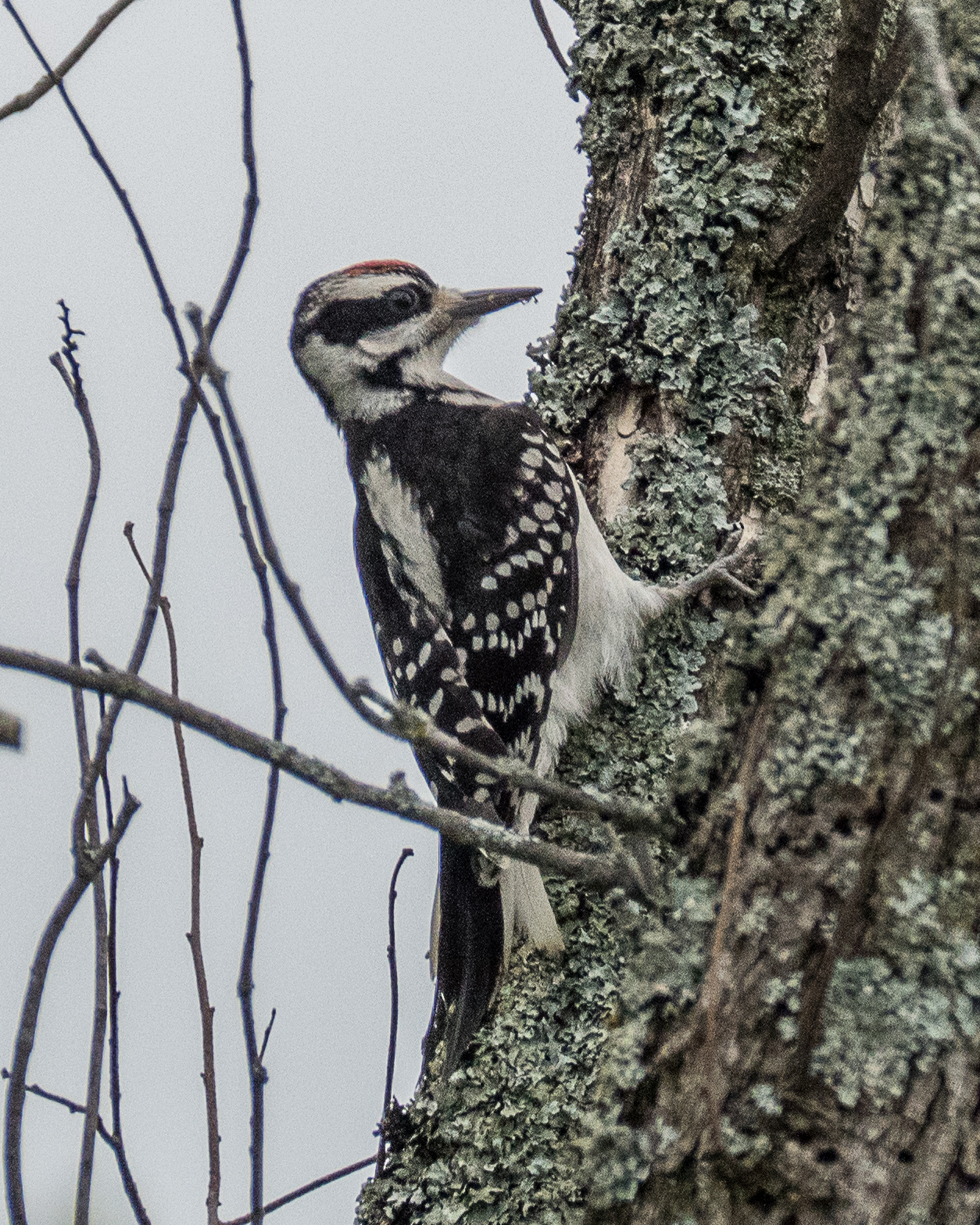 Two Hairy Woodpeckers rummaging for bugs under the bark of dead elm trees…