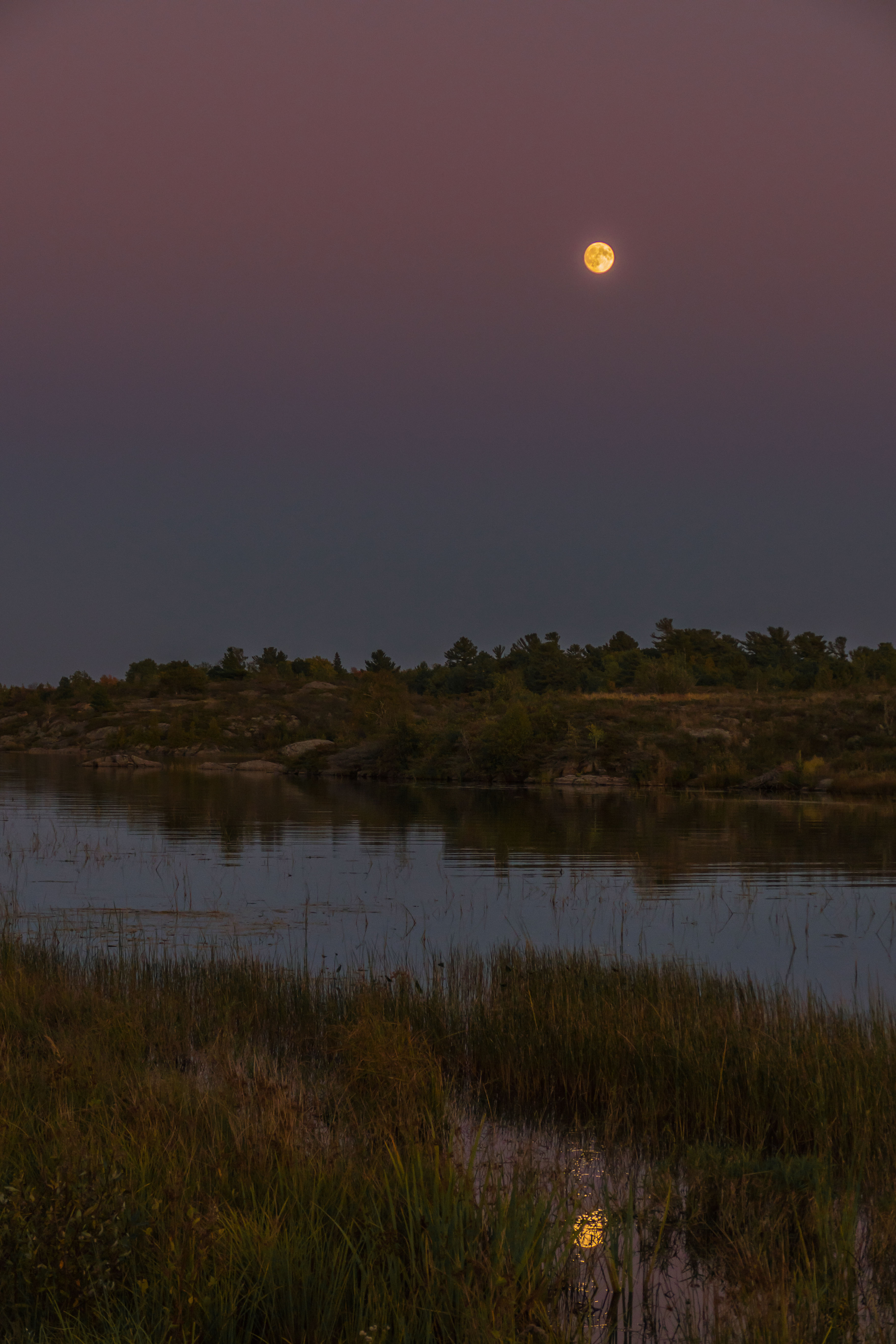 I watched the evening light change as the almost full moon rose over Byng Inlet. Although I wanted to take some “calibration photos” in preparation for the Sept 26 apparition I ended up chatting with old friends most of the time, whilst looking over their shoulders at the event. I did take a few pix.