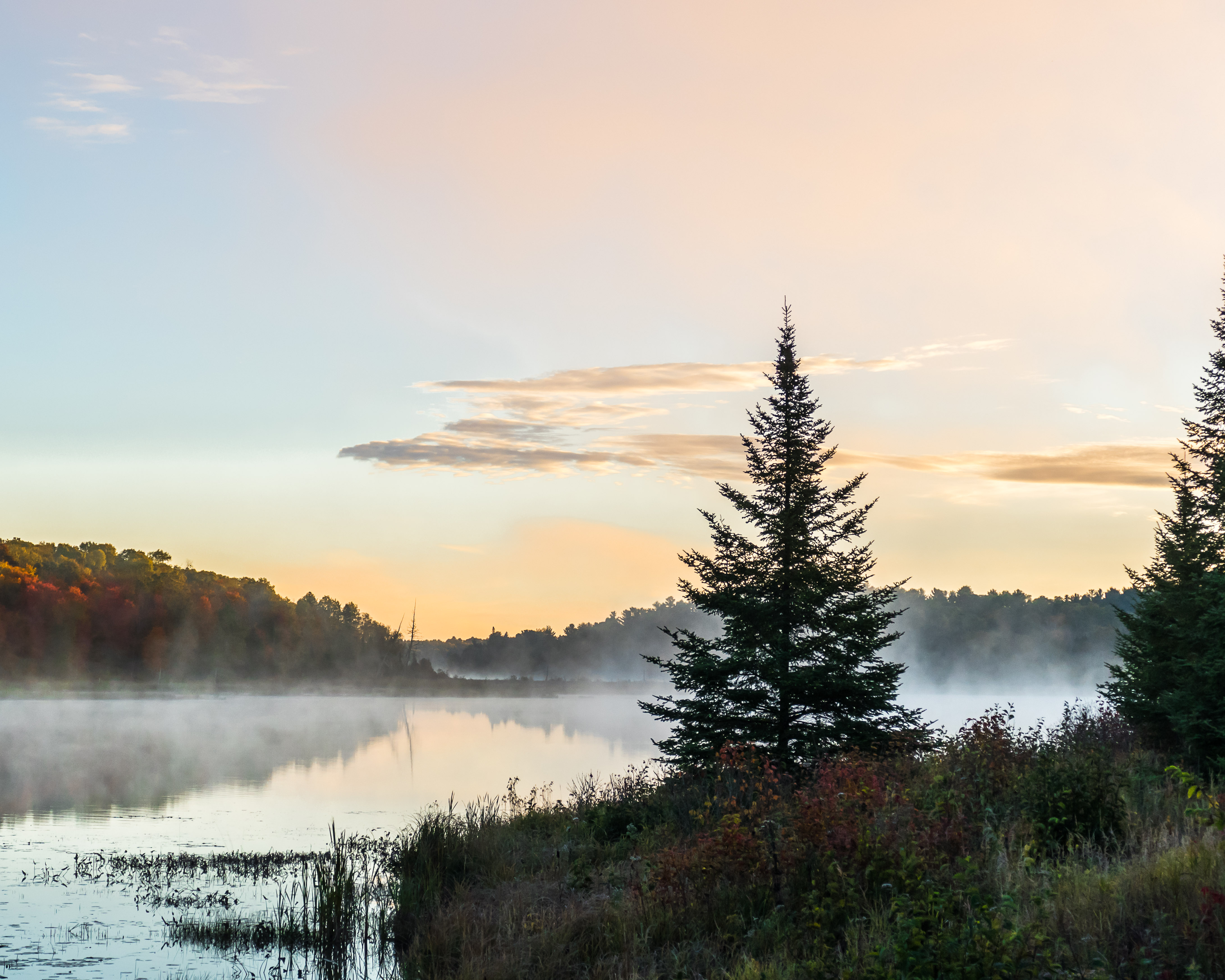 I don’t use the word “compose” the way photography texts do, (with all of those “rules”!). Rather I tend to build the picture. I usually find lots of mini-images in a scene that I want to somehow put together. (The result of a diagnosed “over complex mind”?) In the top image I stopped to ask myself what were the excitements in the scene. The first thing was the pink mist curving down to that far point where the skyline dips down to almost kiss the reflection of the sky. Then as the sun rose, the dramatic colouration of the left horizon began to become dominant. So I moved around a bit so that I could “compose” the image with at least those two elements. Expert commercial photographers would probably have posted the image that I took about 3 minutes before this one. But I prefer the above ;… maybe because I enjoy the dynamic of moving my eyes from the left horizon to the osculation of horizon line and sky reflection. The three spruce trees are a bonus! Especially when I pull back a bit.