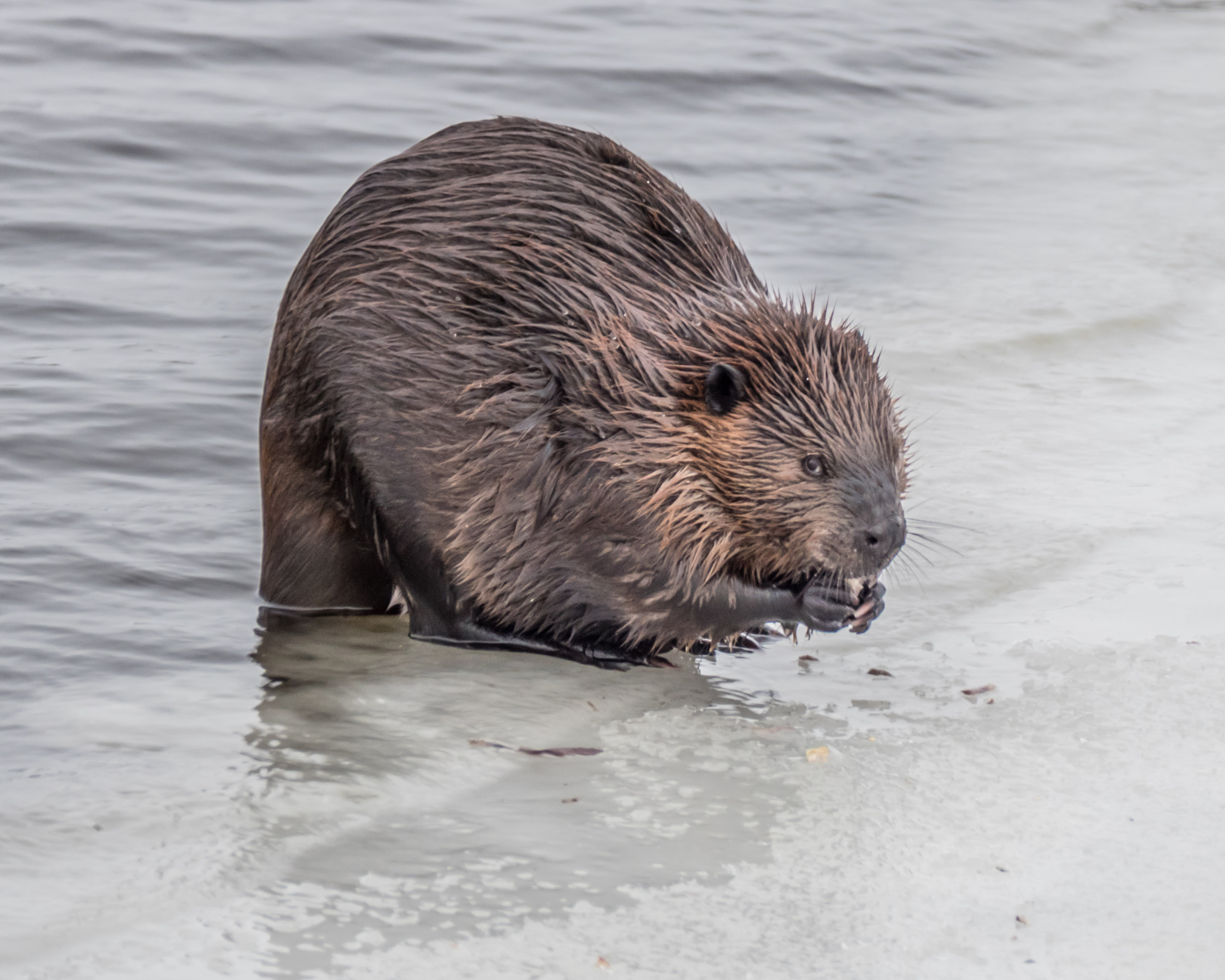 The next day a big beaver came out on the shore ice eating freshly harvested water lily roots. It popped up and down several time, checking me out occasionally. Yum Yum.