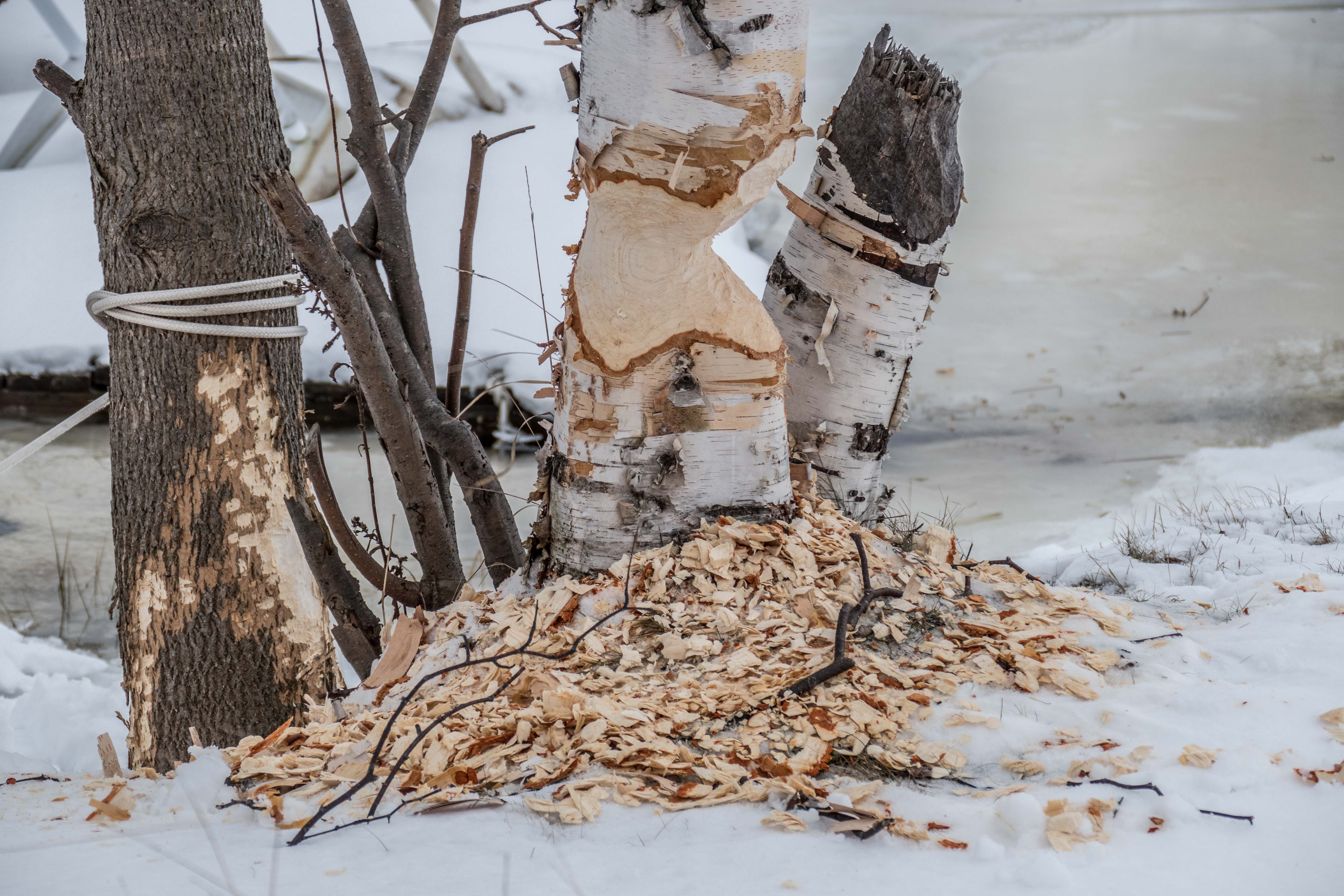 The busy beaver featured in two previous posts severed the birch tree but it hung up in the adjacent ash tree and a pole wire.