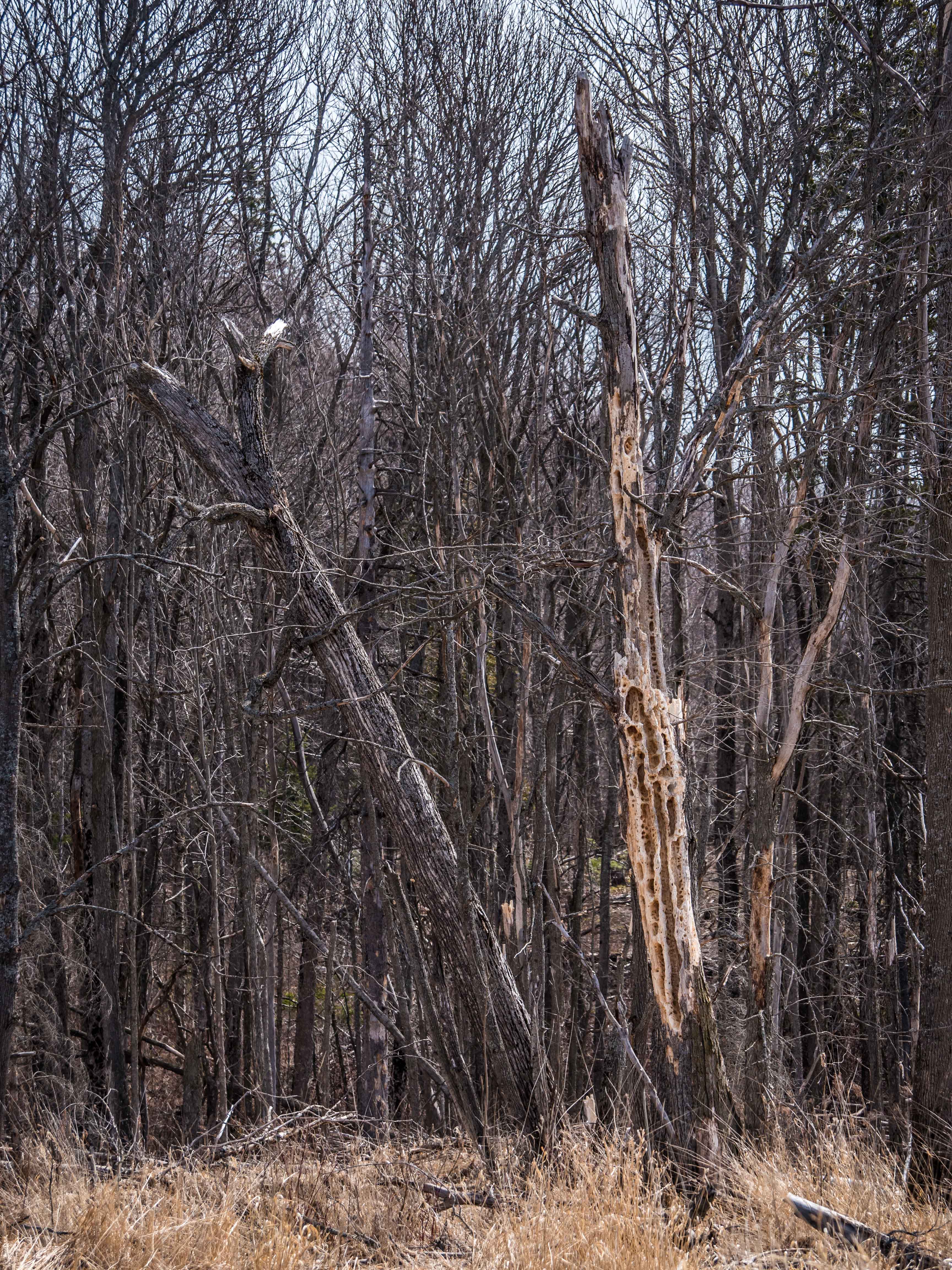 A storehouse of grubs for Pileated woodpeckers! Trees that have been dead for about 5 years seem to be optimum.