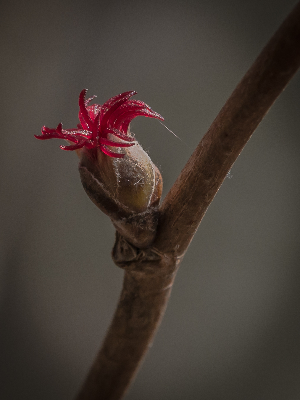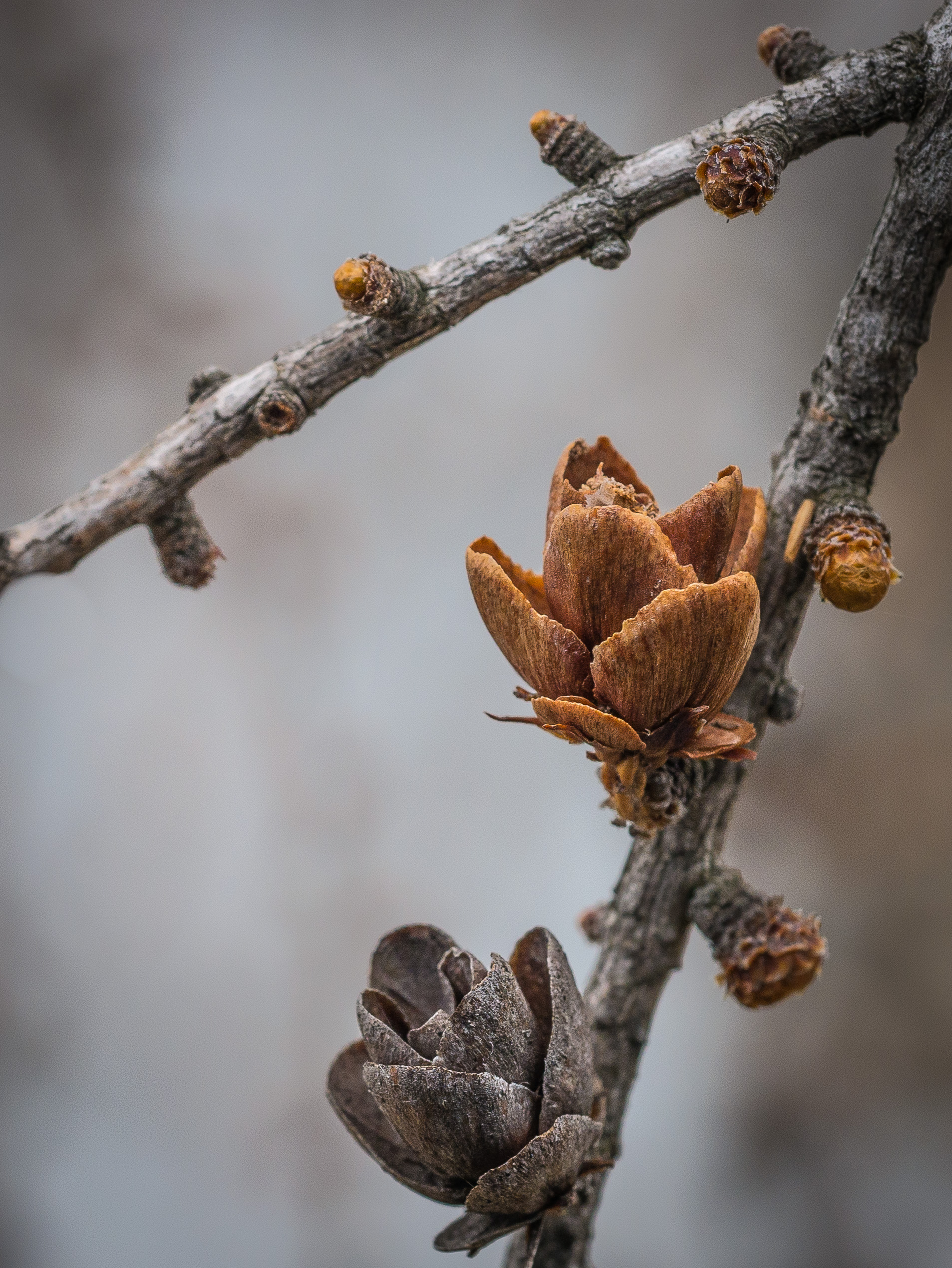 Finally, here are some remnant fruiting heads of the wild hazelnut. You can see a bit of the nut shell in the right capsule. Each nut is formed at the base of one of the pink tendrils (in the last post’s photo).