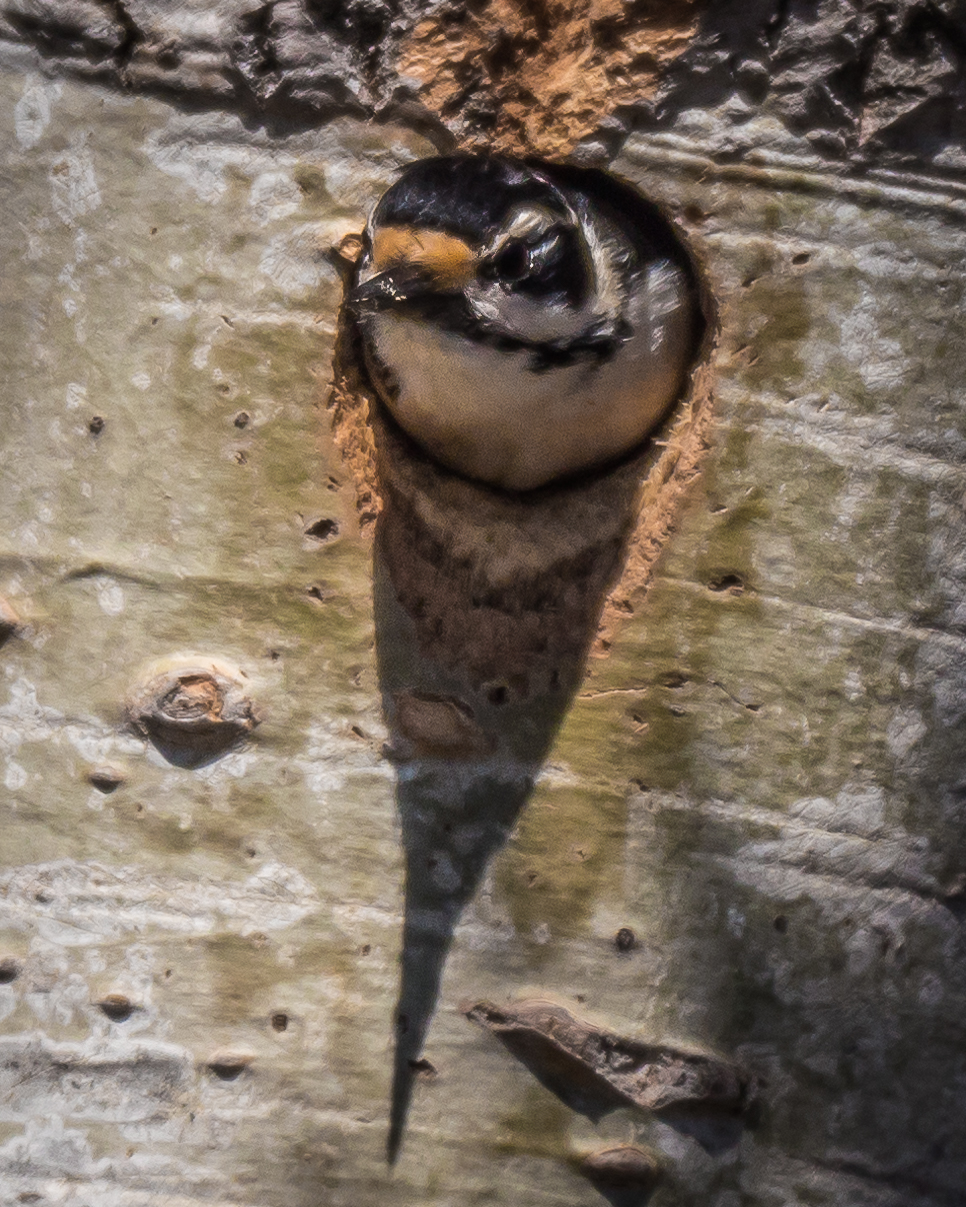 Remember that Hairy Woodpecker’s nest … a few weeks ago? I saw the male flitting around it and then saw this female emerging to fly away. I don’t know why the “moustache” is so orange coloured.