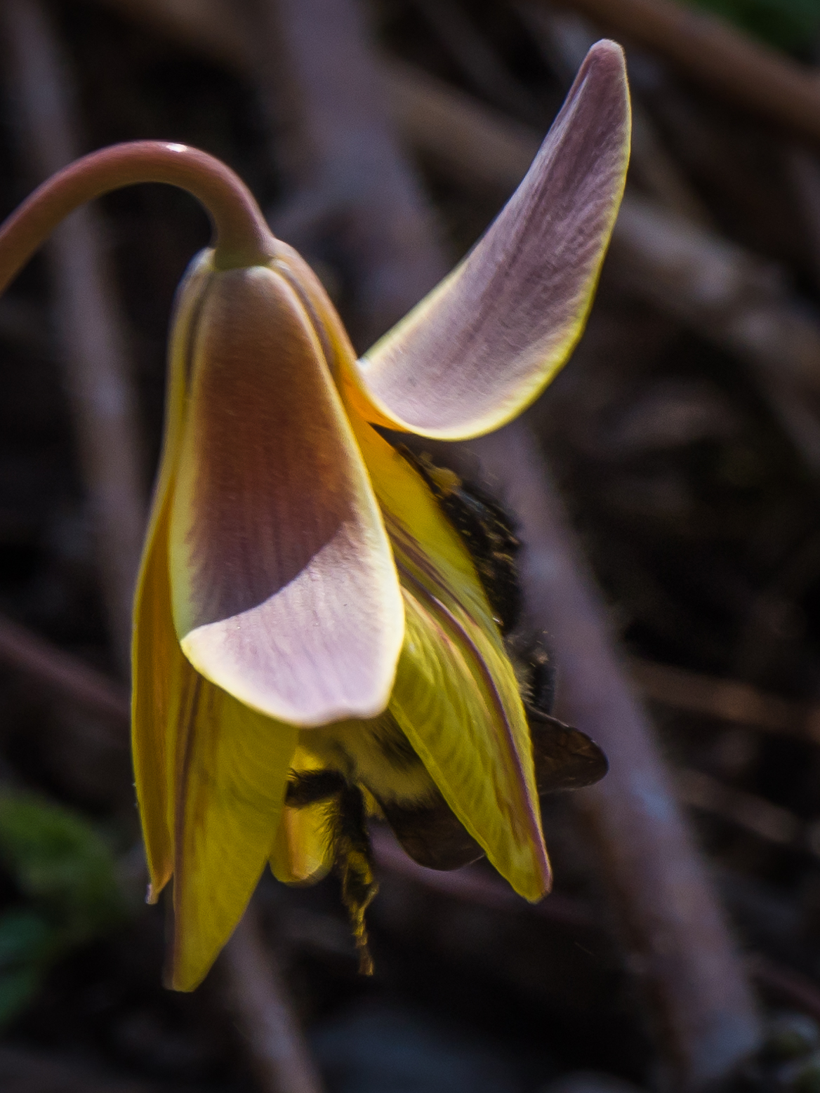 Earlier I had noticed that some of the Trout Lilies had well developed seed heads and wondered about pollination. Yesterday we (finally) saw this bumblebee quickly visiting Trout Lilies in clumps.