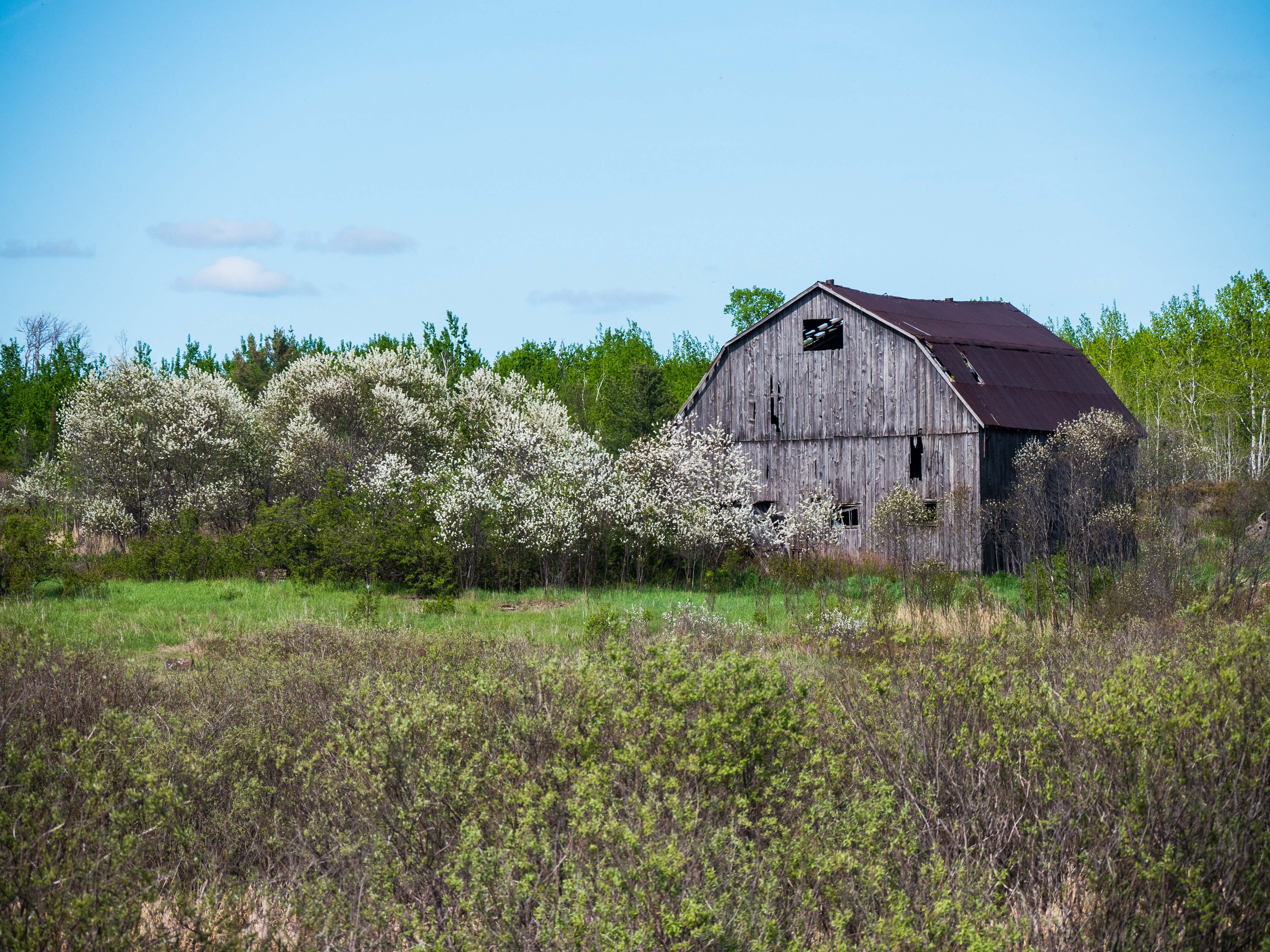 This barn with pincherries in bloom is on Hartley Bay Road, west of Hwy 69, just north of the French River.