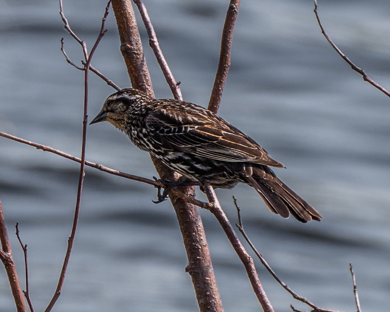 Then a female Redwing Blackbird perched on a Tag Alder over the water, intent on catching a few morsels.