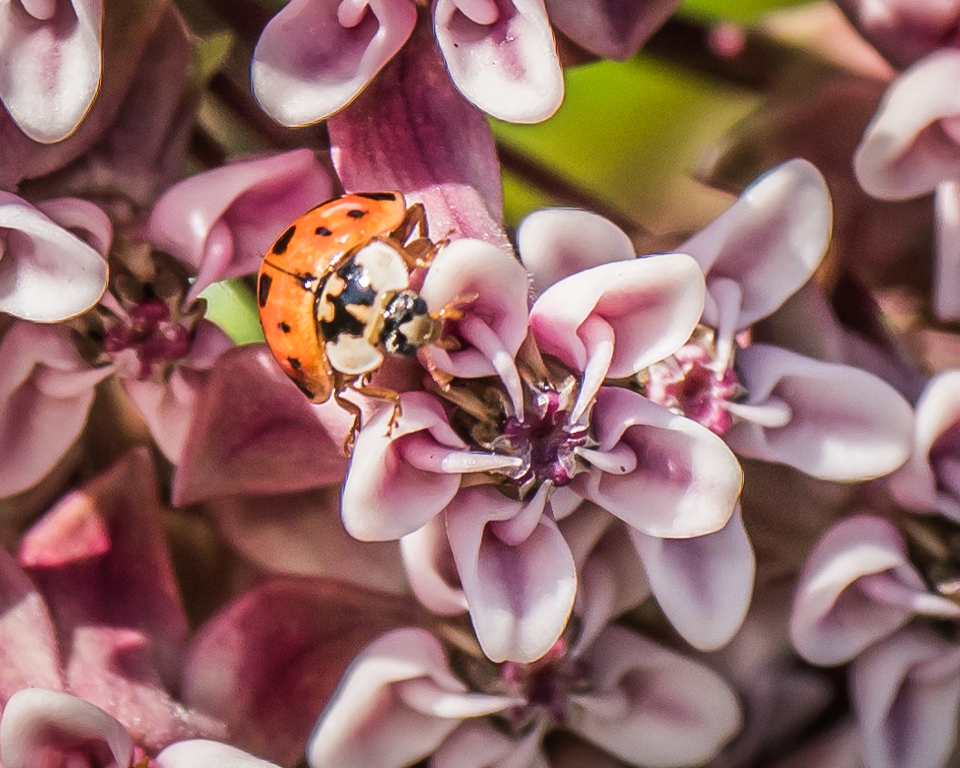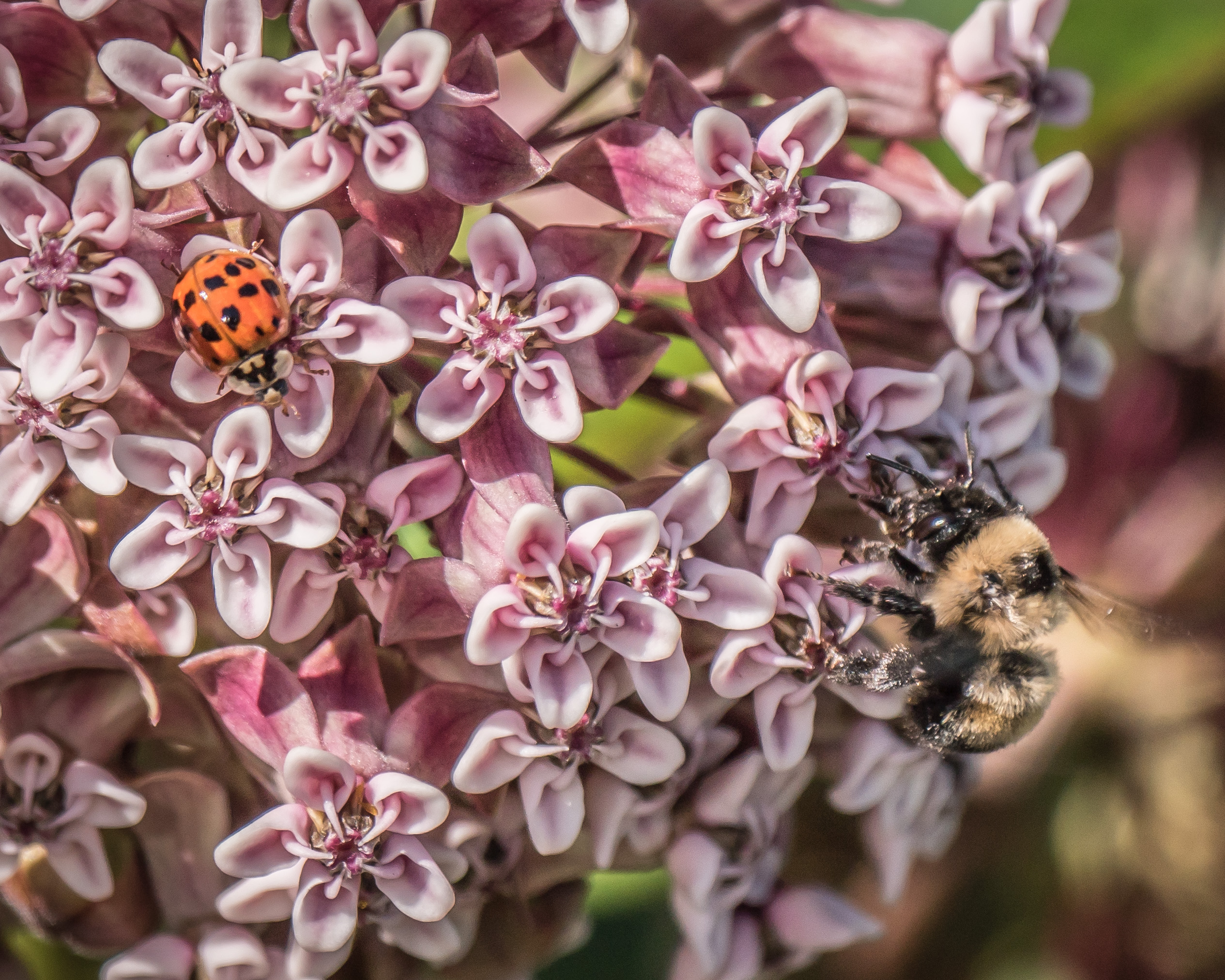 Those milkweeds are usually a good spot to see Monarchs and Clearwings. Not so this year. No Monarchs butterflies, one Monarch Caterpillar. Lots of Clearwings for two days. Now lots of bees and Asian beetles (confused with ladybugs).