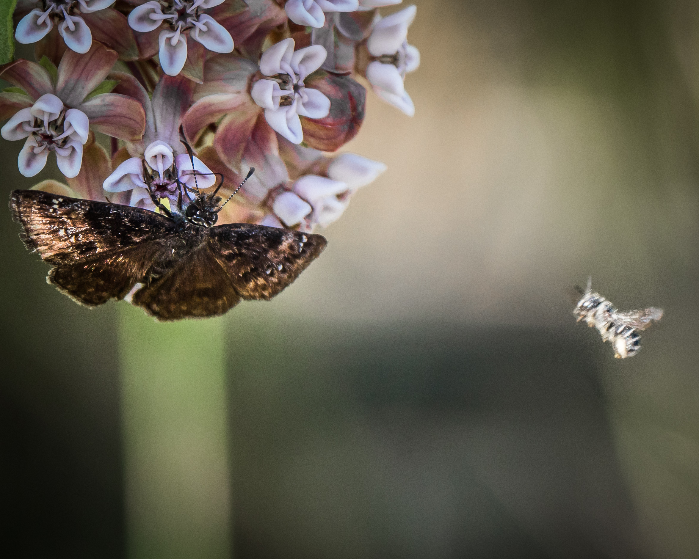 Little bee picks up the shaft of sunlight illuminating part of the butterfly’s left wing.
