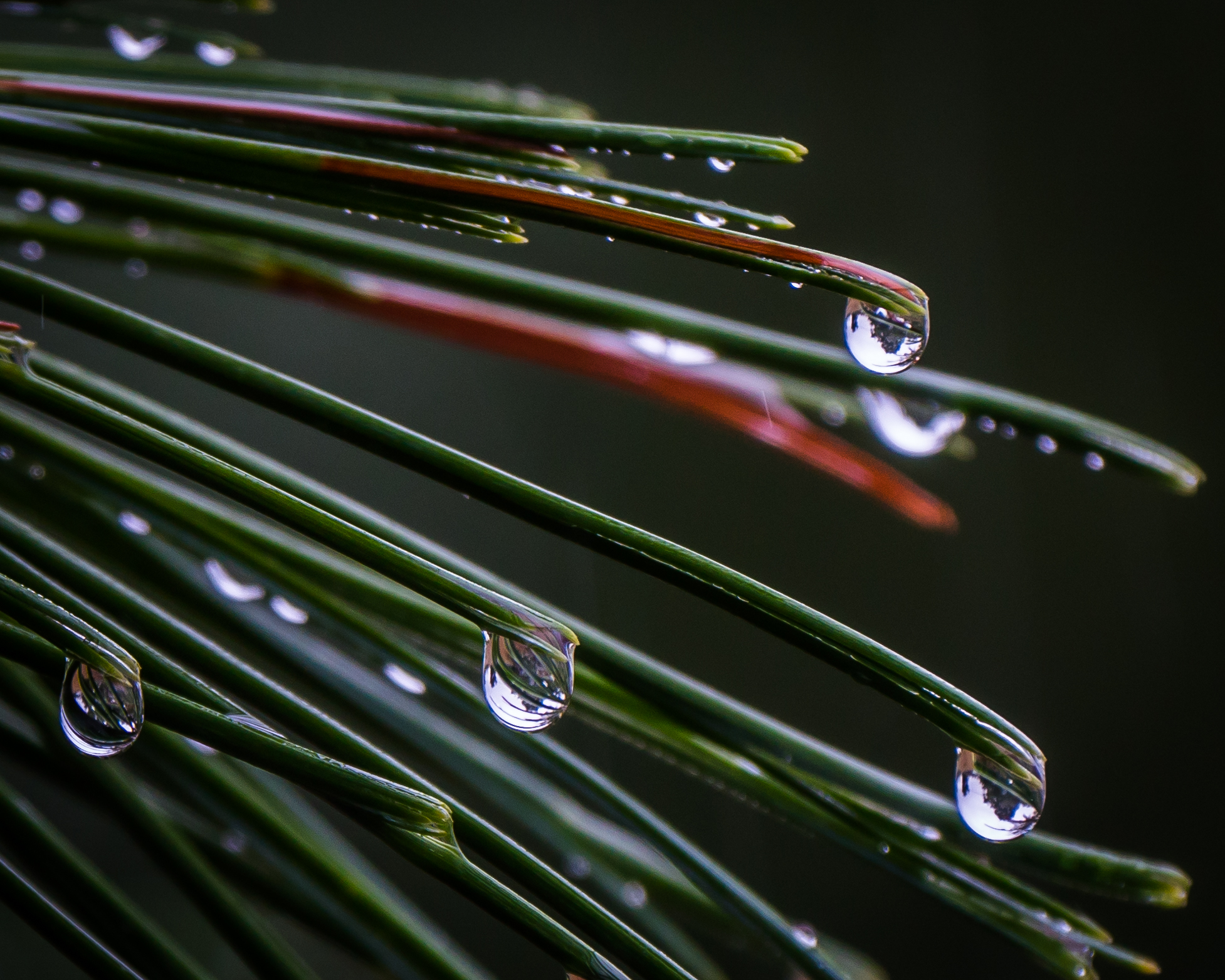 Red pine needles are very firm, hold up under the drops.  White pine needles behave quite differently…