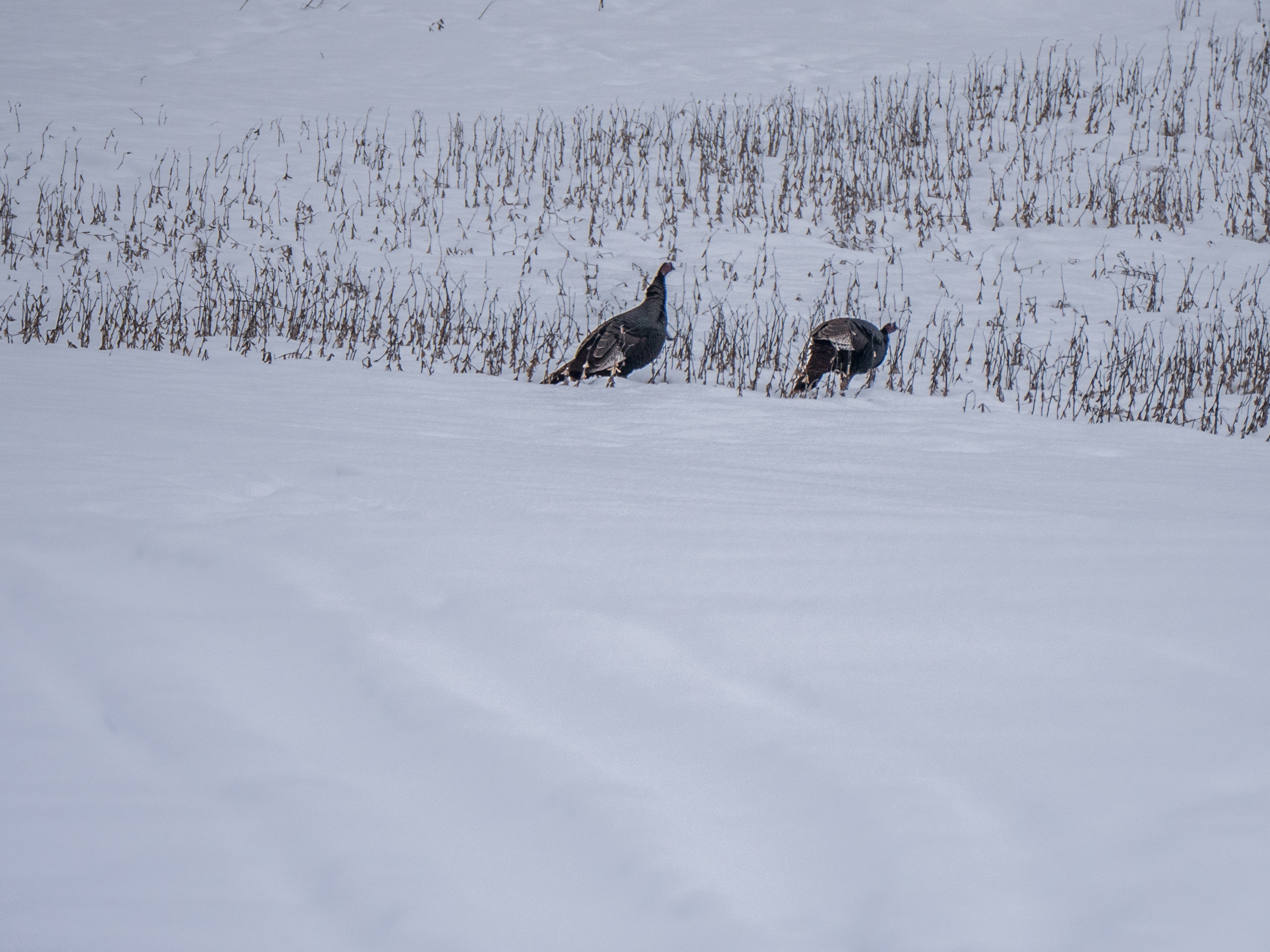 … two wild turkeys at the end of the snowmobile tracks (as seen through the hand-held Panasonic – Leica 100-400 mm telephoto lens at 800 mm equivalent focal length … and cropped):