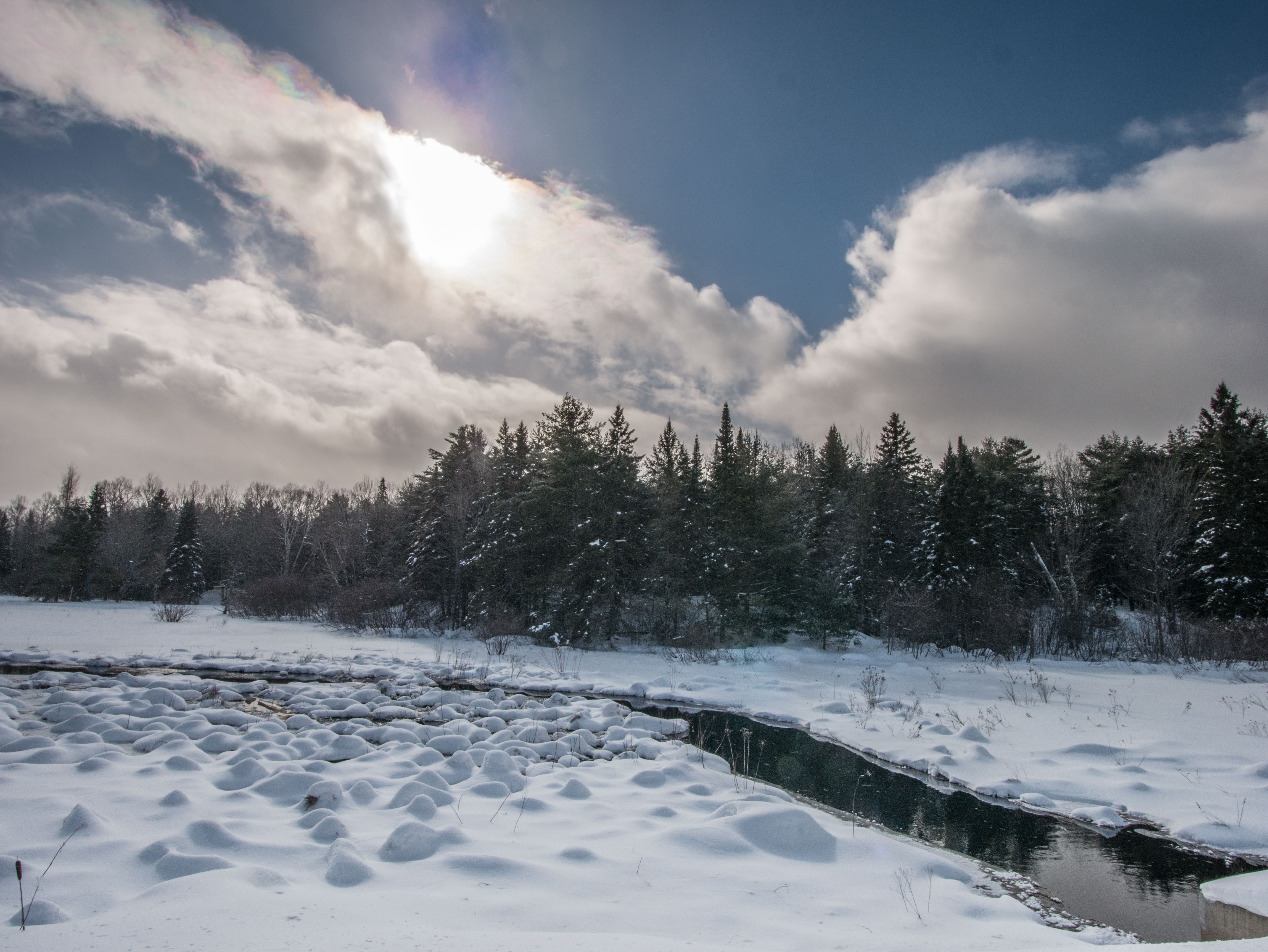 The purplish spot above the sun is a lens flare. This oft-photographed stream flows along the Shebeshekong Road, just south of the Skerryvore Community Road.