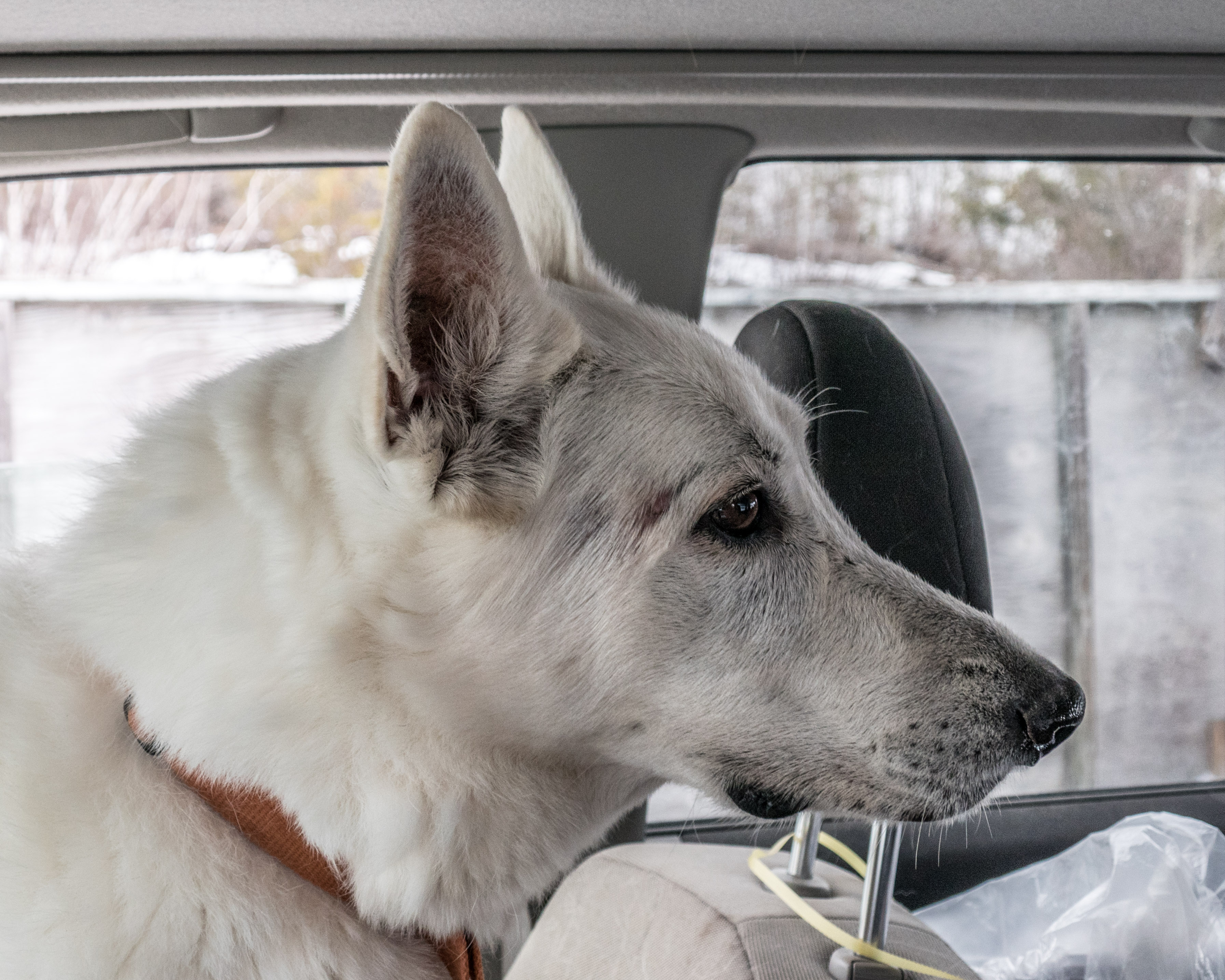 She goes by the name Tinsley, but is getting used to TinTin which is a name that I find a bit easier. A White Shepherd, she is about 8/9 years old. We are having lots of fun together.