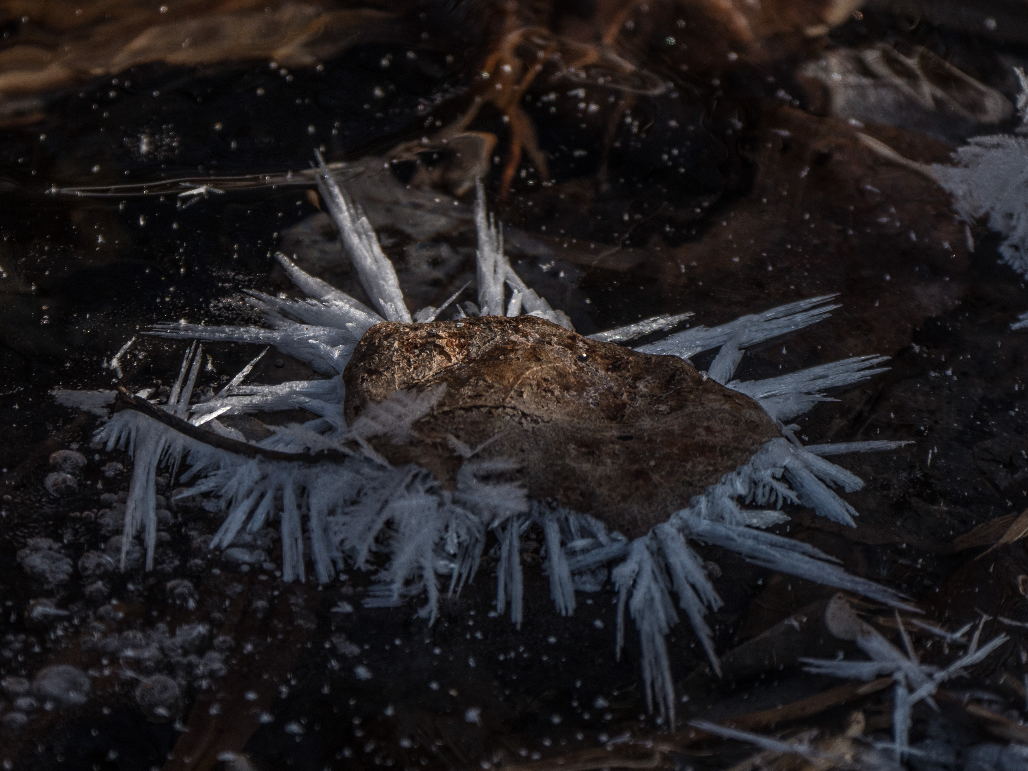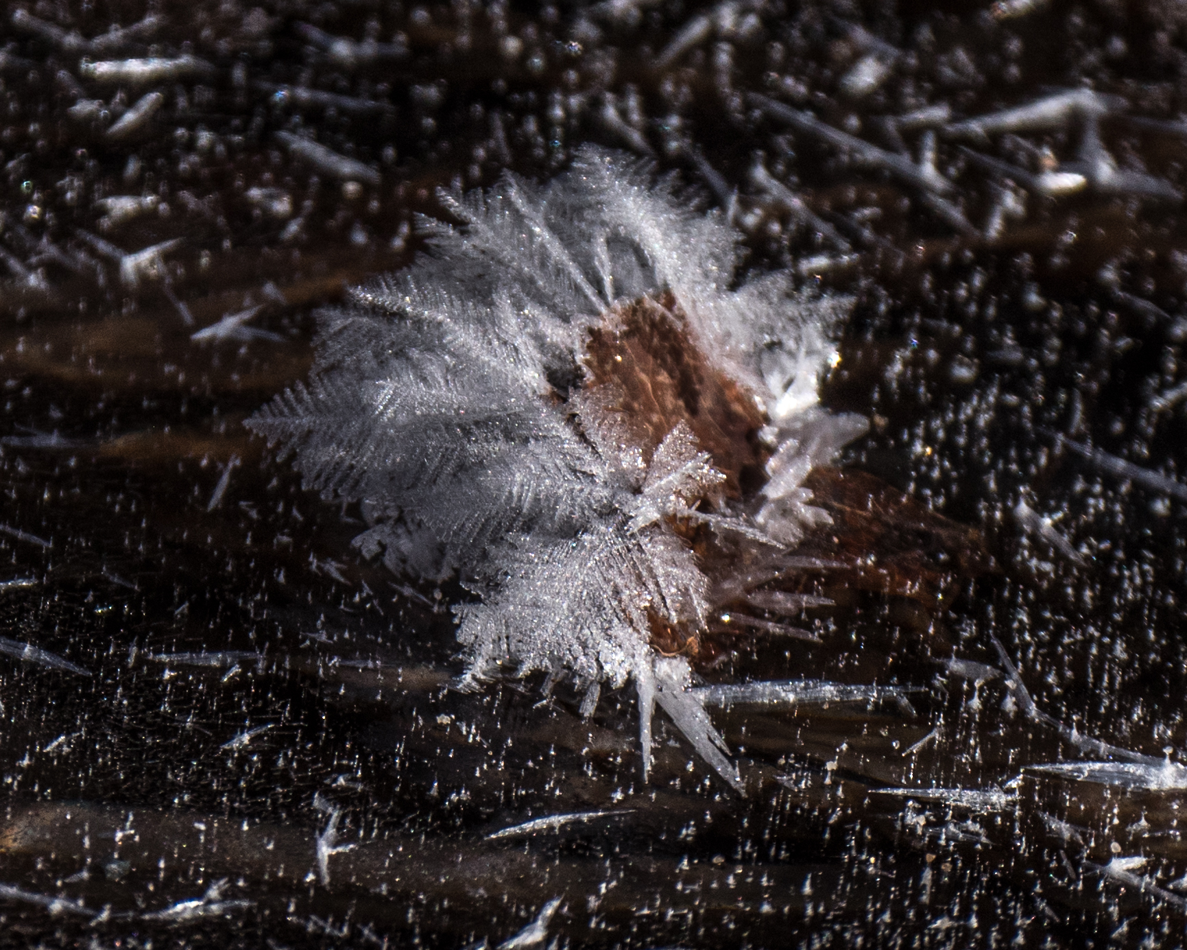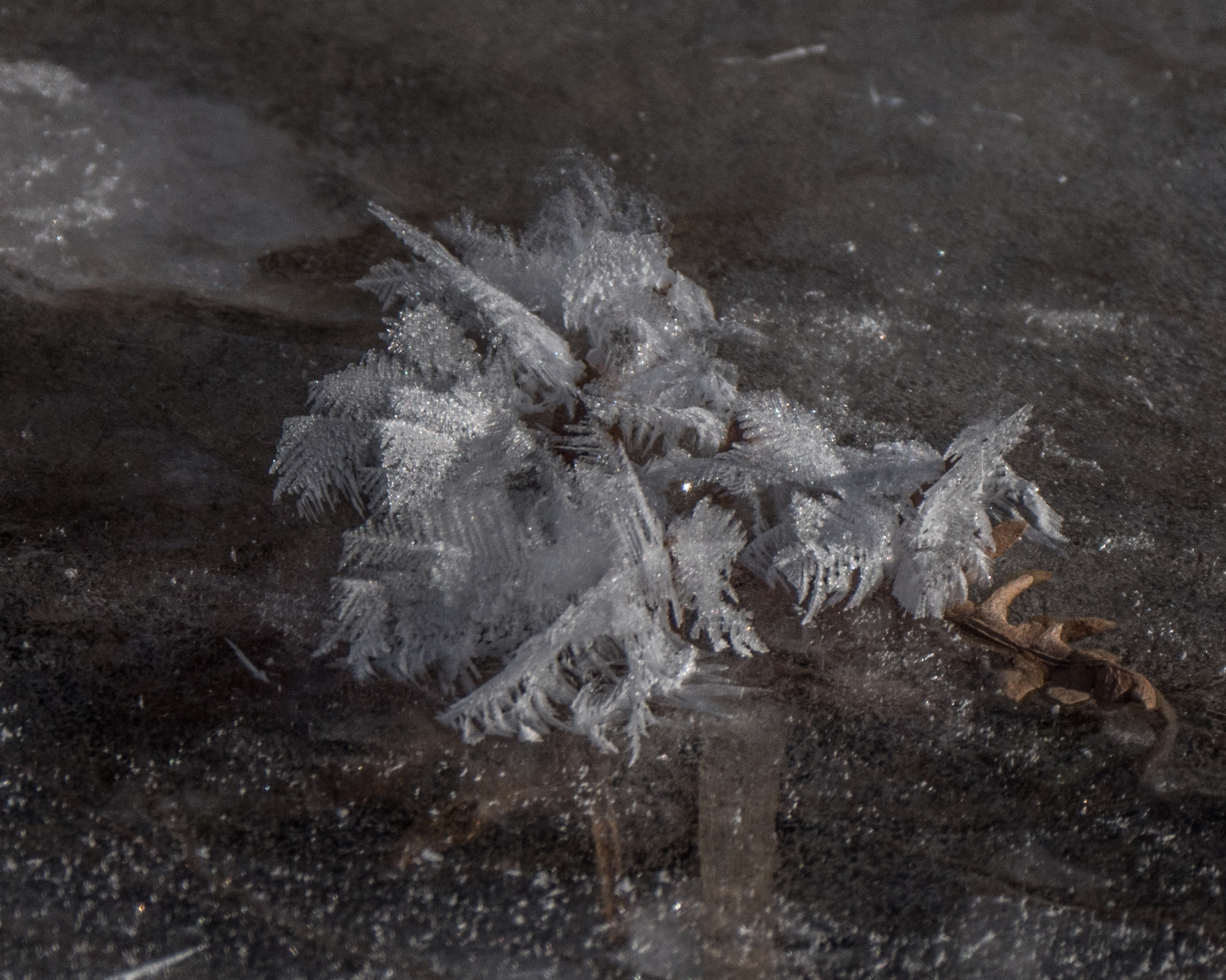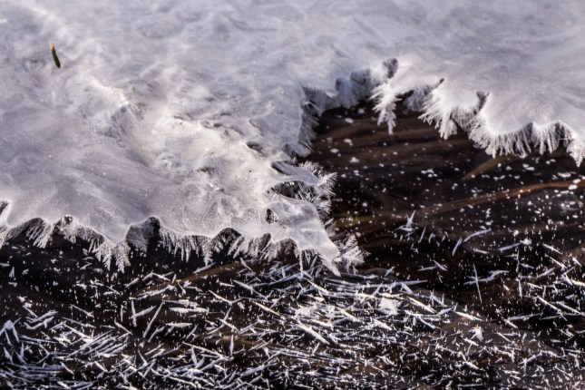 Early morning temperatures plunged to the mid -20s ºC the last few days, refreezing local open water and giving some nice frost flowers in local roadside ditches.