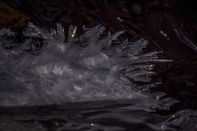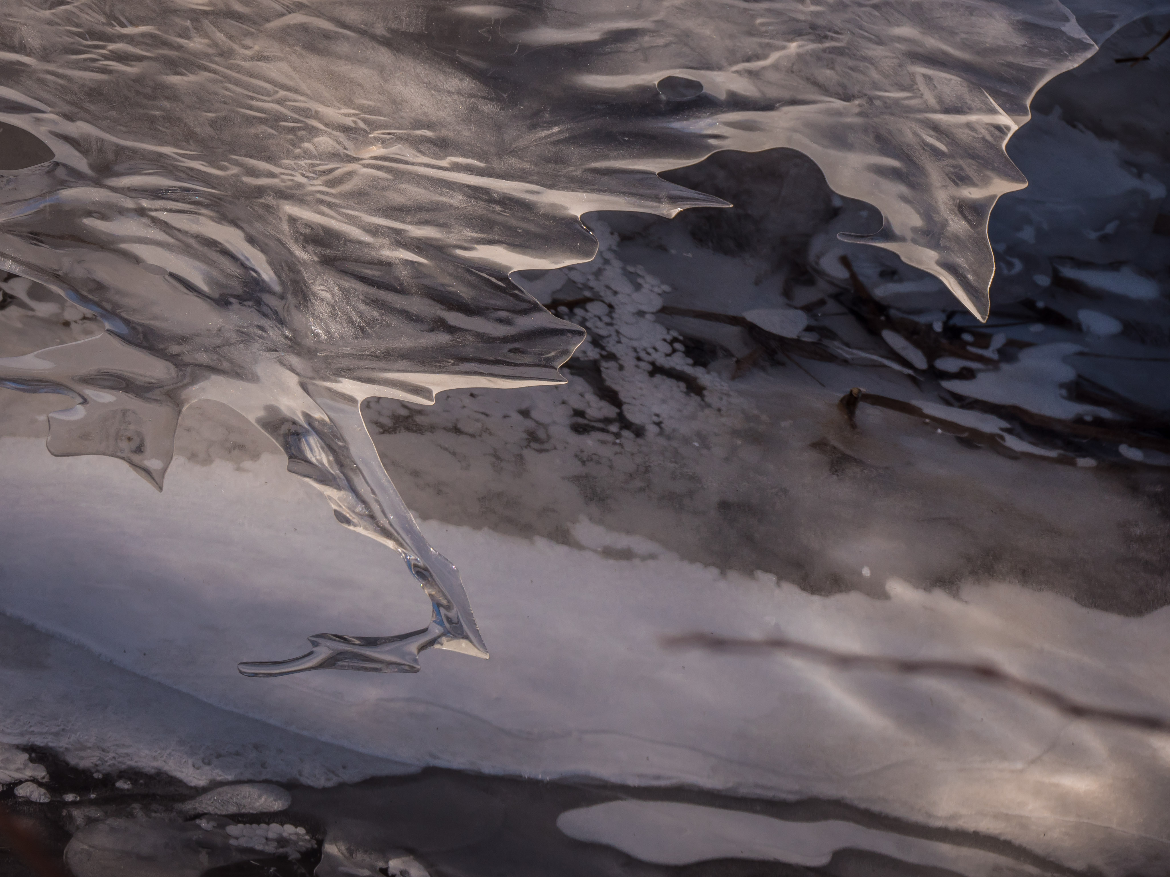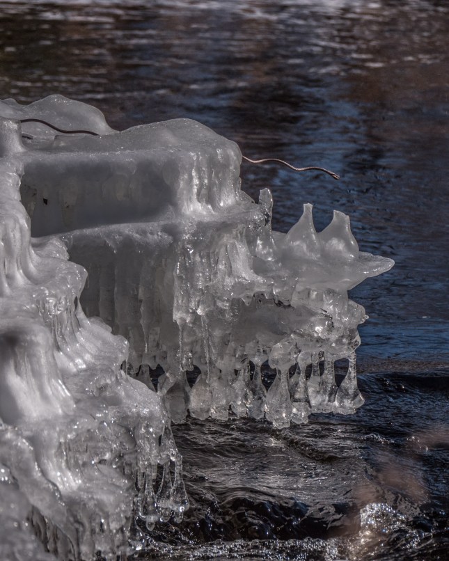 We had some mild days after nights of freezing temperatures giving some interesting ice art for the curious photographer, often seen driving along the wrong side of a roadway to peer into the ditch.   Some examples: