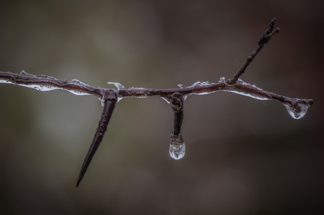 Some of the ice sheathing this Hawthorne branch has broken off, leaving some of the branches exposed …