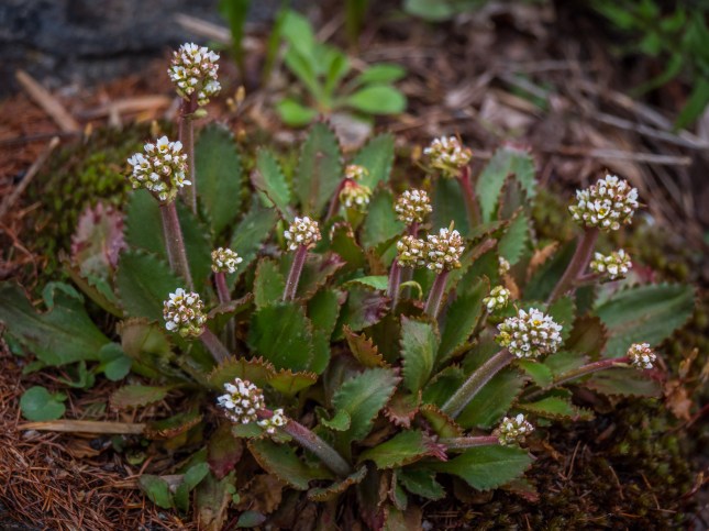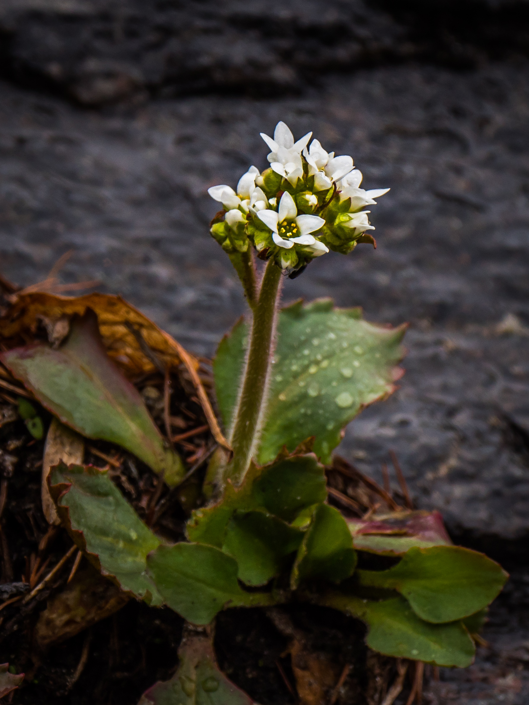 Aka Early Saxifrage. It has a huge range: North America from the Gulf of Mexico Northern Coast (30ºN) to the northern tip of Ellesmere Island (83º N, about 800 km from the North Pole). It would be interesting to study the changes in this plant depending on its Latitude. I know of no other plant that has such a wide range of Latitude.