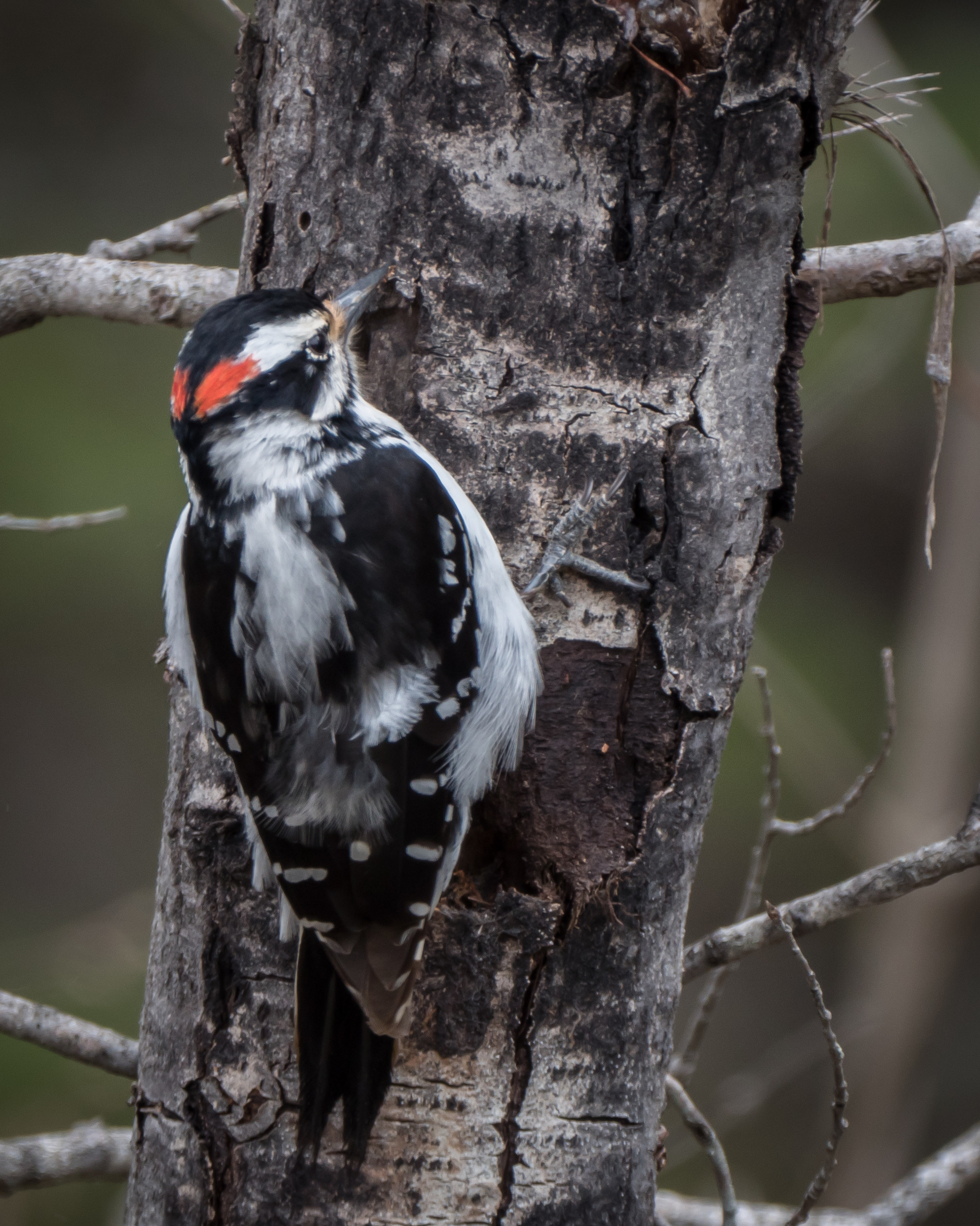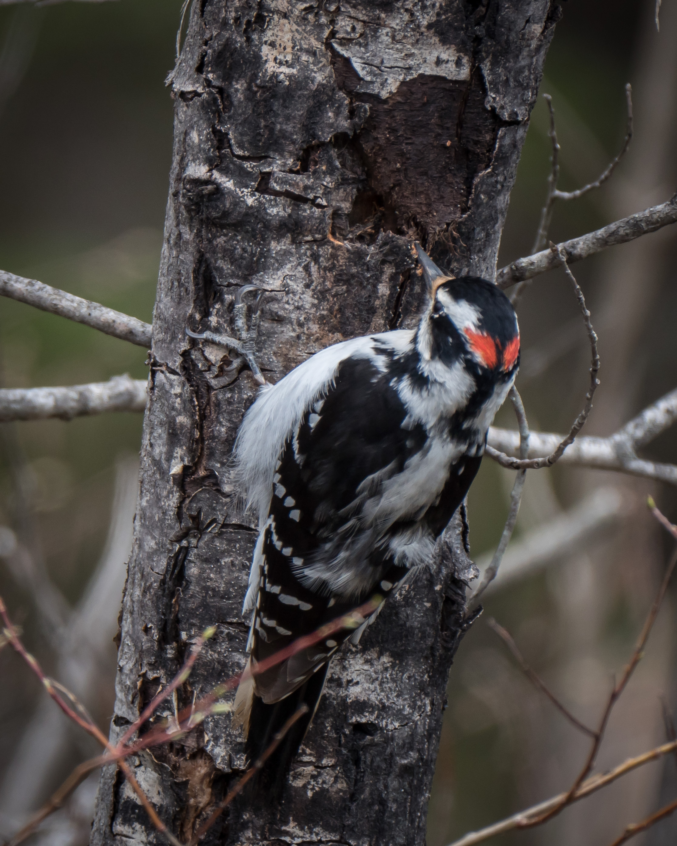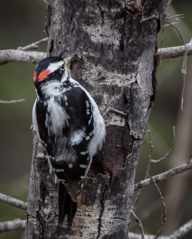 Hairy woodpecker having a good feed on the critters sheltering under the bark of this Aspen.