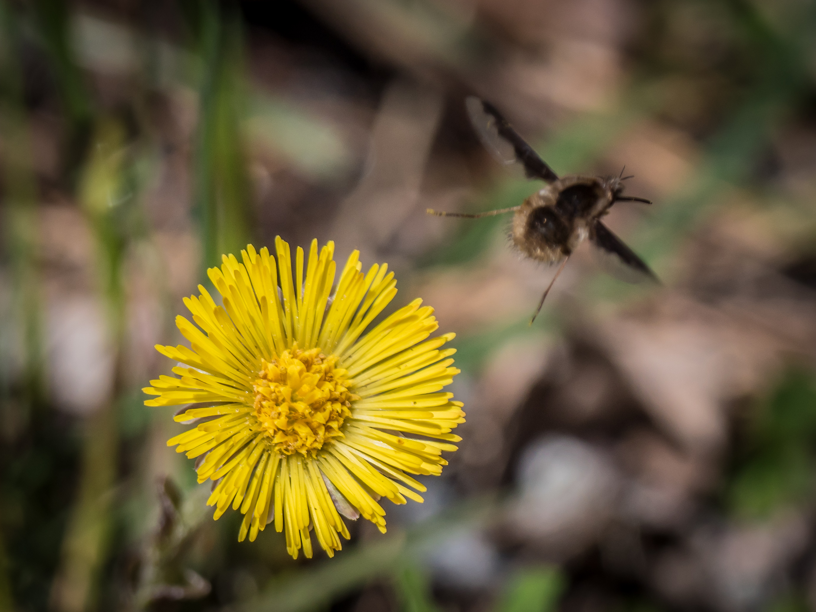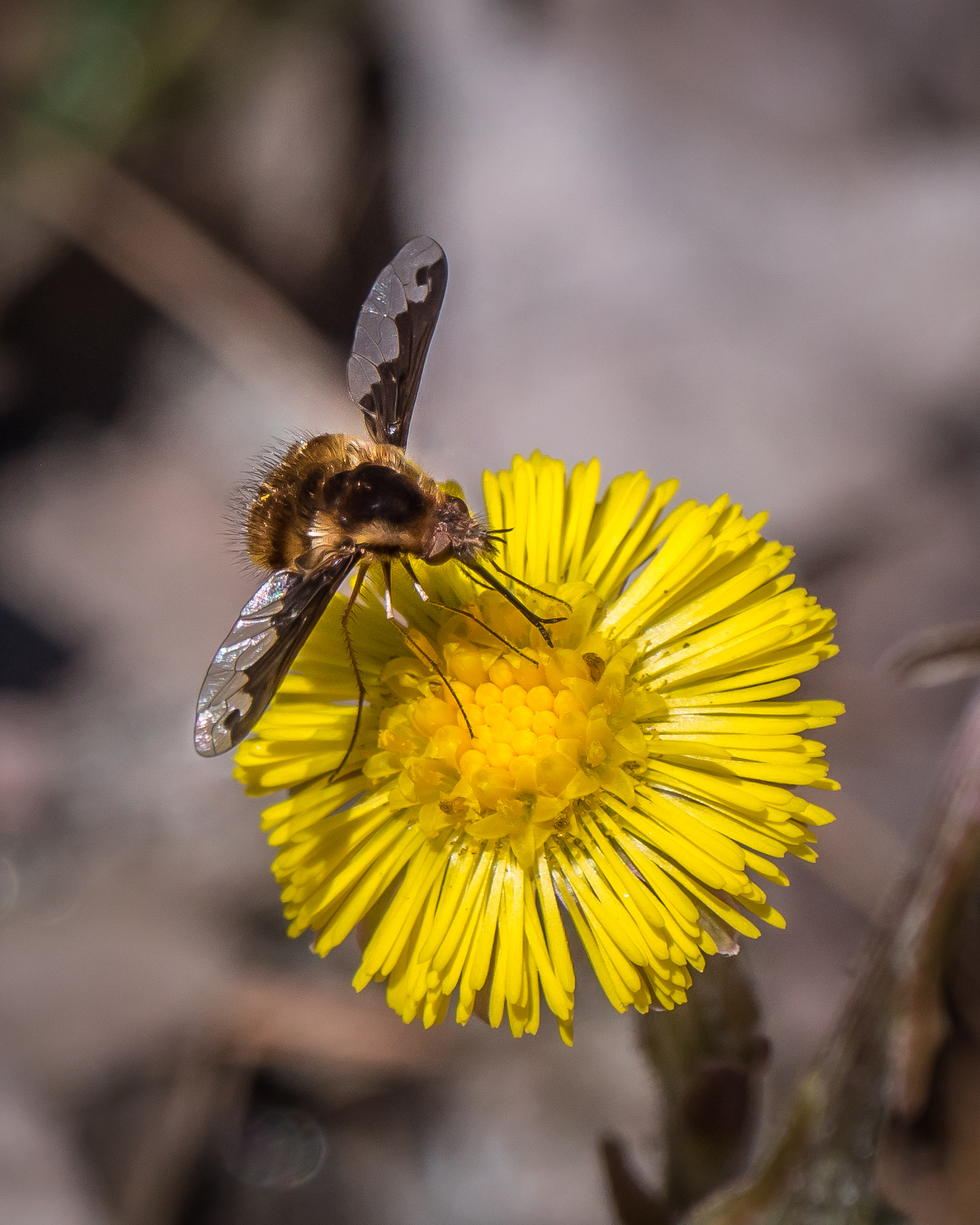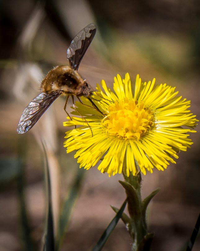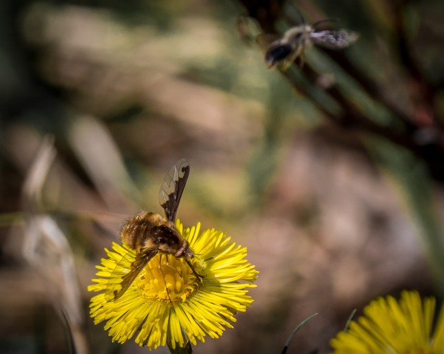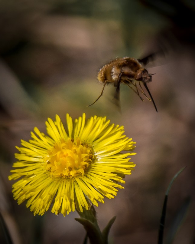 What follows is a lot of images of “Large Bee Flies” on the very early blooming Coltsfoot. You’ll get some detail if you click on the images to enlarge them.
