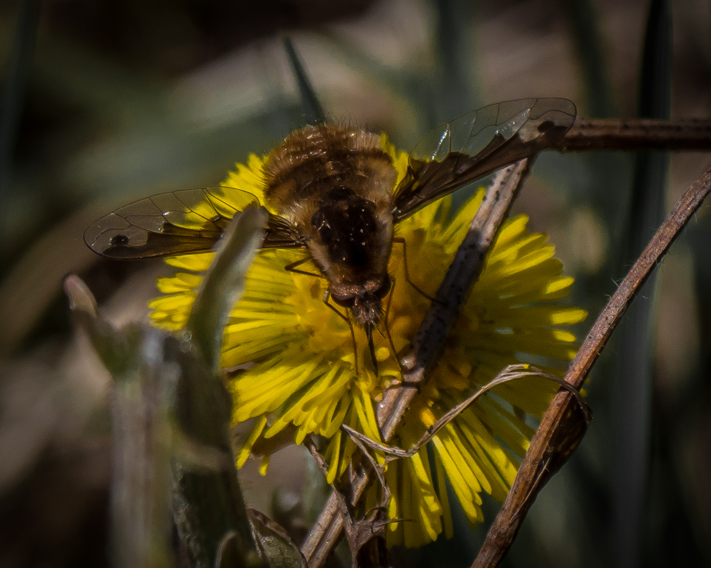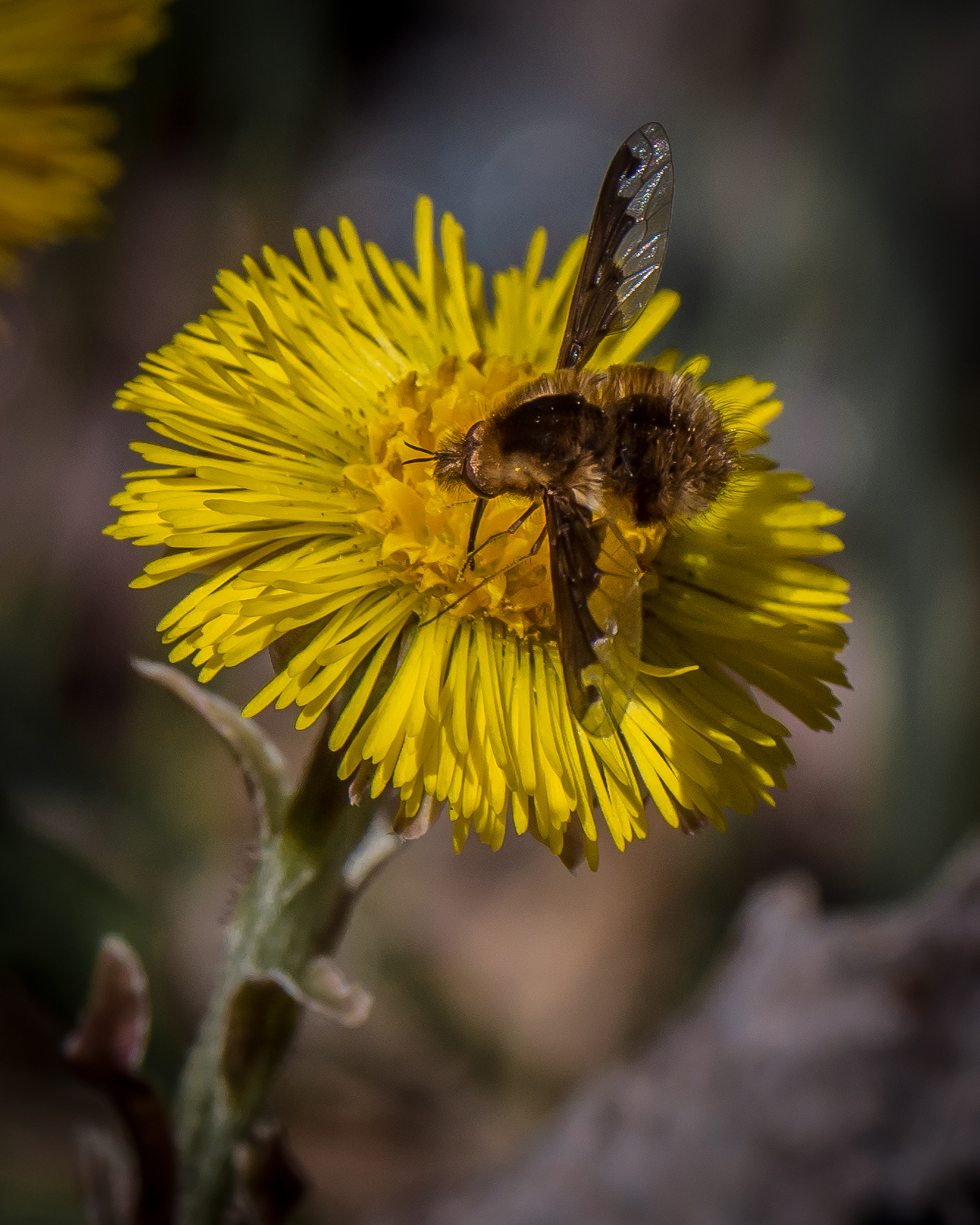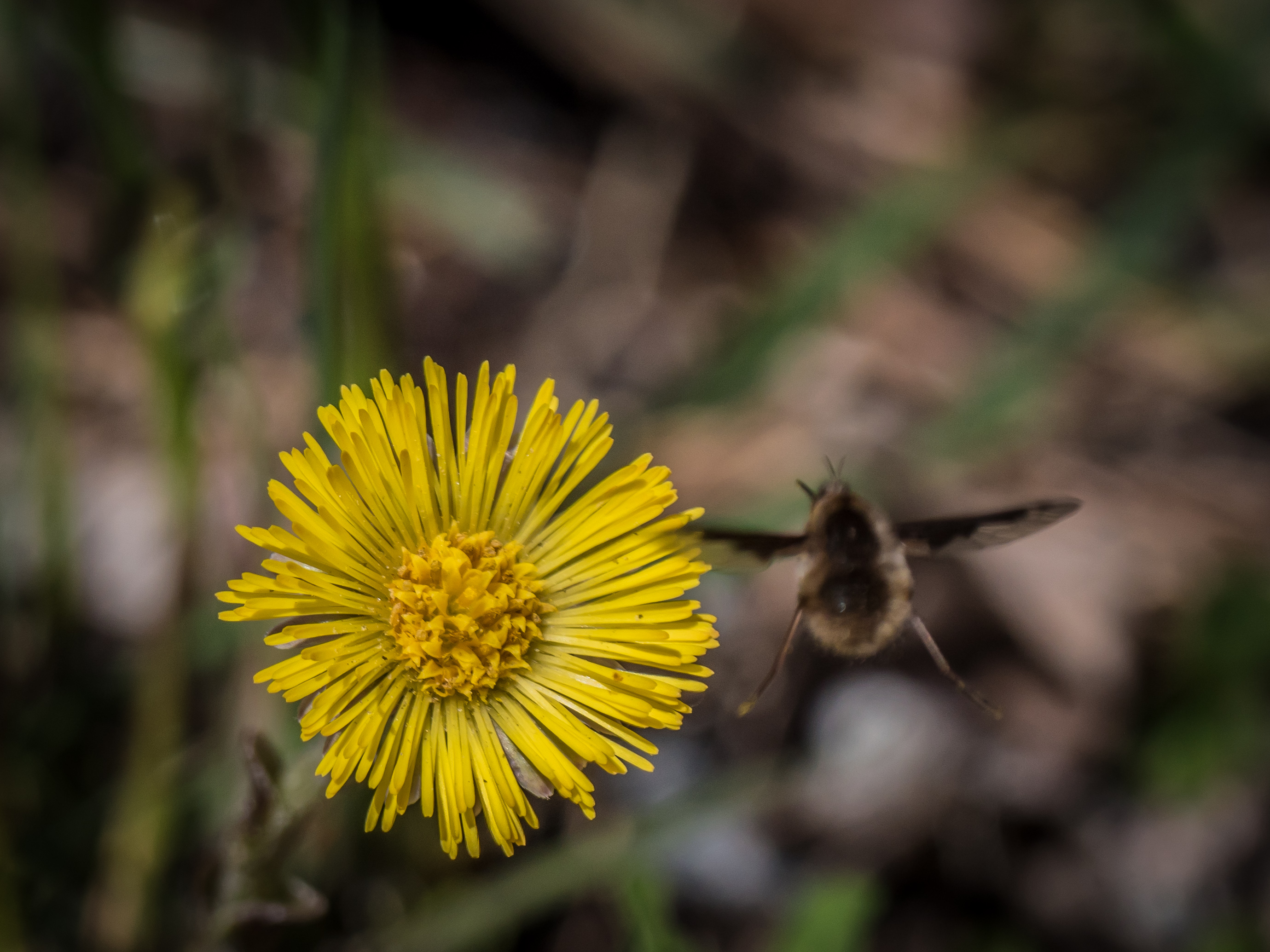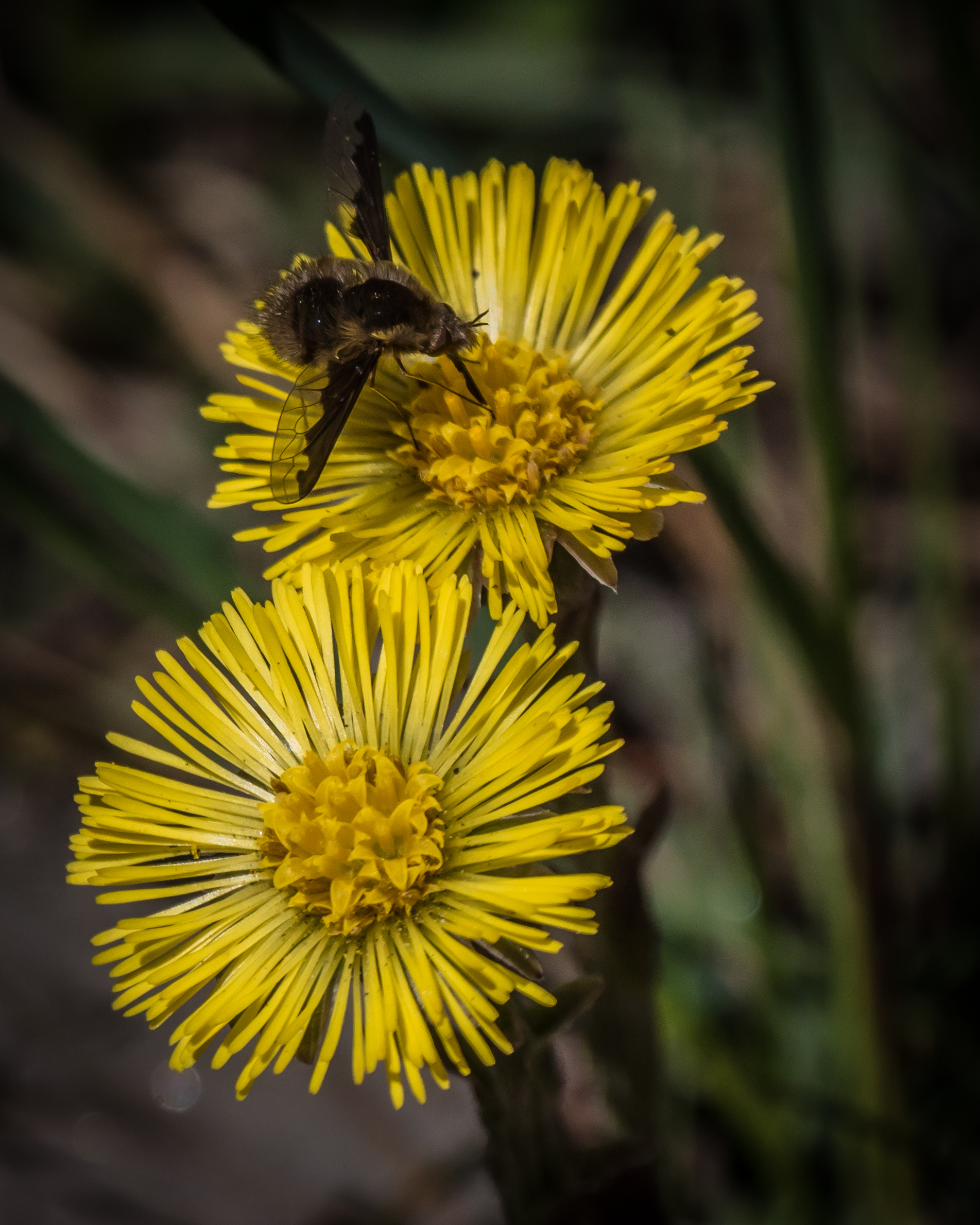 What follows is a lot of images of “Large Bee Flies” on the very early blooming Coltsfoot. You’ll get some detail if you click on the images to enlarge them.