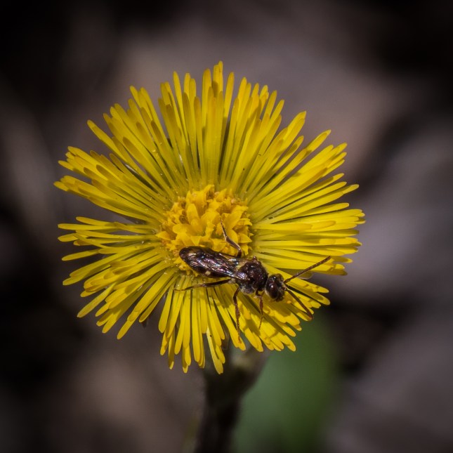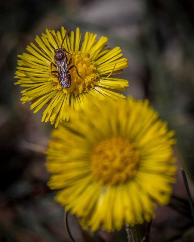 This is a typical cluster of Coltsfoot on disturbed land in a heavily wooded area. No leaves yet. They’ll come later, at the base of the plant, shaped like the print of a colt’s foot.