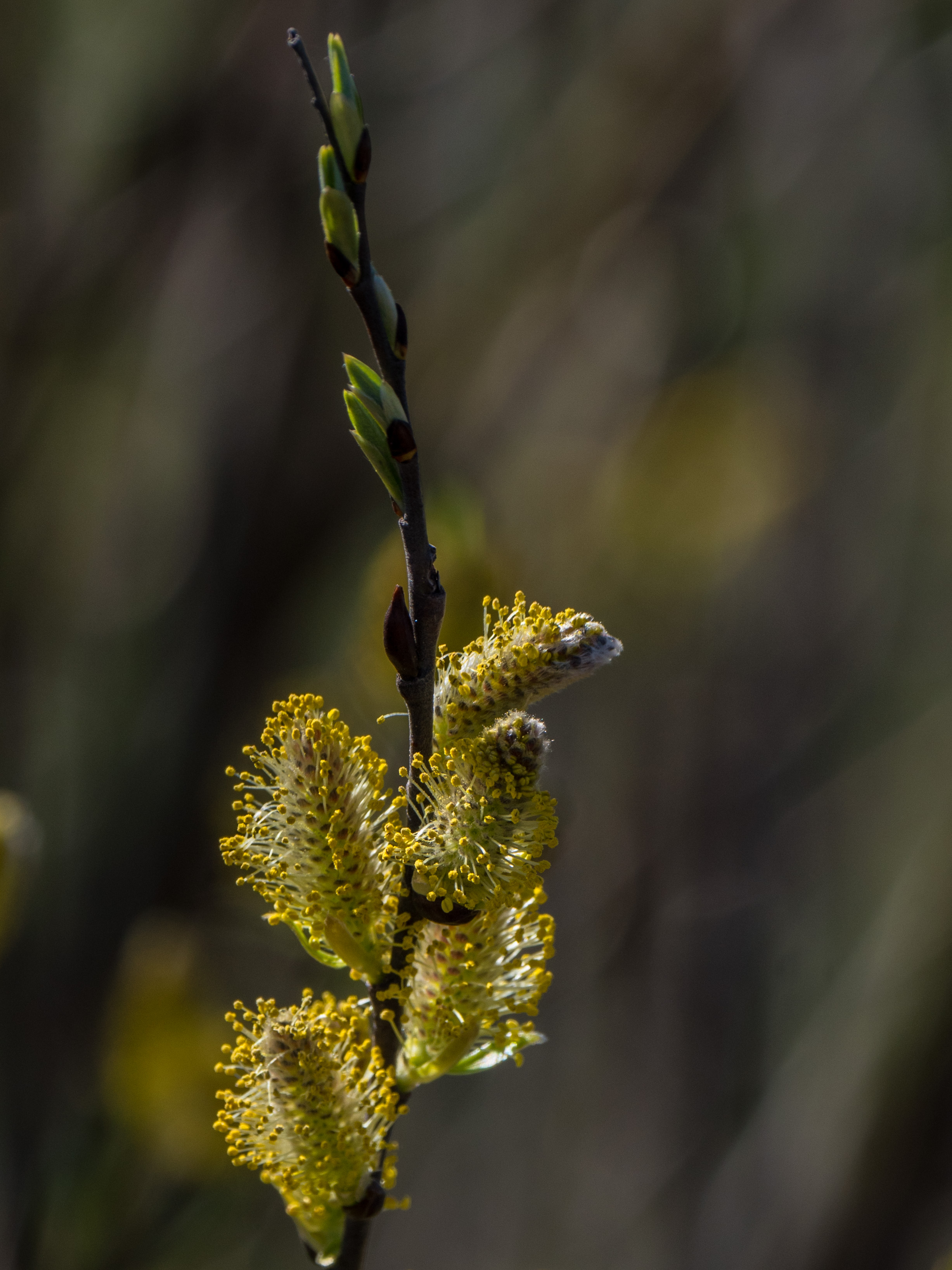 Obviously these are male catkins, producing pollen on their anthers. Several leaf buds are further up this willow branch.