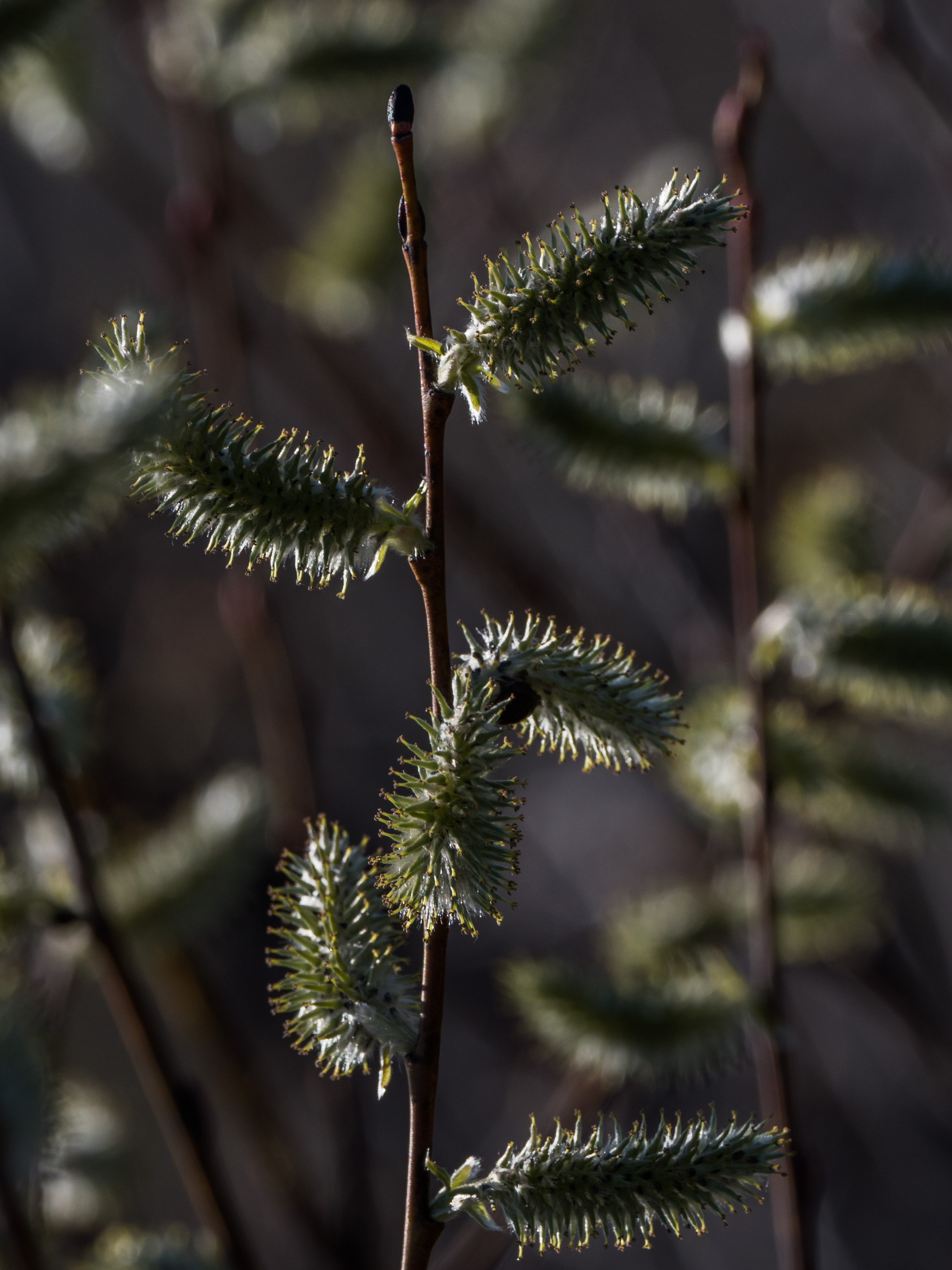 A few feet away on another willow these female catkins show their pistils, which are easily seen if you click on the photo: