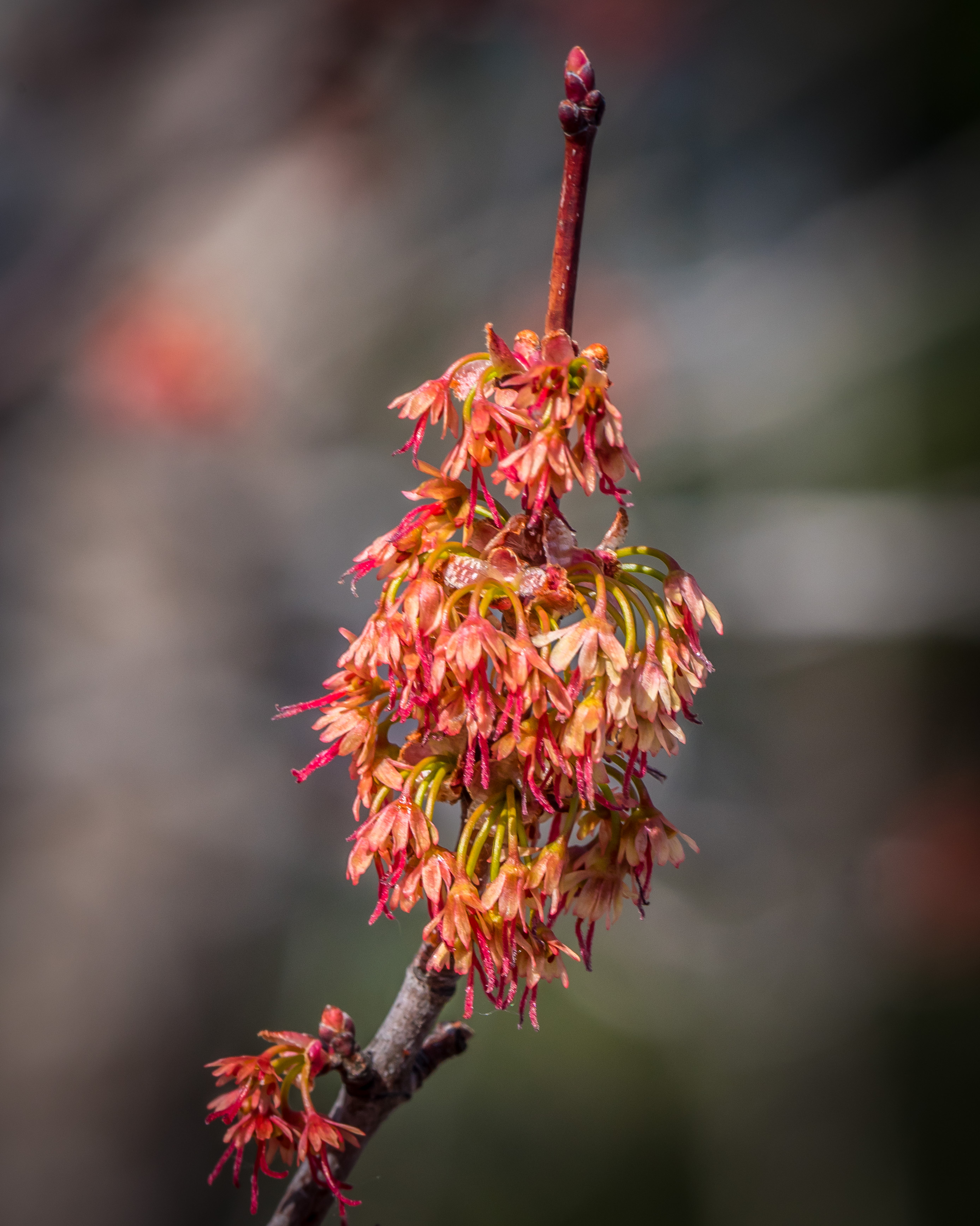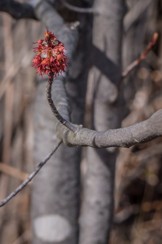 Red Maple is in an advanced stage of blossoming. The female flowers are in the stage of pollination here: