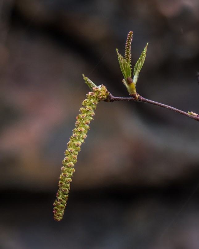 White birch leaves are emerging…along with the female catkin.  Soon the drooping male catkin will release it pollen to wind pollinate the female catkins.