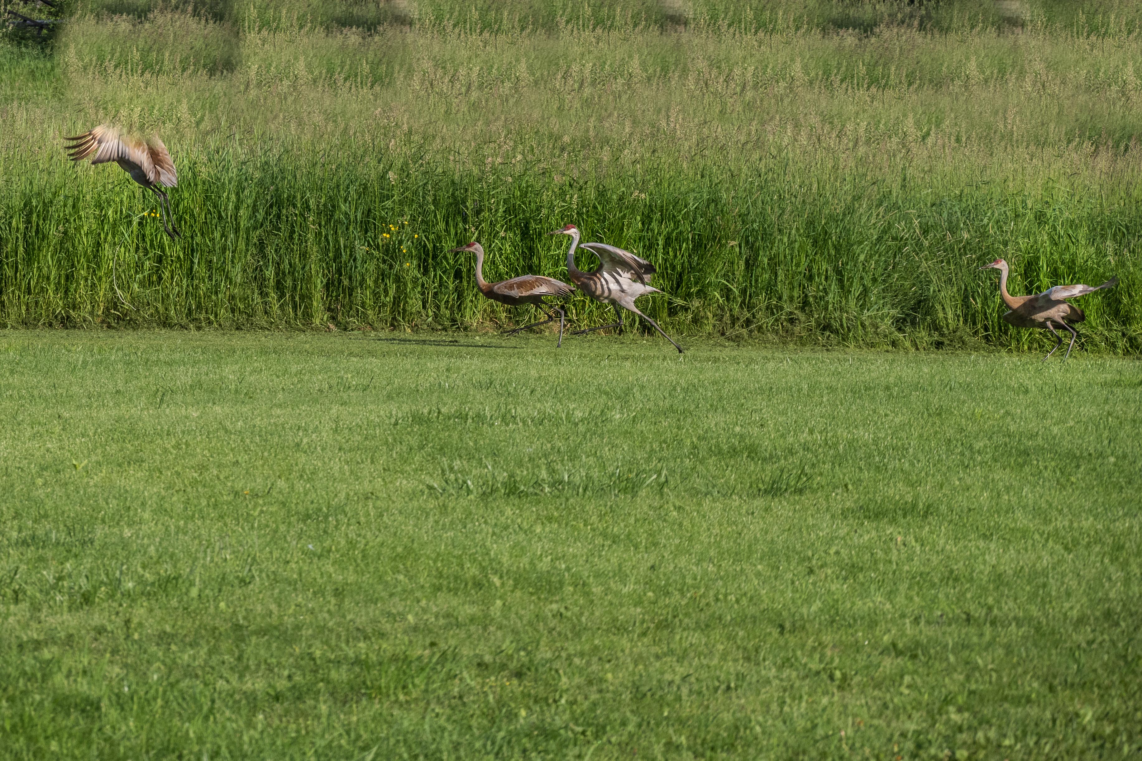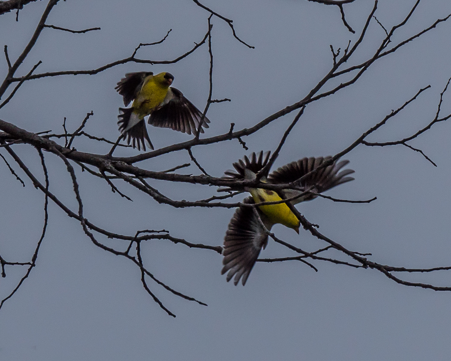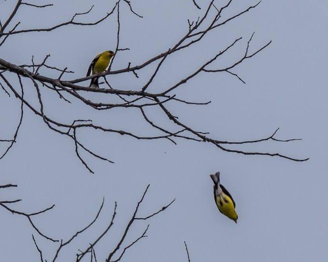 A pair of American Goldfinches. Dancing? Maybe!