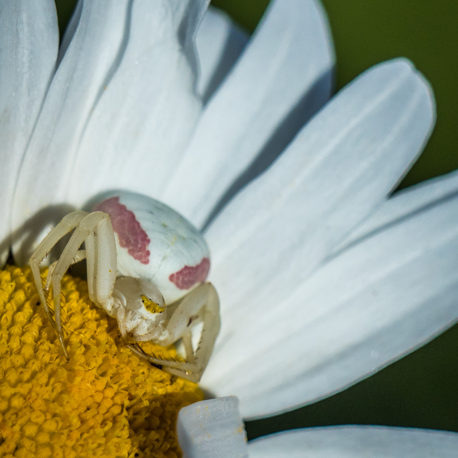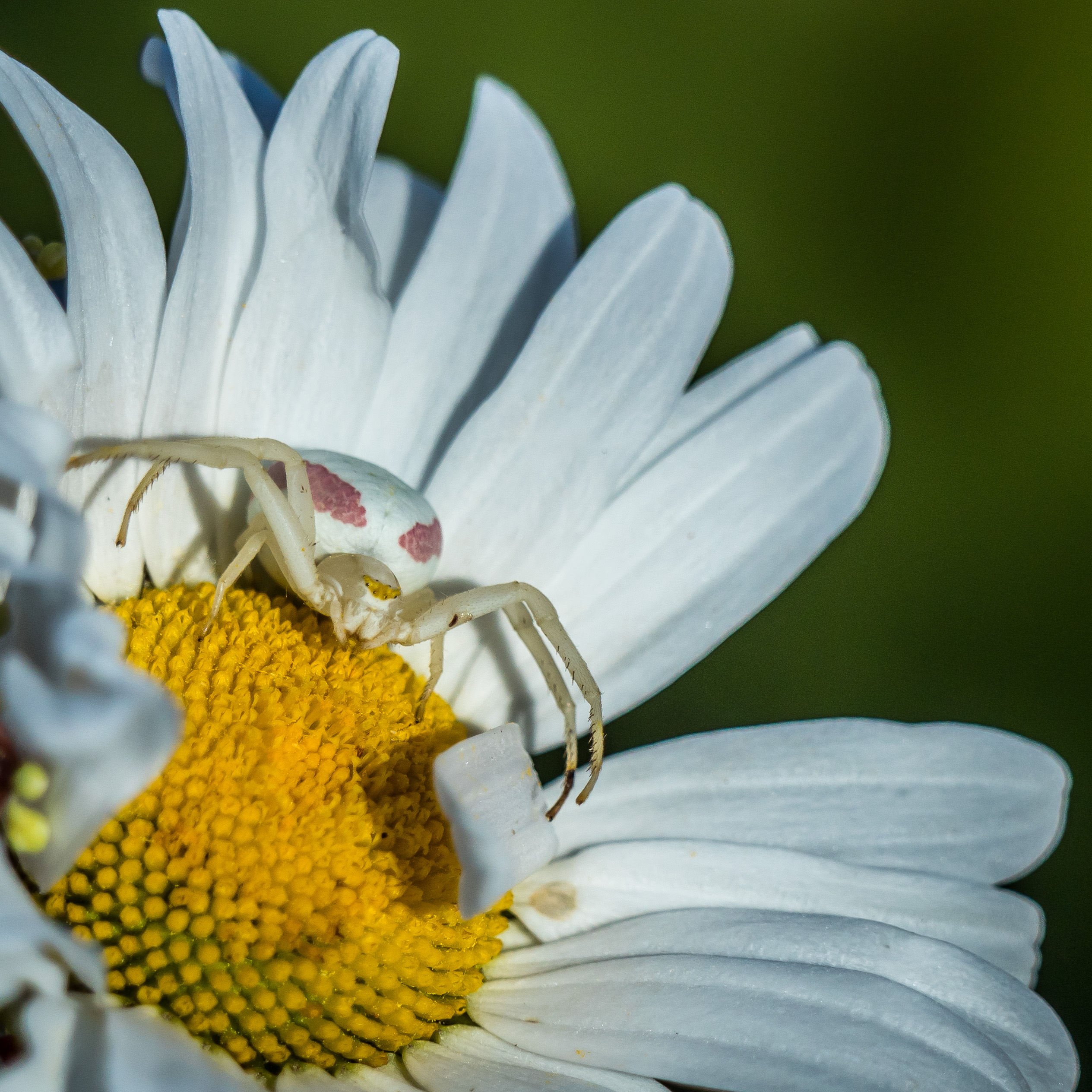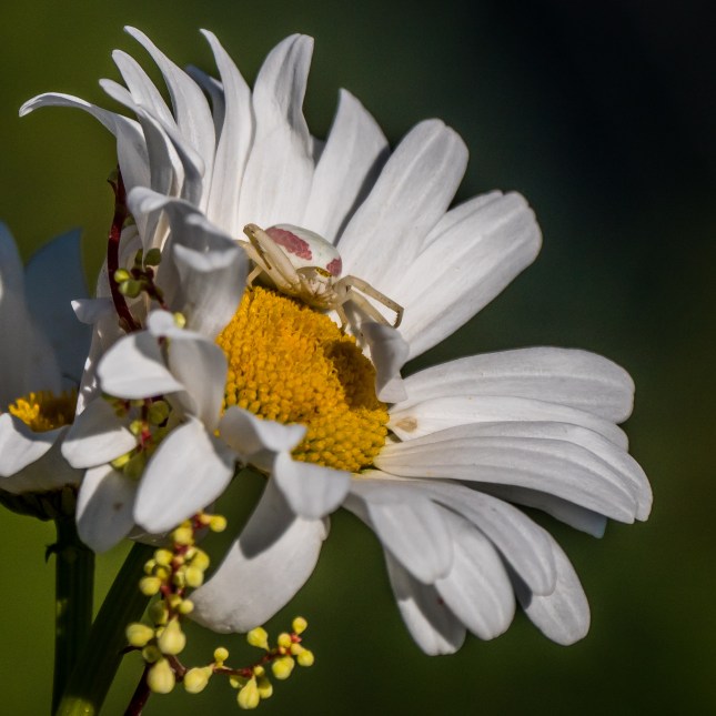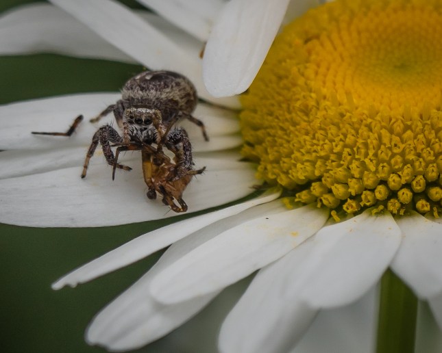 An unknown spider (Xysticus??) looks to be manhandling a carcass of a Goldenrod Crab Spider from its Ox Eye Daisy.