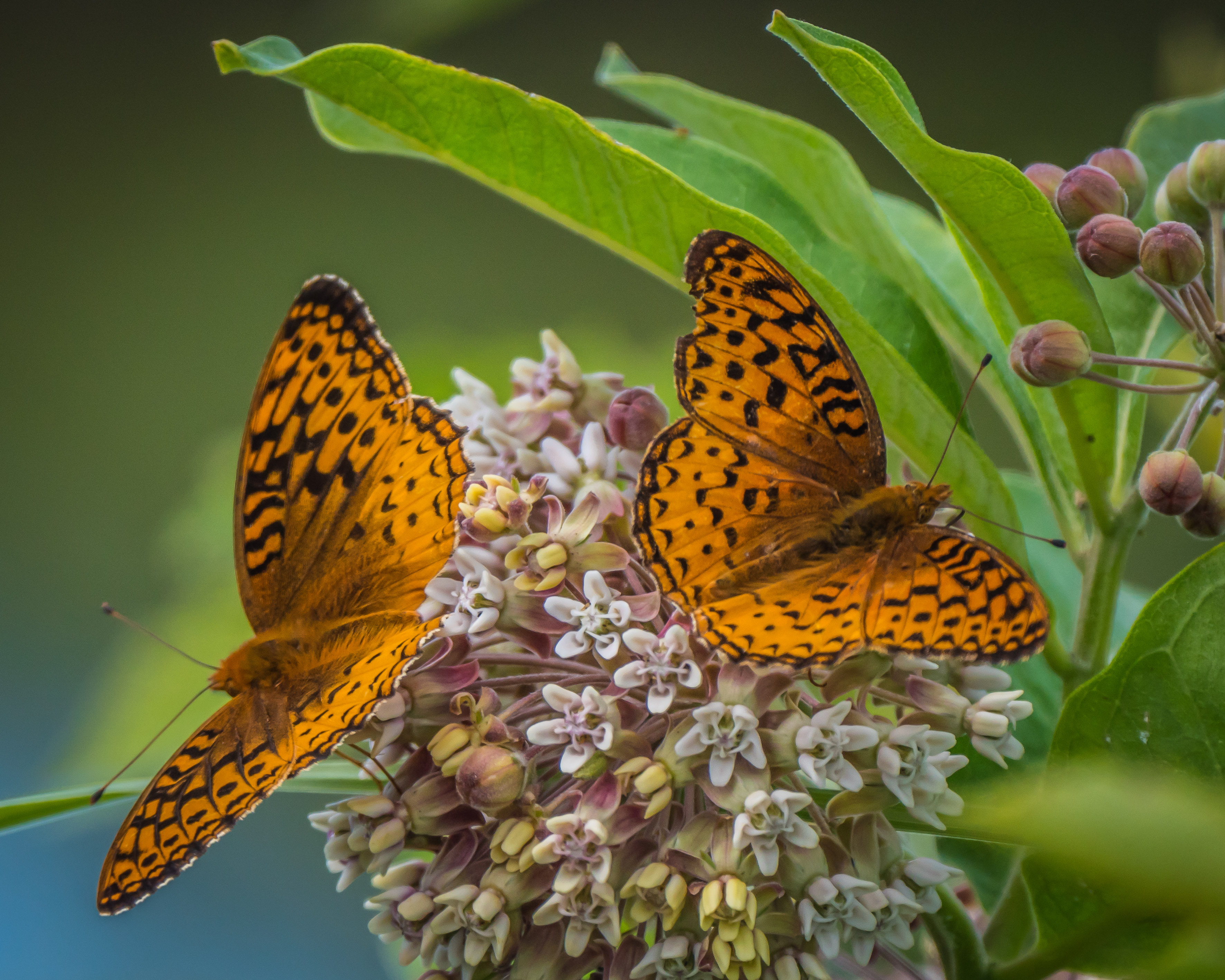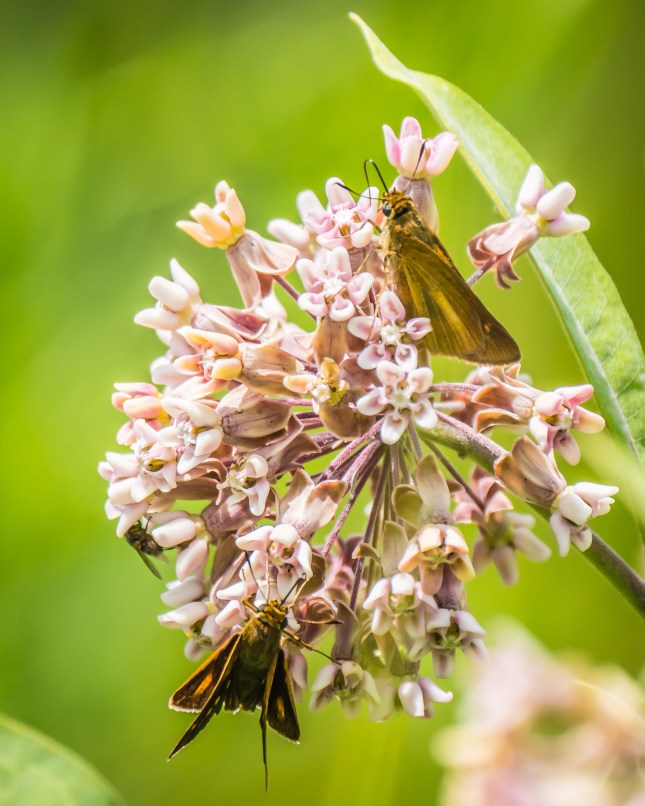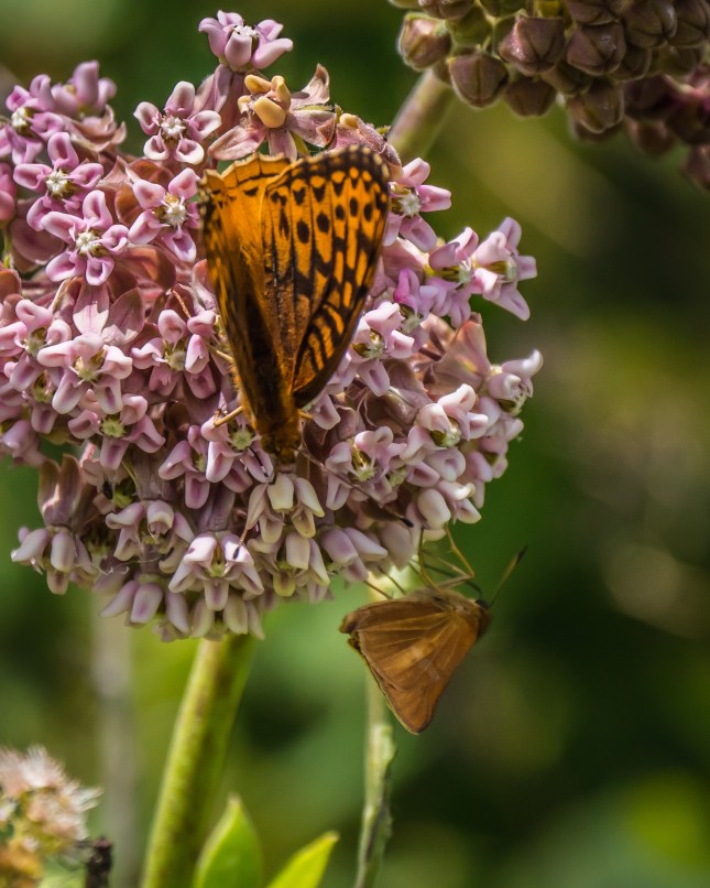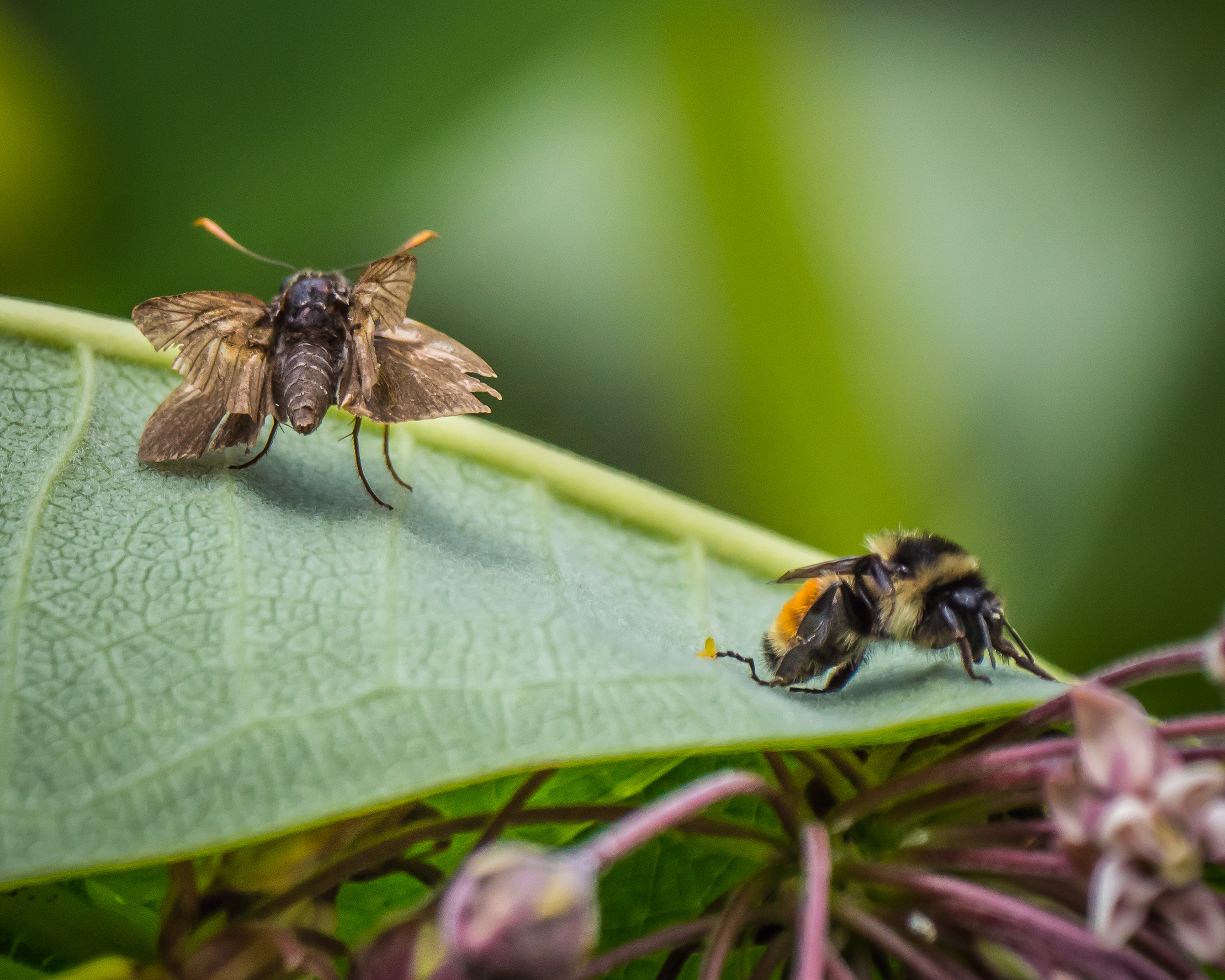 A well worn Skipper resting with an Orange belted Bumblebee.