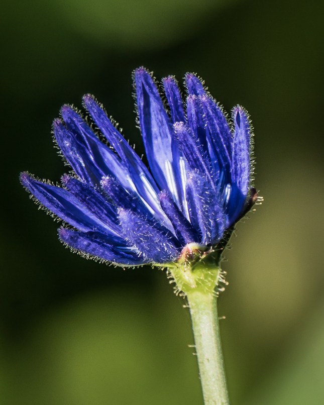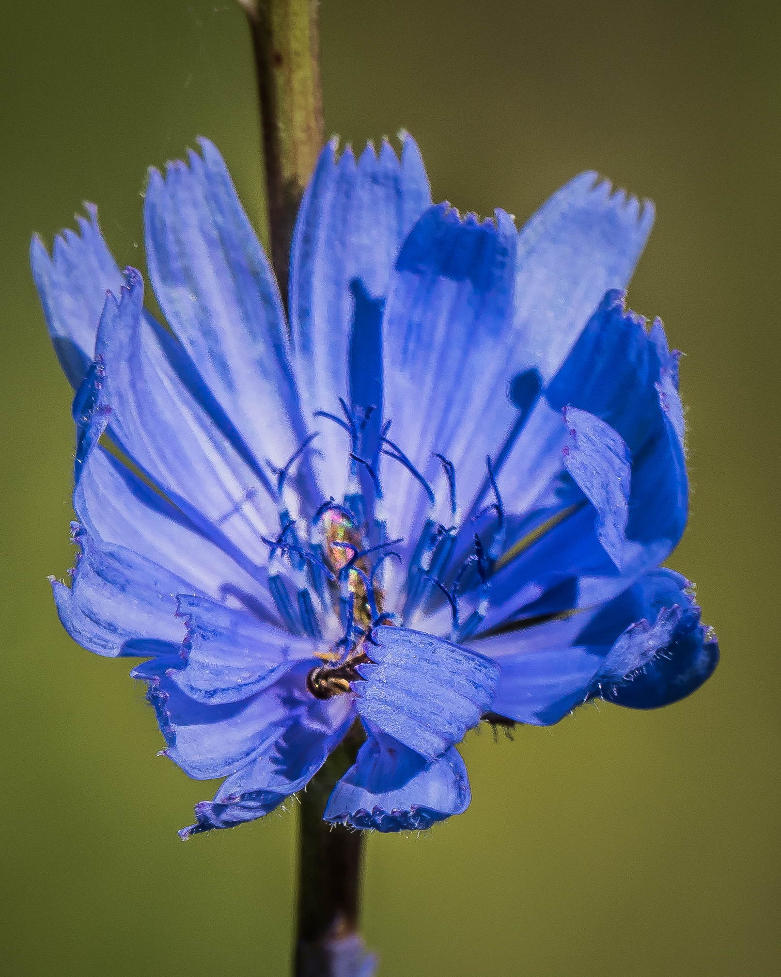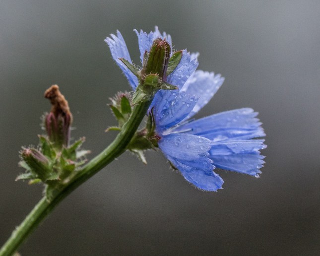 Common chicory (aka blue daisy, blue dandelion, blue sailors, blue weed, bunk, coffeeweed, cornflower, hendibeh, horseweed, ragged sailors, succory, wild bachelor’s buttons, and wild endive) was resplendent along most of the roadway.