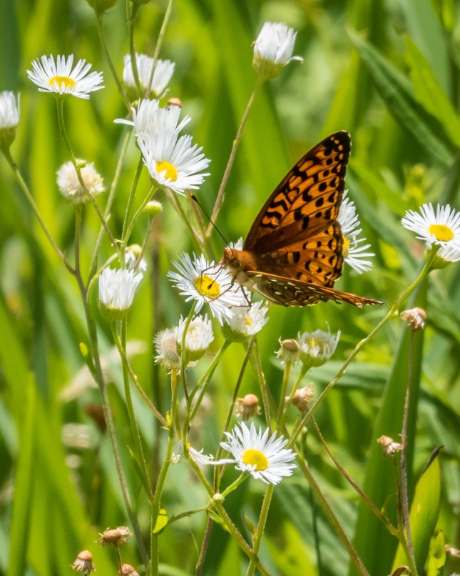 Great Spangled Fritillary nectaring on Daisy Fleabane at Chikanishing Creek …