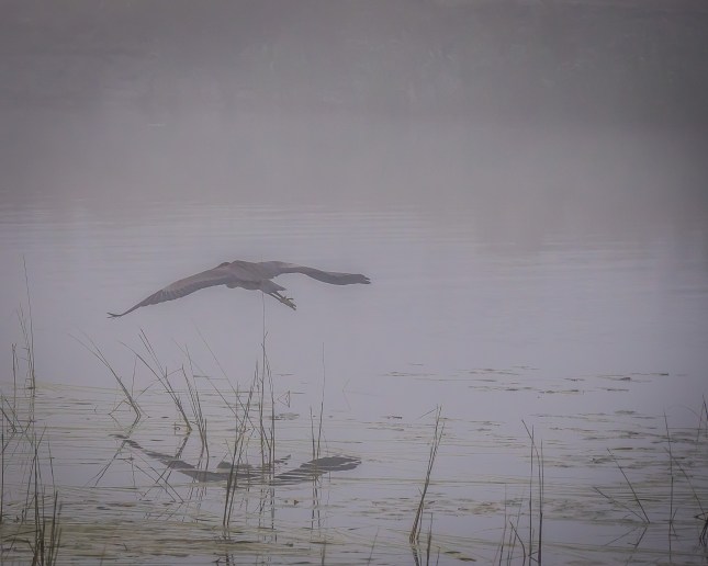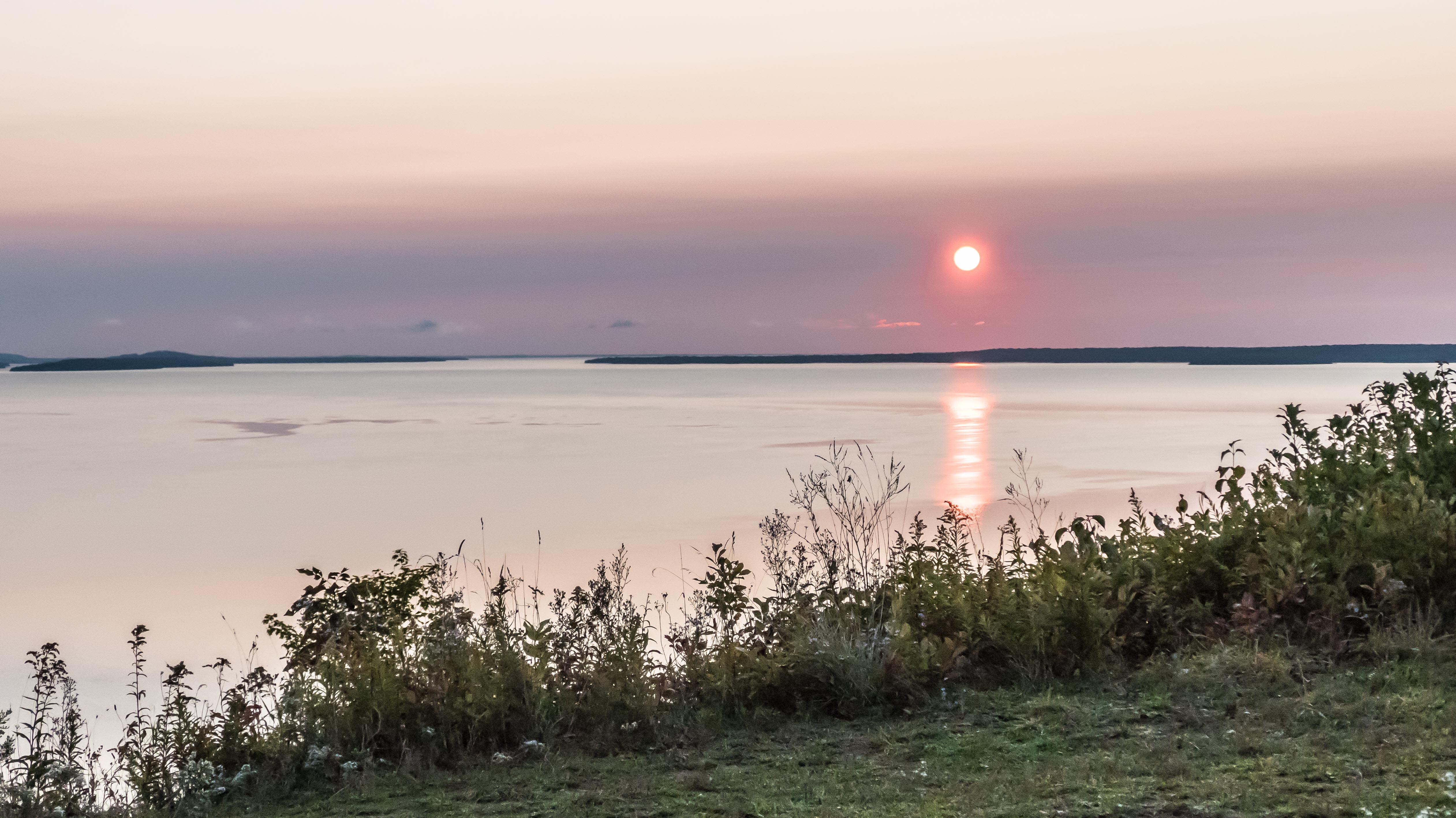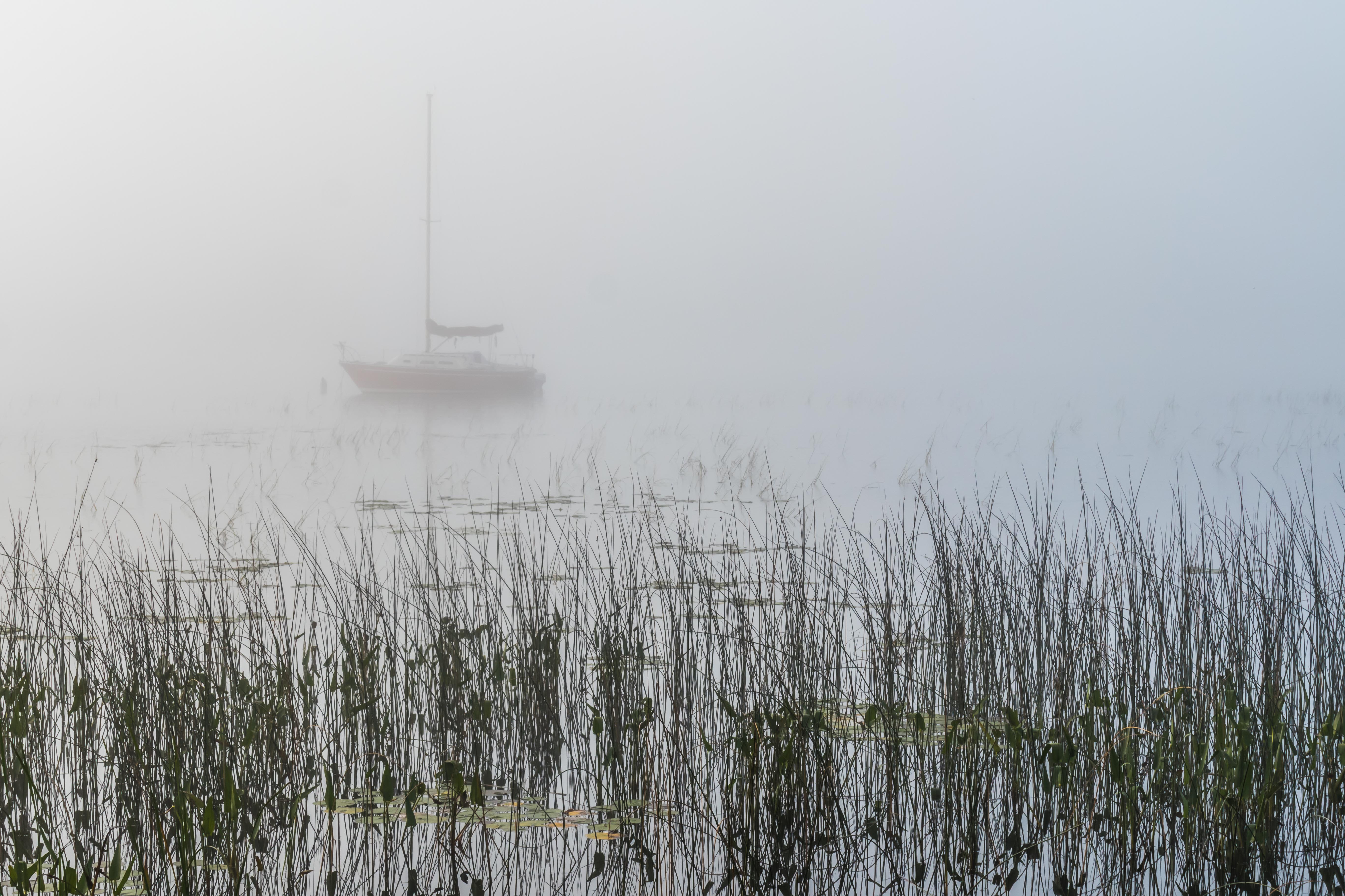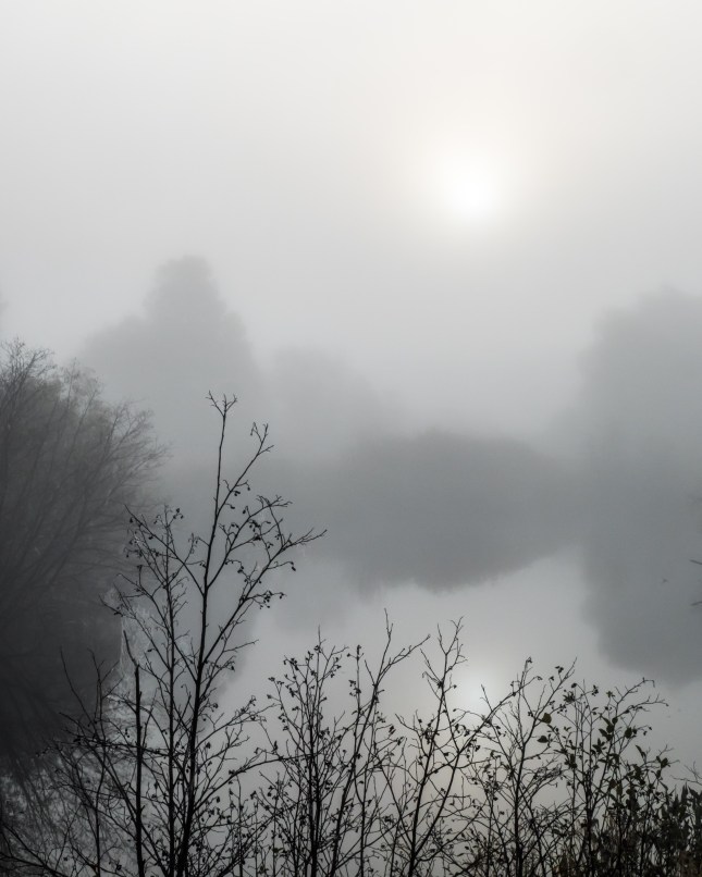 The fog was being “burned off”, evaporated into water vapour, by the morning sun as we looked out over Byng Inlet from in front of Keith’s place on Riverside Road…