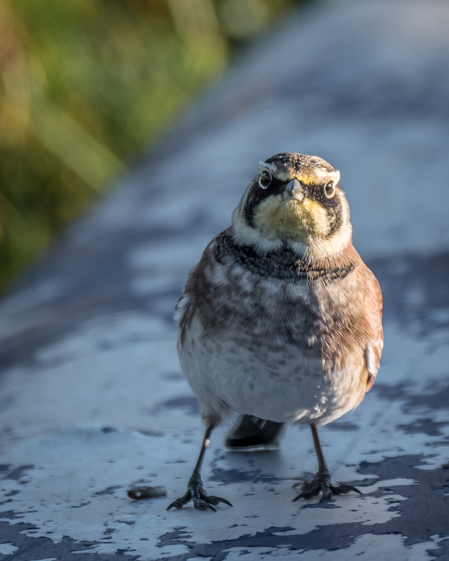 This is my first photo of a Horned Lark —- standing on the bottom of an overturned boat along Riverside Road. I didn’t hear it sing and first thought it might be a White Throated Sparrow, which are commonly found in that location. Compare the above with this Audobon photo.