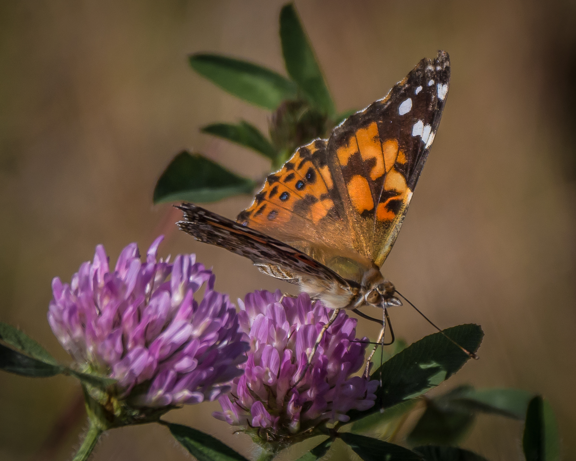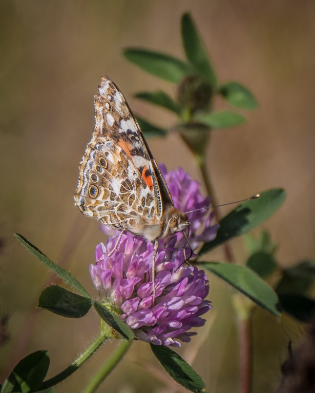 This Painted Lady was one of several that were nectaring on the blooming clover (in preparation for their debatable migration to the Southern States). We enjoyed a very heavy influx of Vanessa butterflies this year, mainly due to 2017 warm winter and spring.