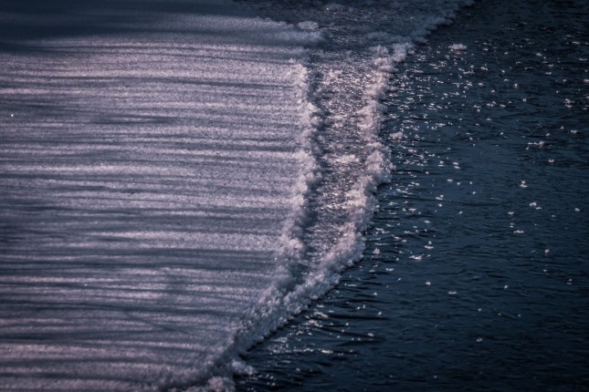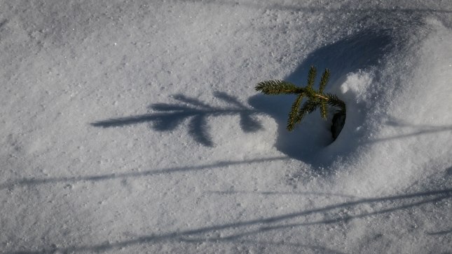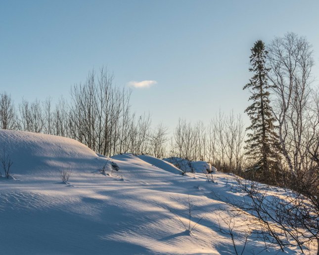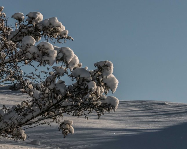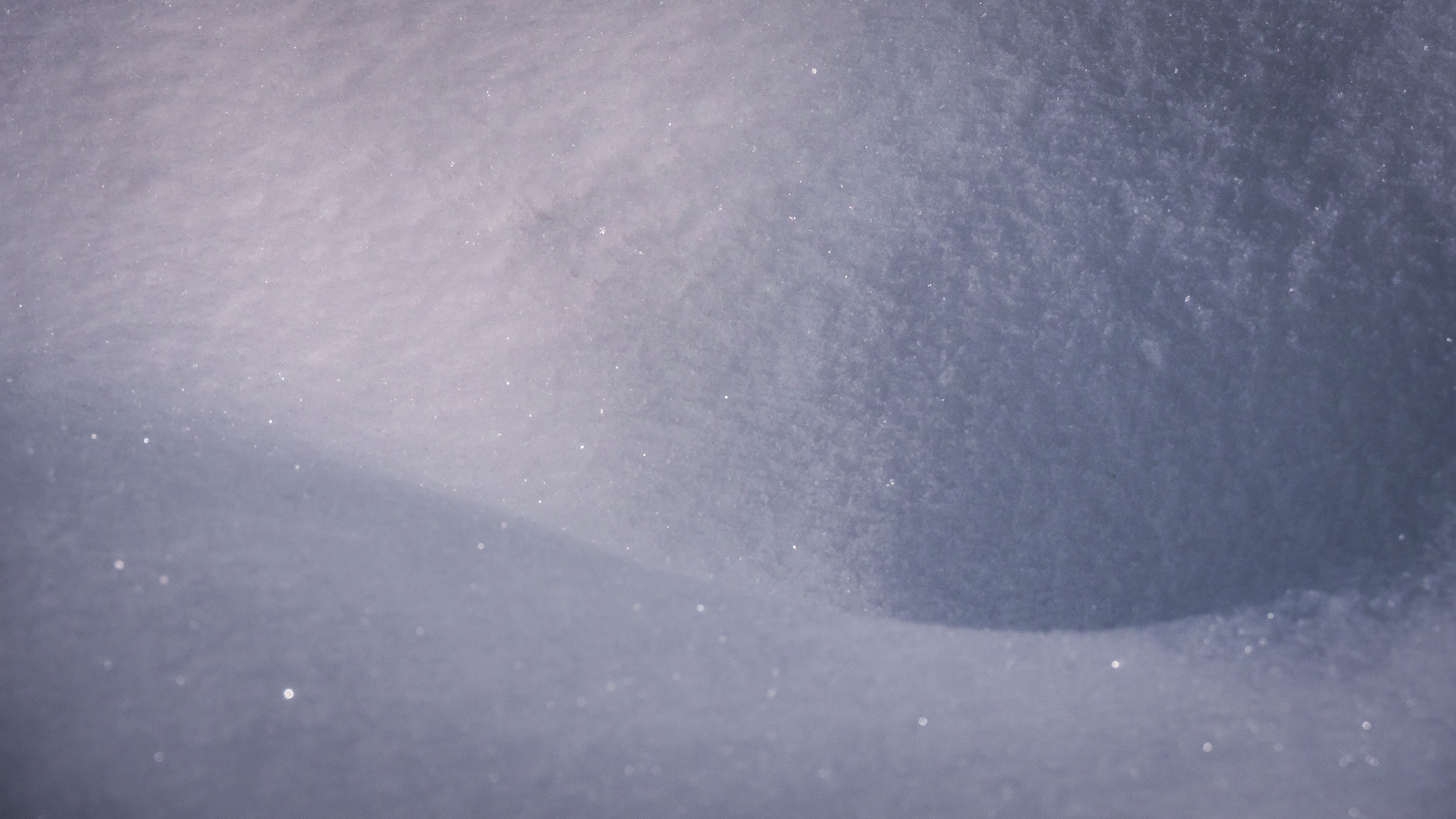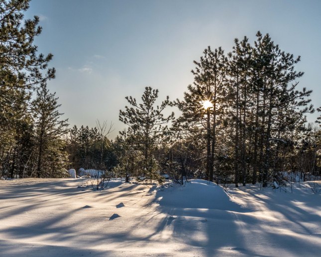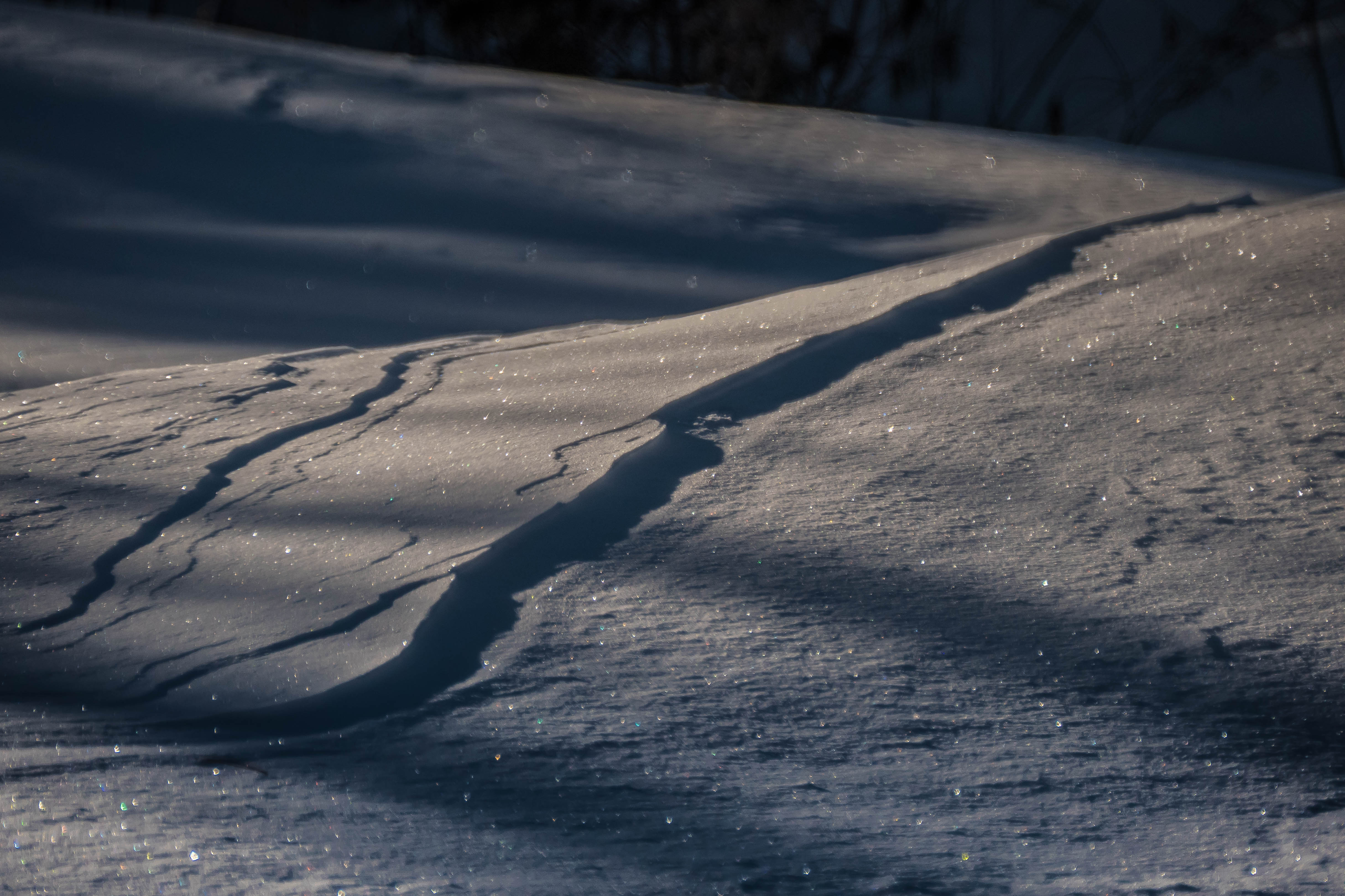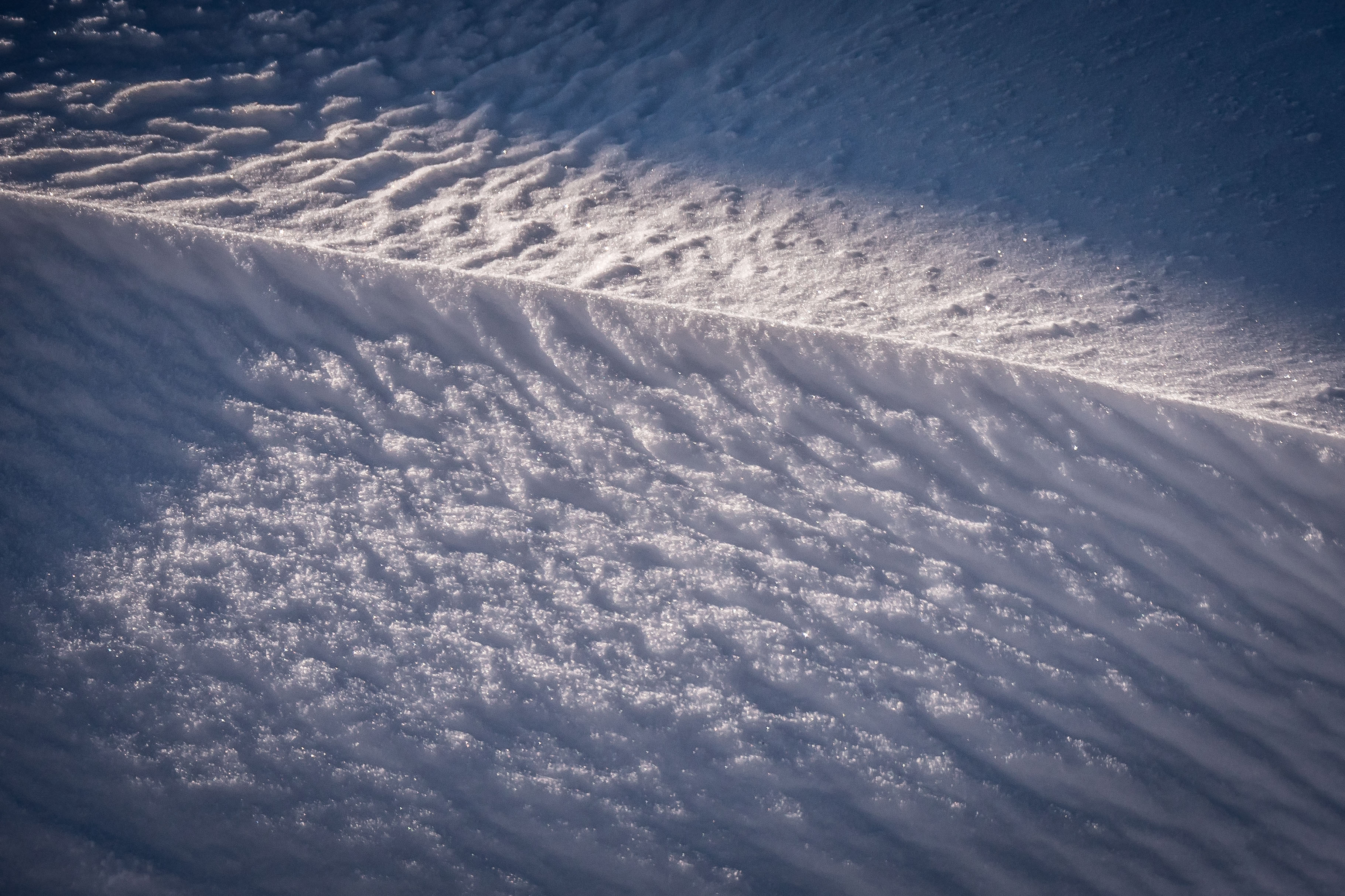 Sun is getting low on the horizon… giving the snow a pinkish glow while the shadows reflect the scattered sunlight of the blue sky above…