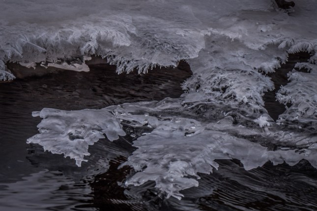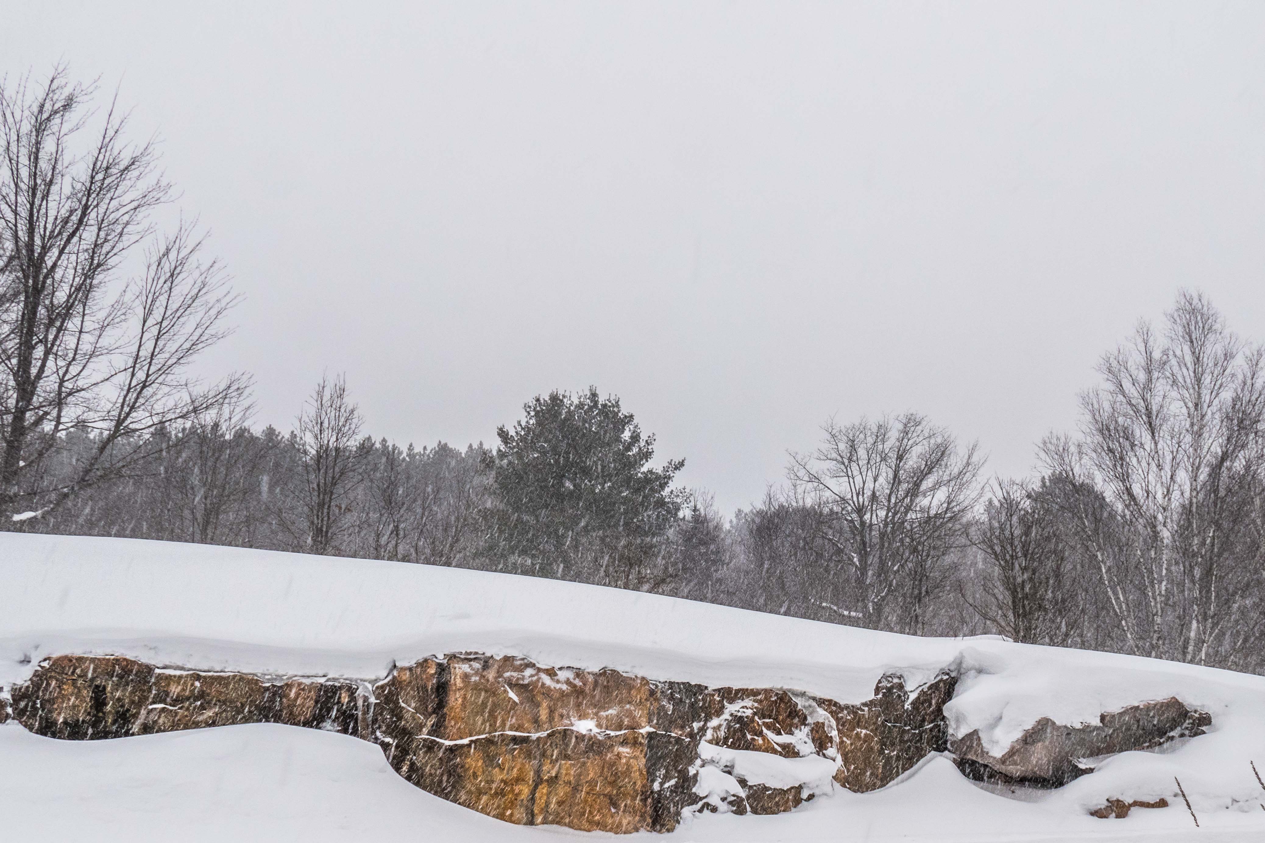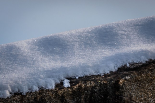 Well convoluted rocks show up well behind the negligee of falling snow …