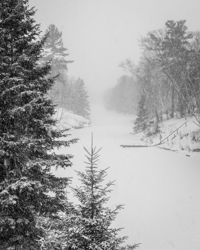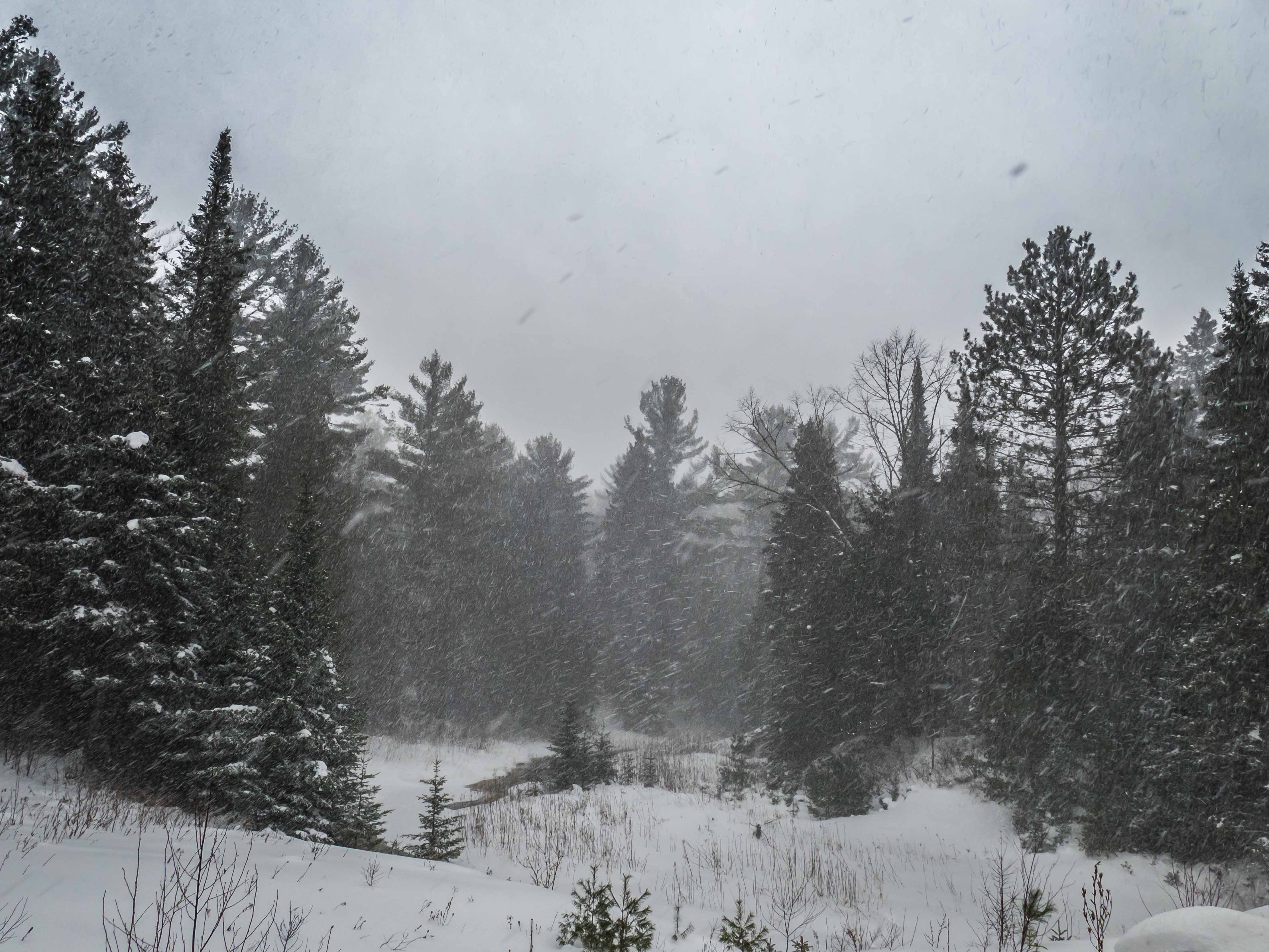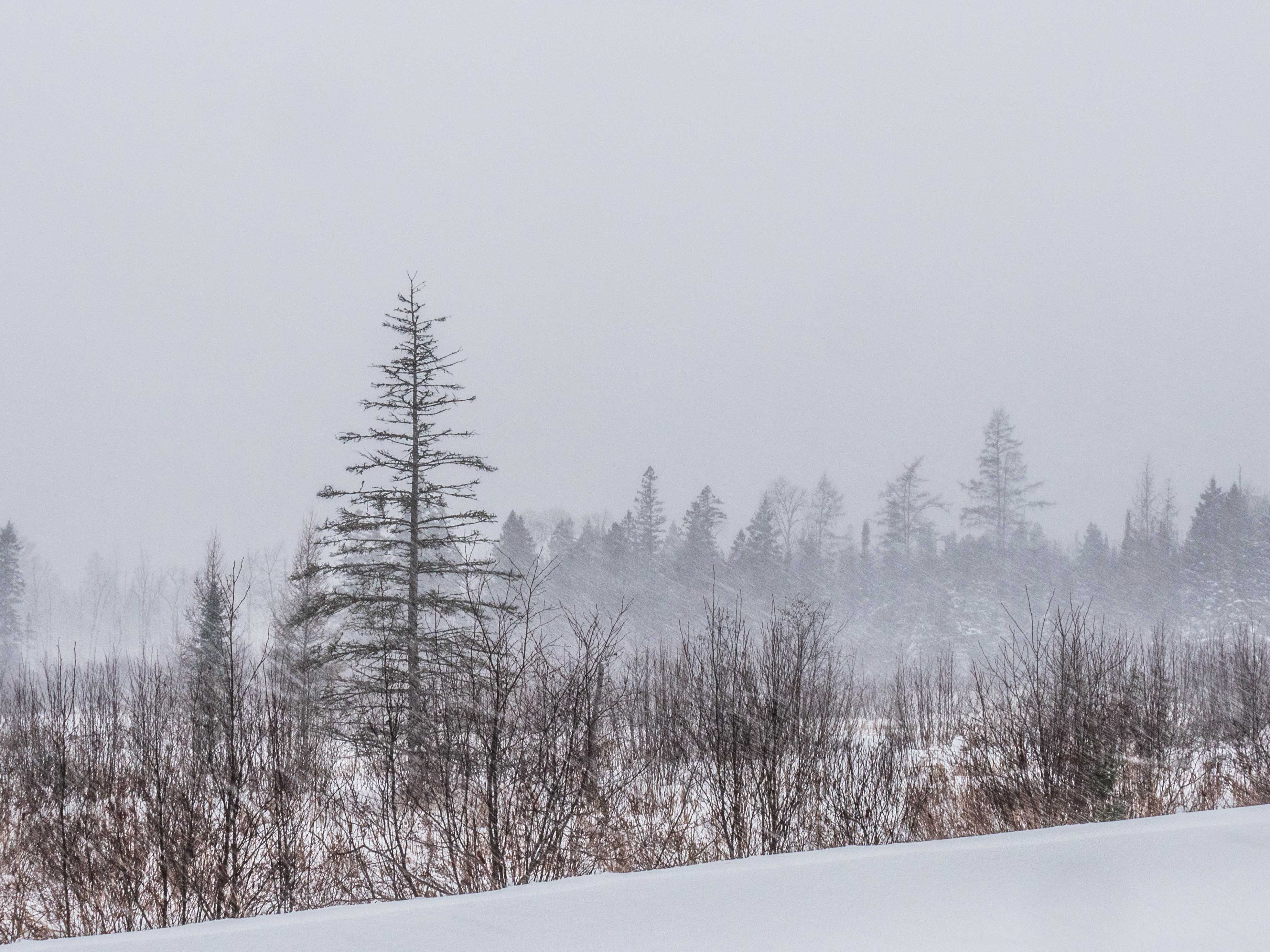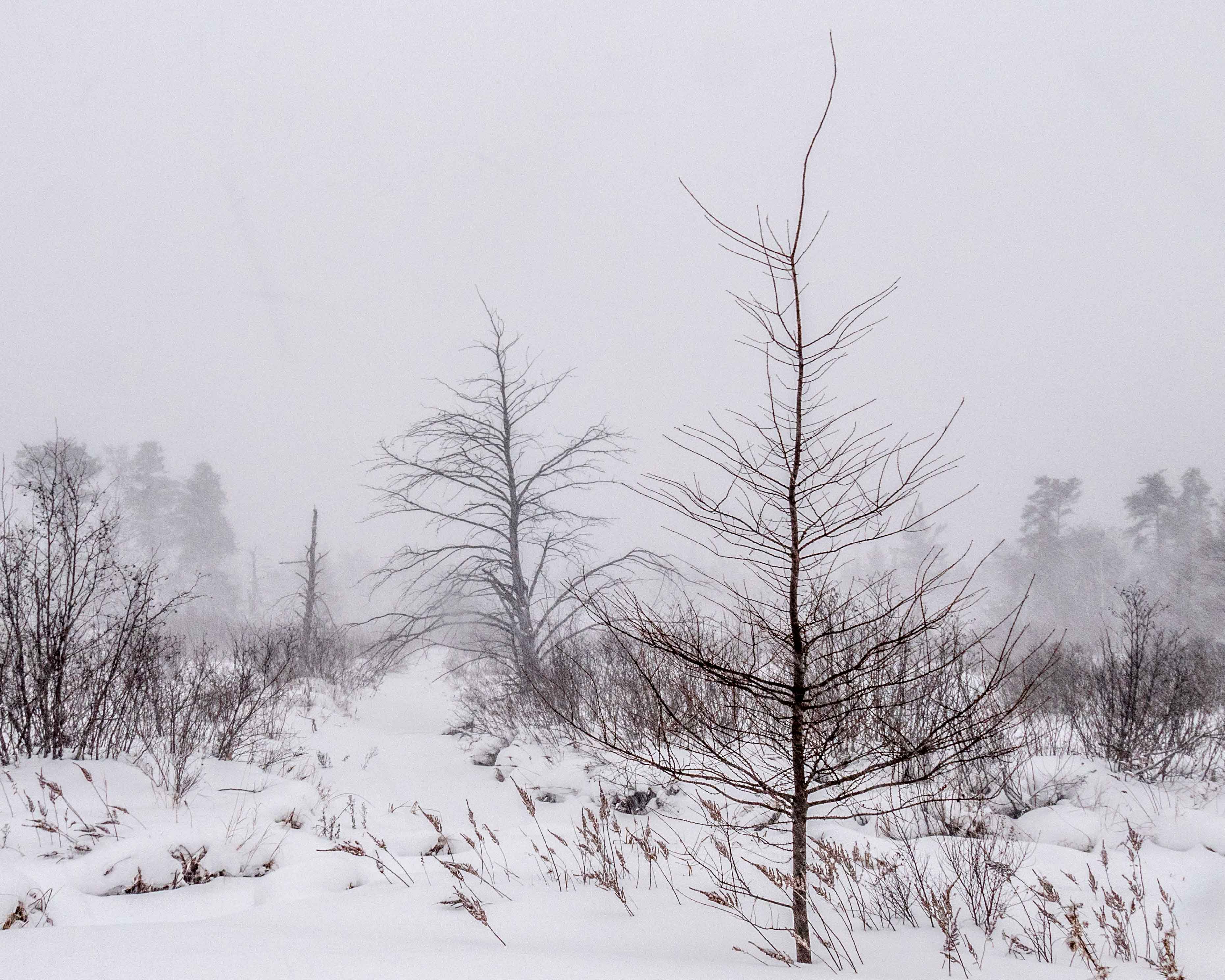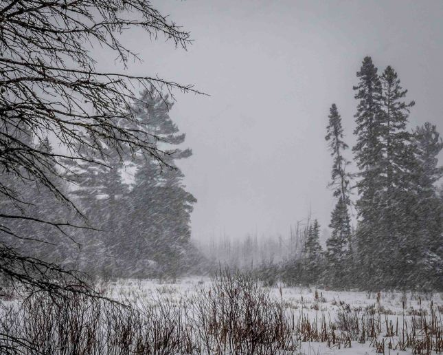 We practiced making pictures of falling snow, trying to capture the mood of the action. Focus mid-foreground. Longish shutter interval depending on windspeed driving the snow. Capture as much light as possible. I try to use ETTR generally.
