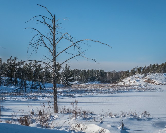 Typical sight along Hwy 529 … Tamaracks, Tag Alders, a dead Jack pine and distant White pines.