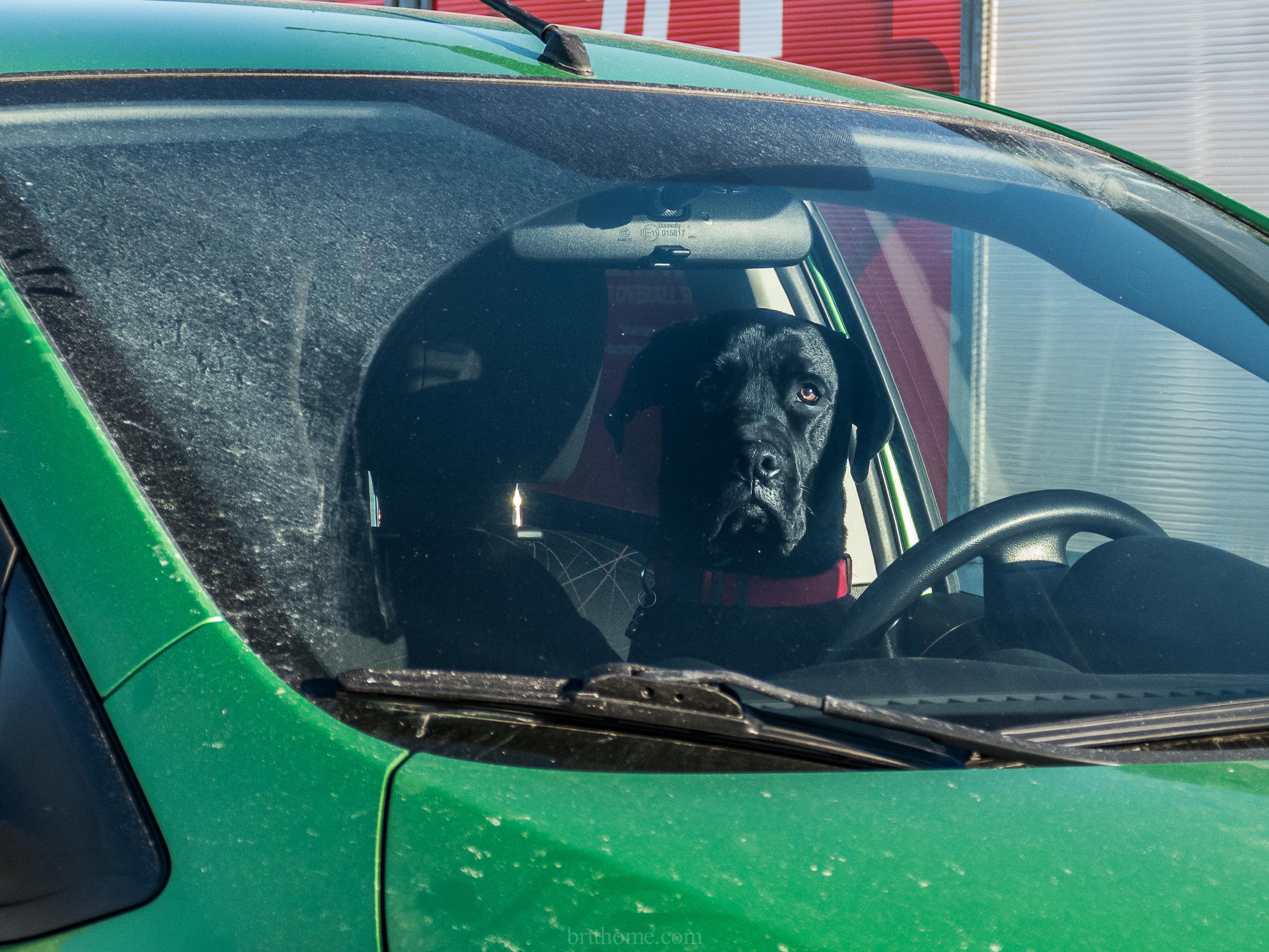 Black labrador assumes the position whilst guarding the car …