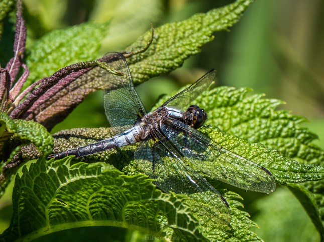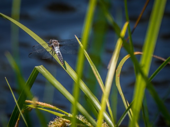 A Four-spotted Skimmer (Chaser in the UK) perched on a stick. Difficult to ID from this photograph but the abdomen, wing spots and colour match the ID criteria.