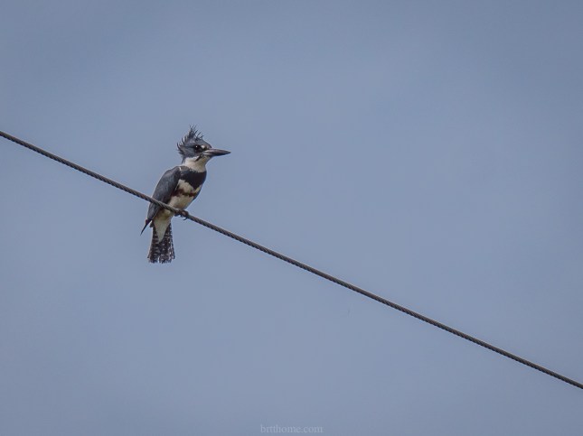 This female Belted Kingfisher and it mate were warily hanging around the Aspen trees and utility wires near the water at “George’s Last Resort” for about two weeks. This lady had her hairdo ruffled as she perched facing downwind….