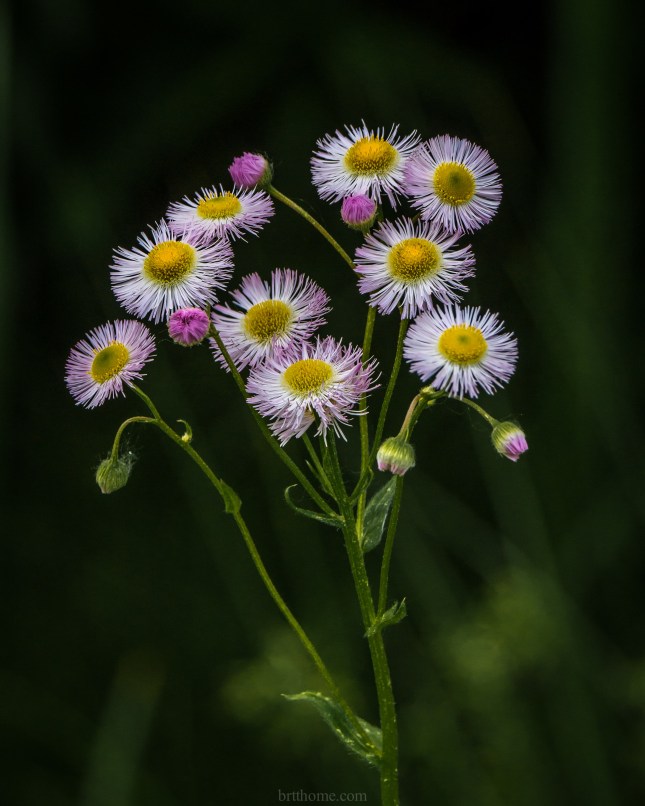 A cluster of Daisy Fleabane in the sunlight against the shadow of deep bush…