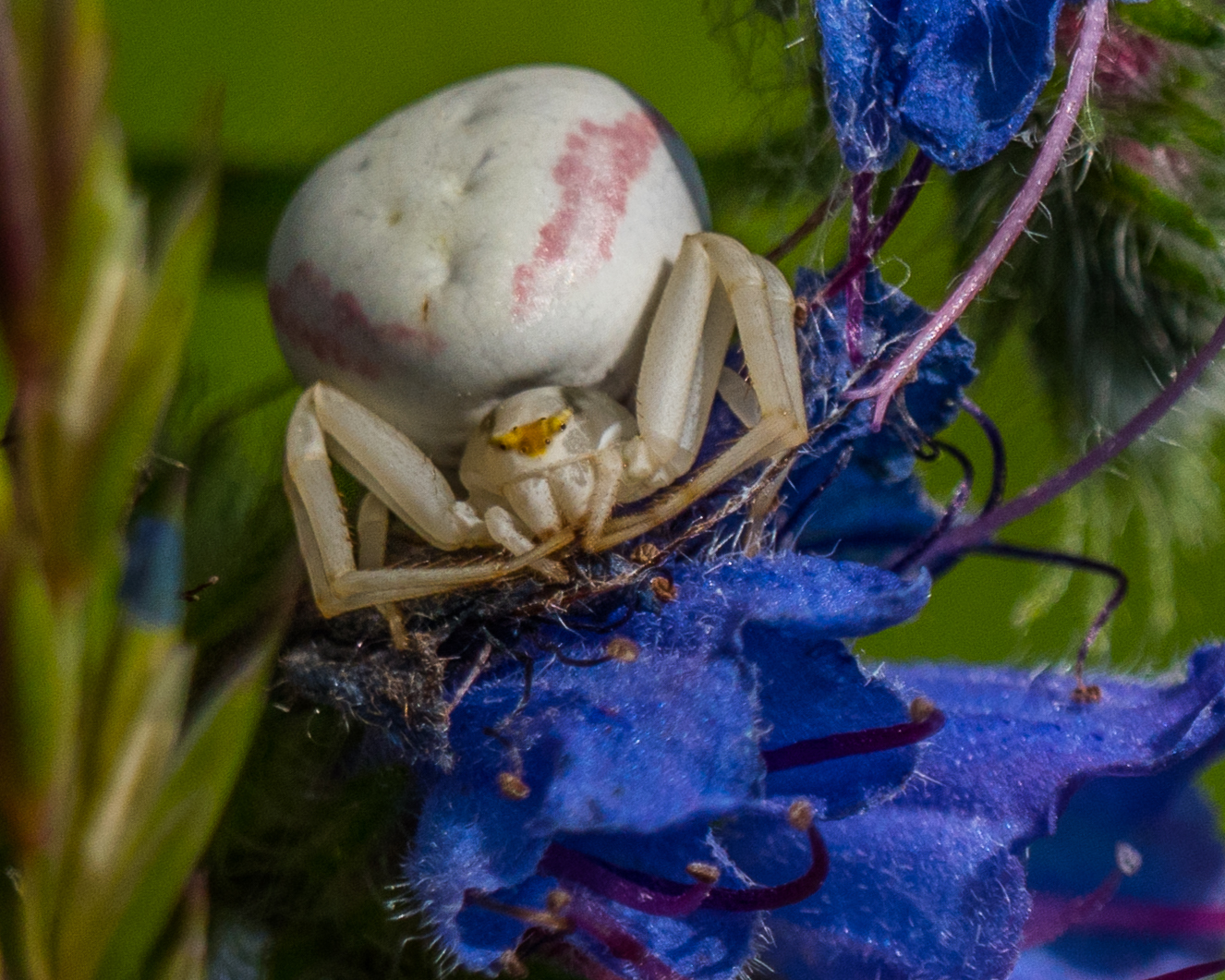 First time seen: A white crab spider perched in a Viper’s Bugloss…